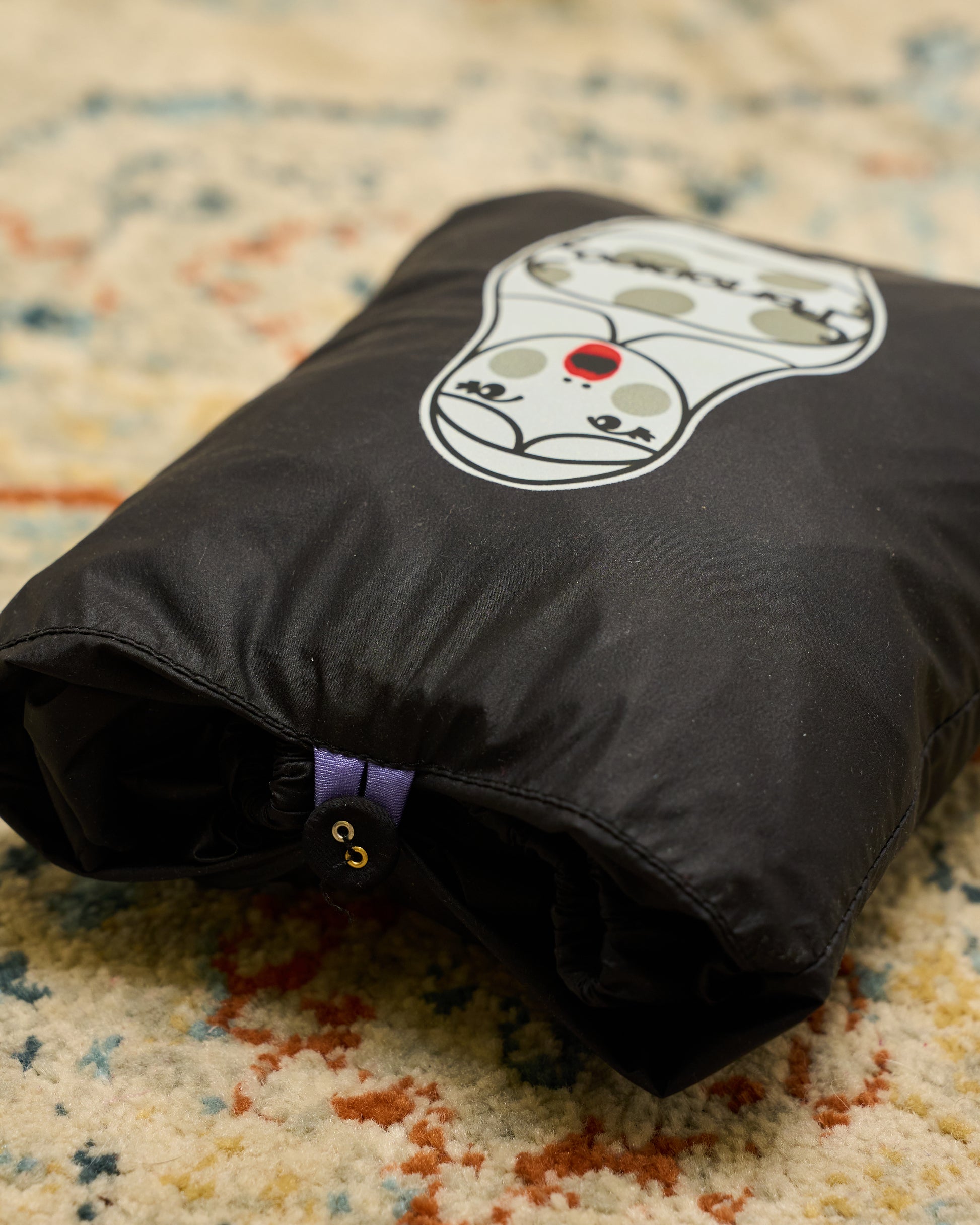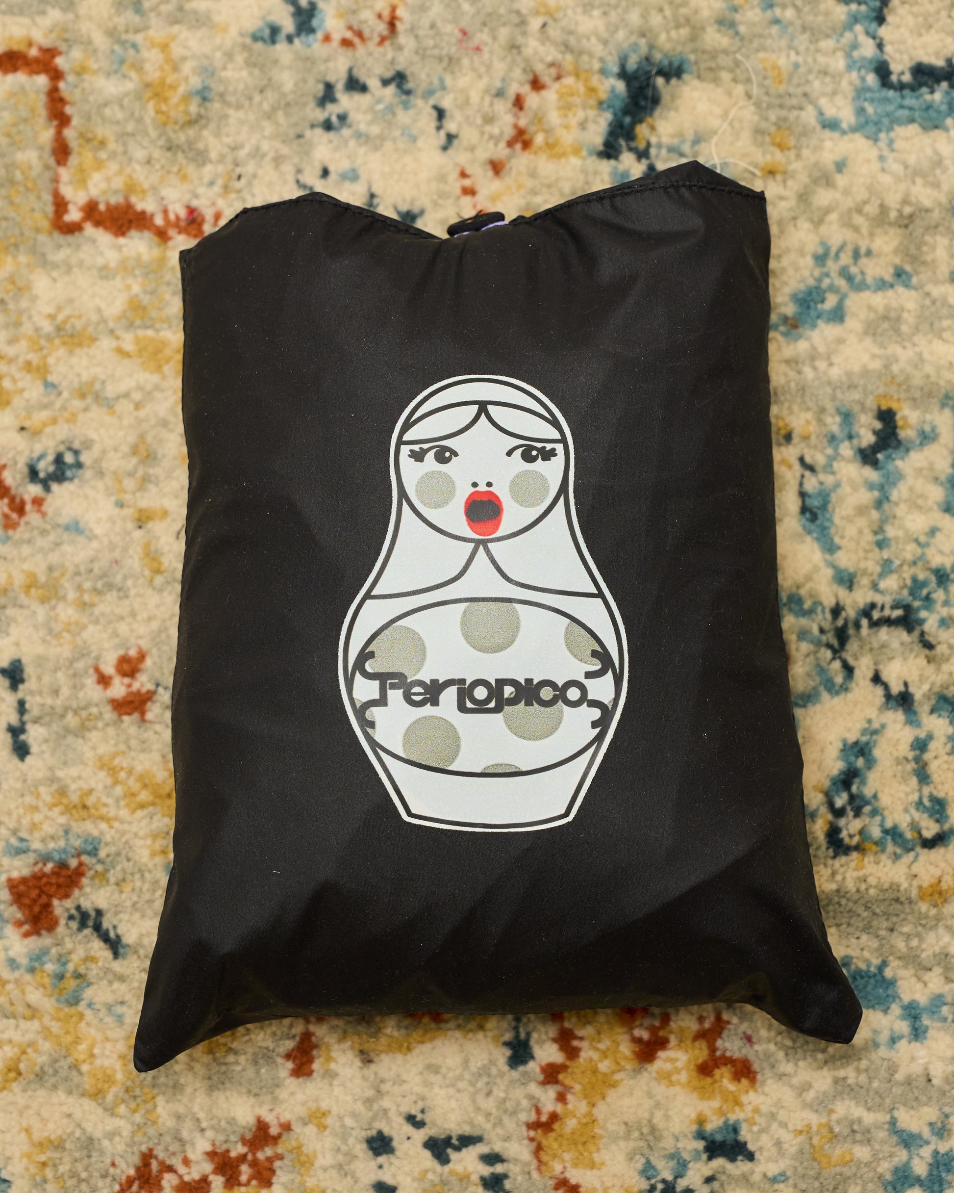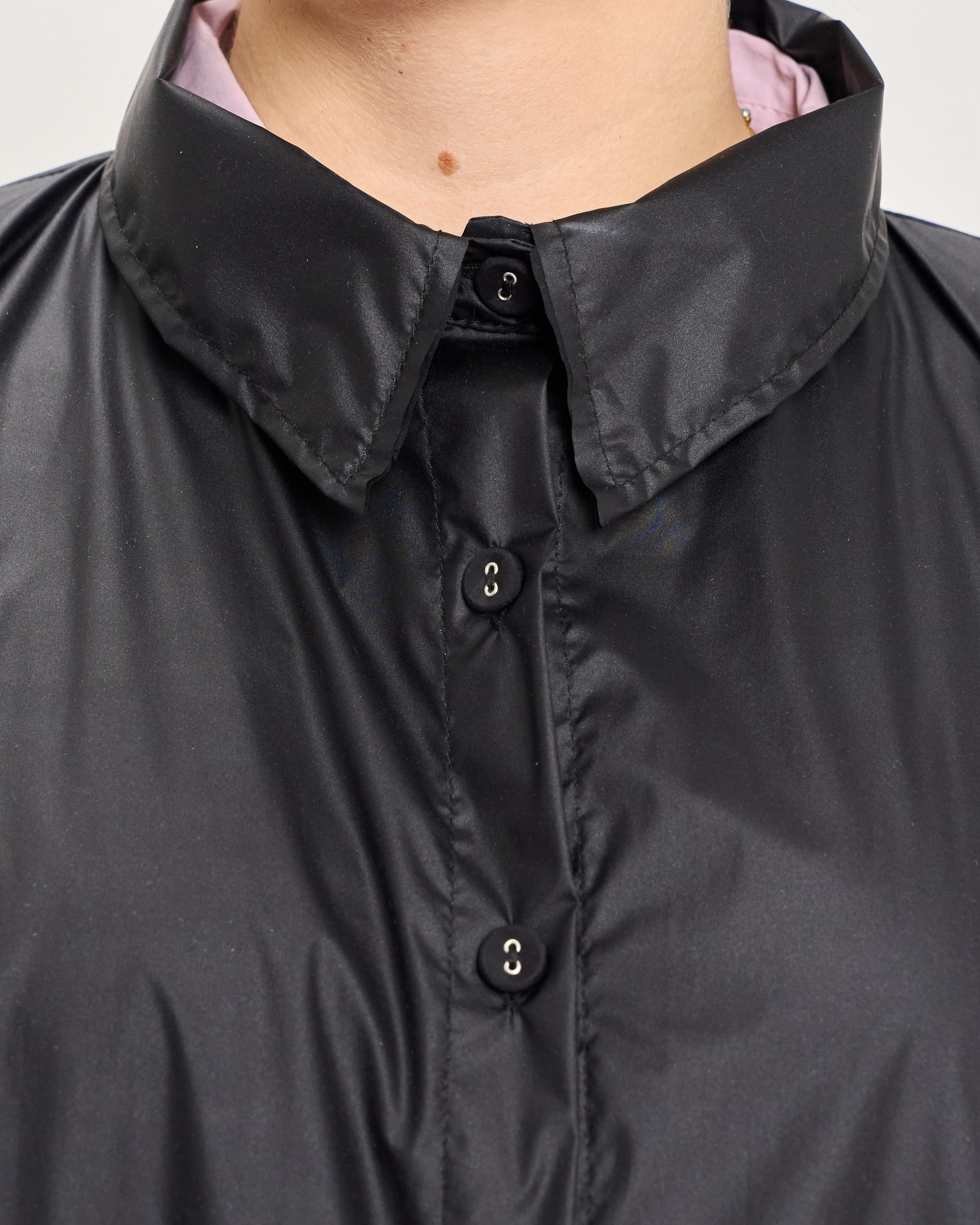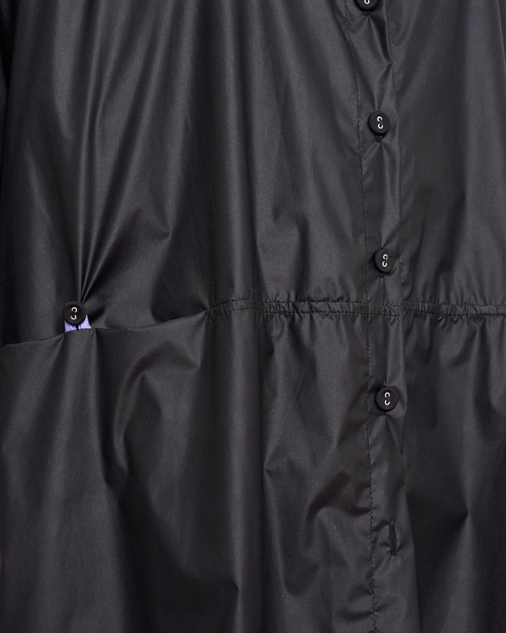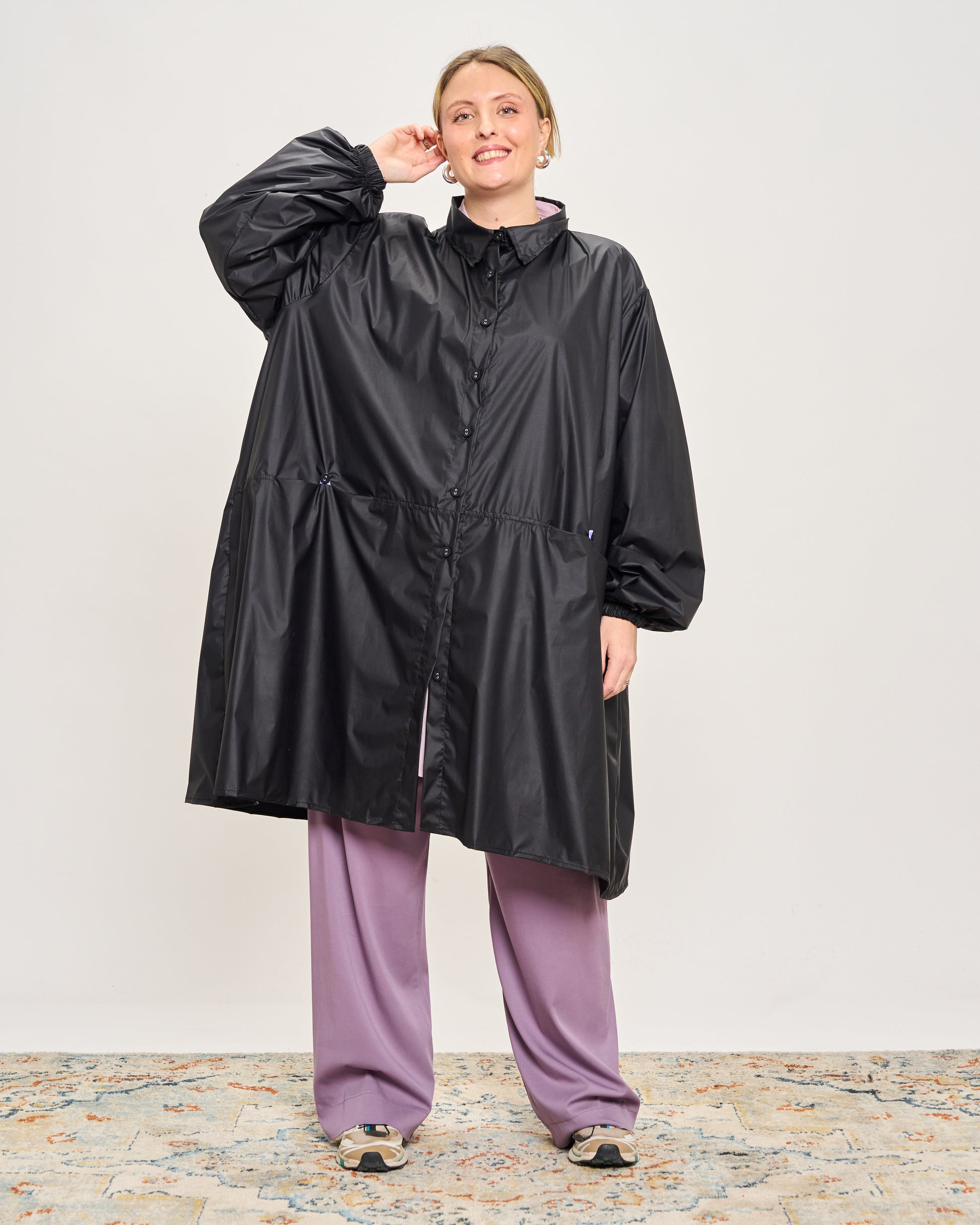 Waterproof oversized windbreaker shirt with long sleeves, elasticated cuffs, and welt pockets on the front. The shirt easily folds into one of the front pockets, transforming into a practical and lightweight pouch, perfect to carry in your bag at all times.
