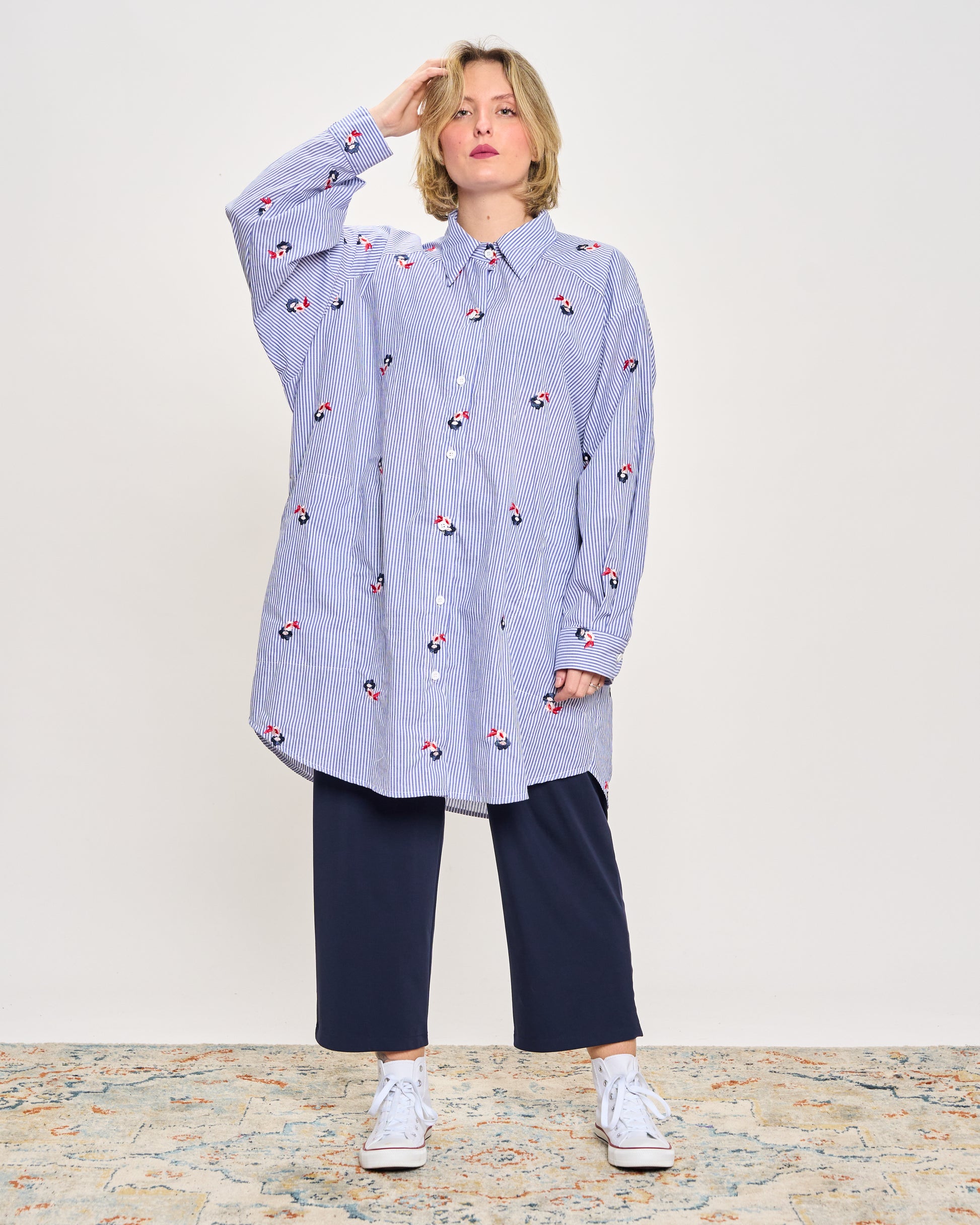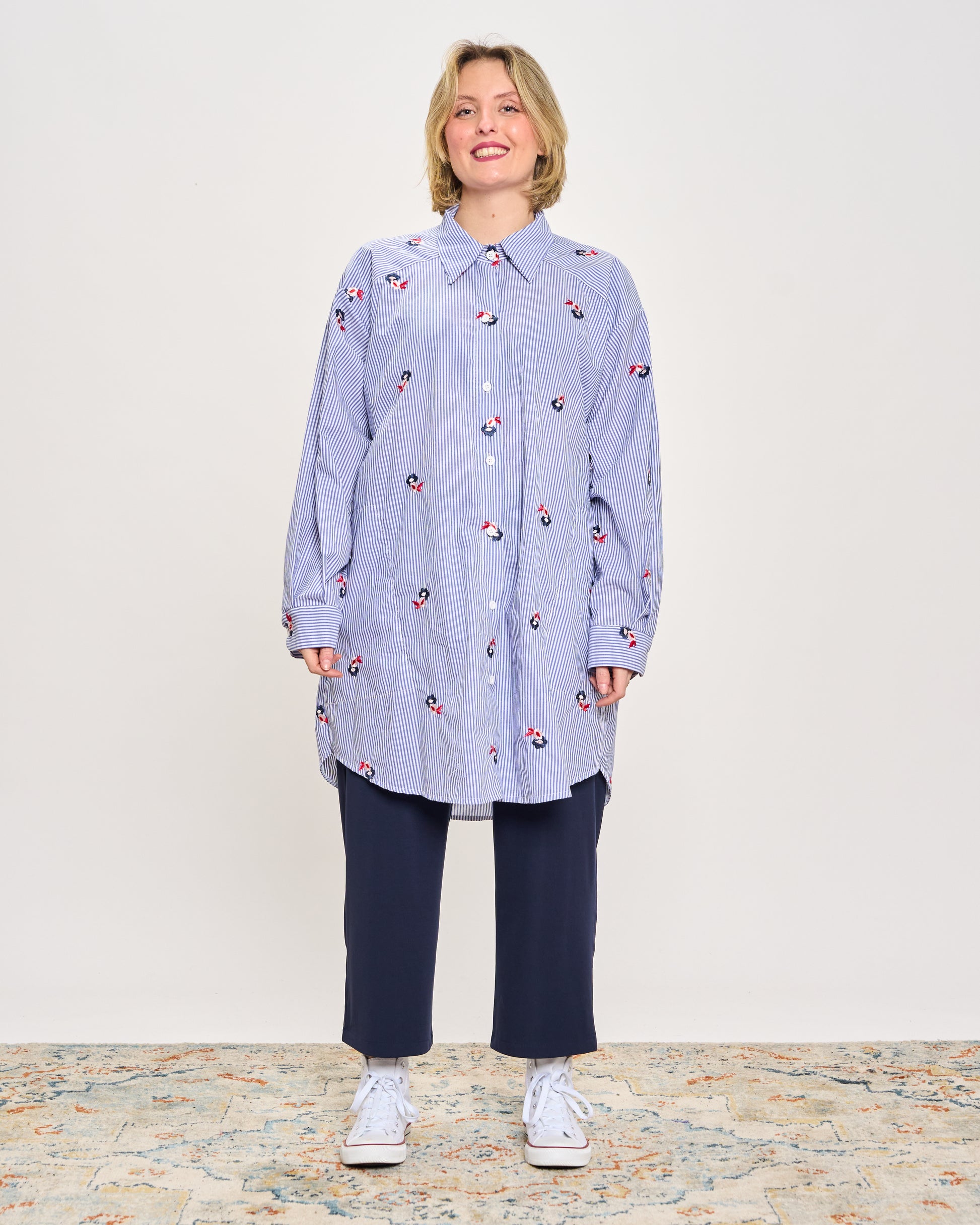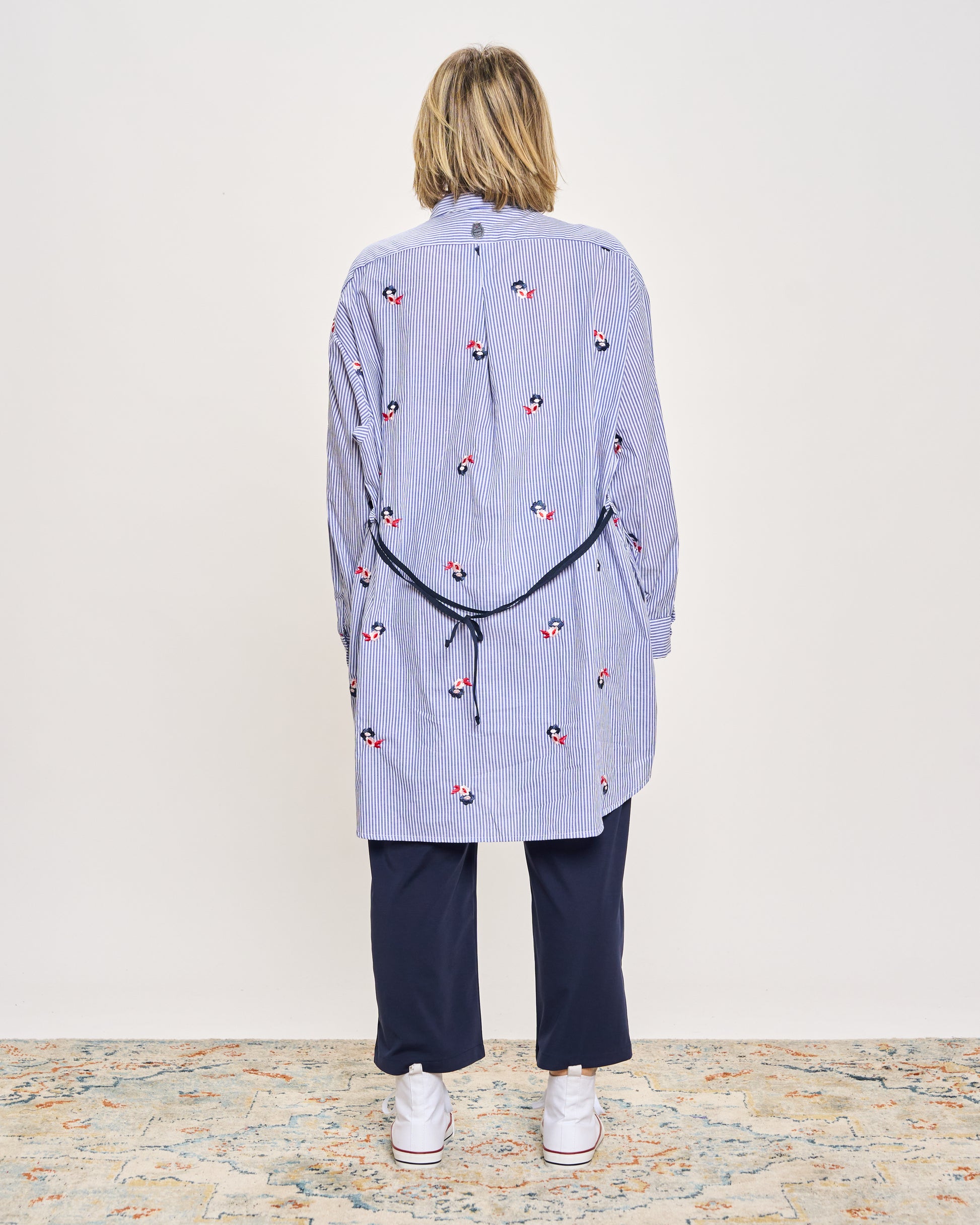 Oversized striped cotton shirt with floral embroidery, drawstring at the back, belt loops at the waist, button fastening at the front, side pockets and cuffed sleeves.