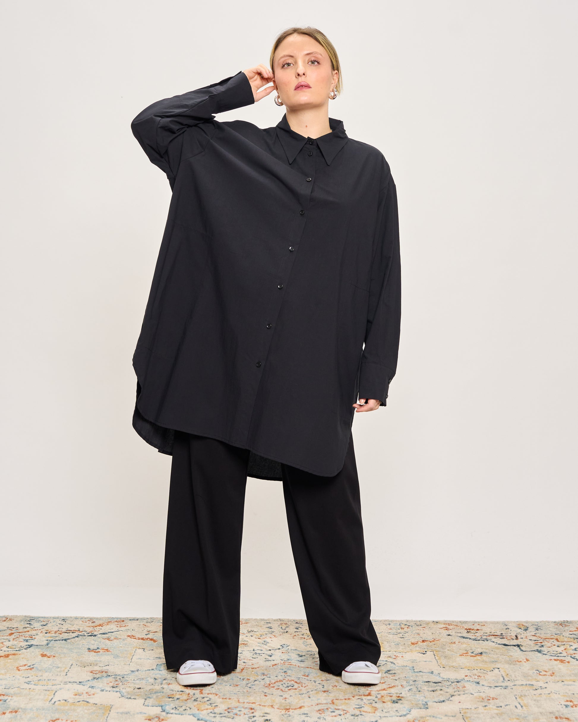 Oversized washed cotton poplin shirt with front button fastening, side pockets, and cuffed sleeves.