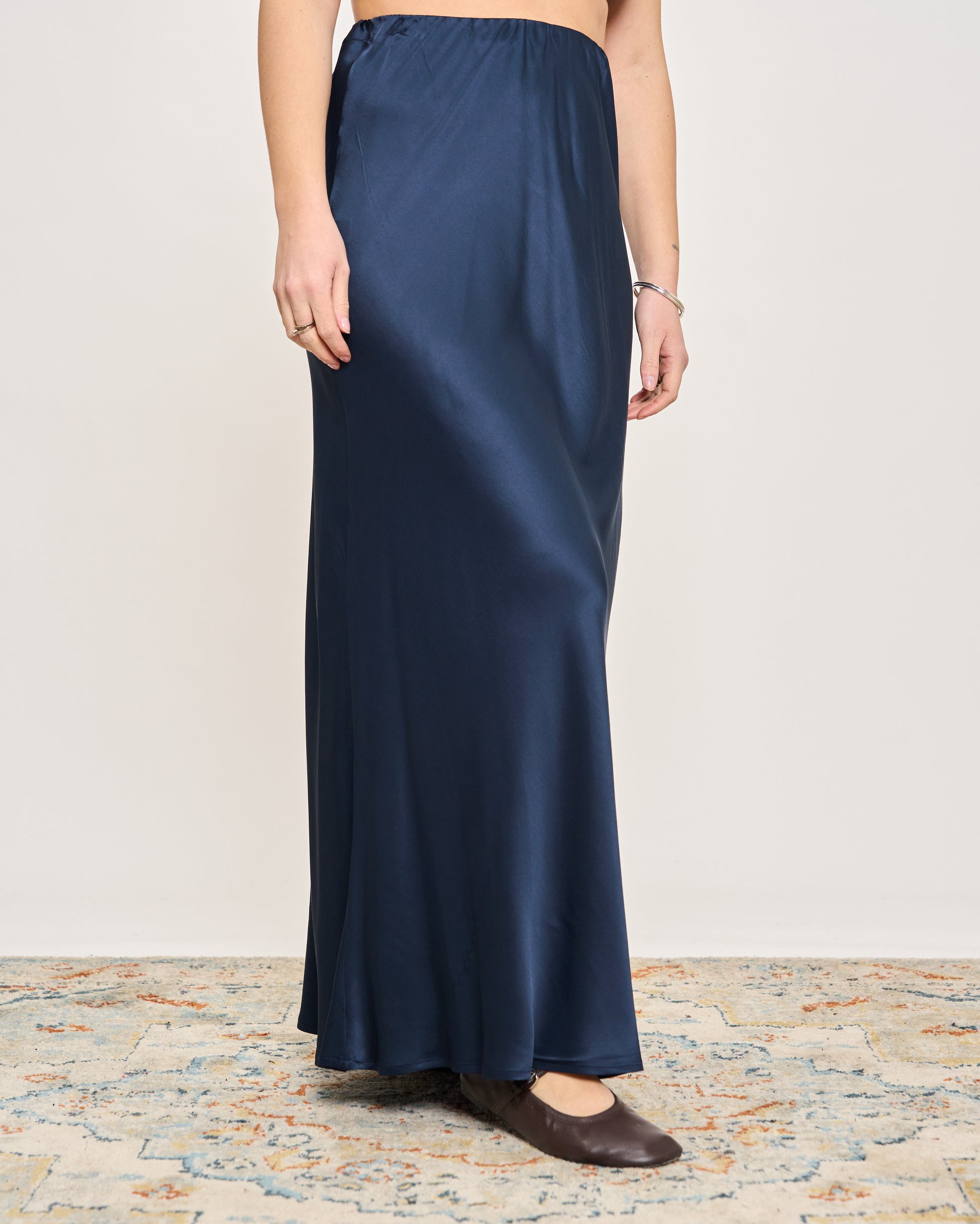 Viscose satin skirt with elastic waistband and bottom hem.