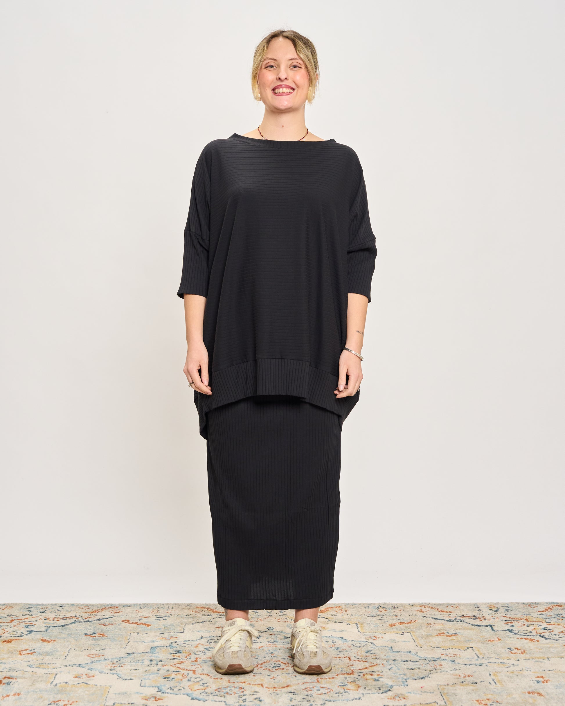 Ribbed viscose jersey top with boxy 3/4 sleeves, round neck and ruffle hem.