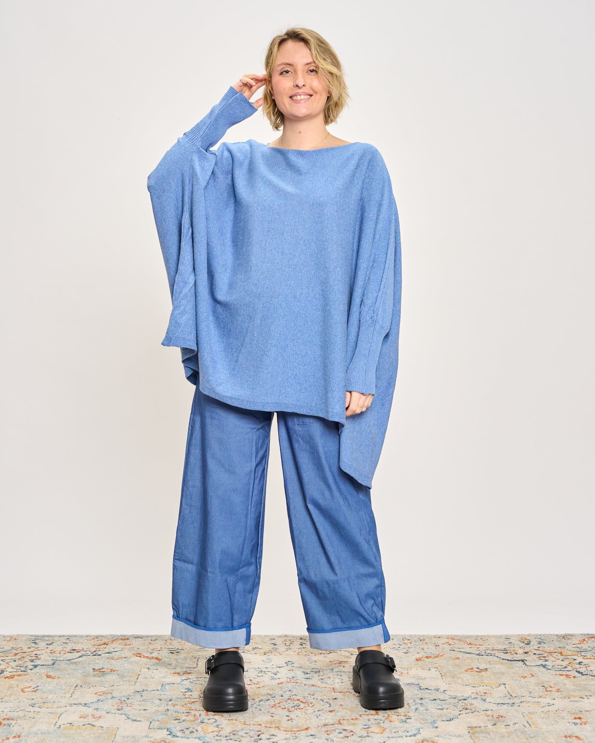 Maxi boxy blouse with a great fit in a cotton-blend knitwear with a boat neckline and ribbed sleeves.