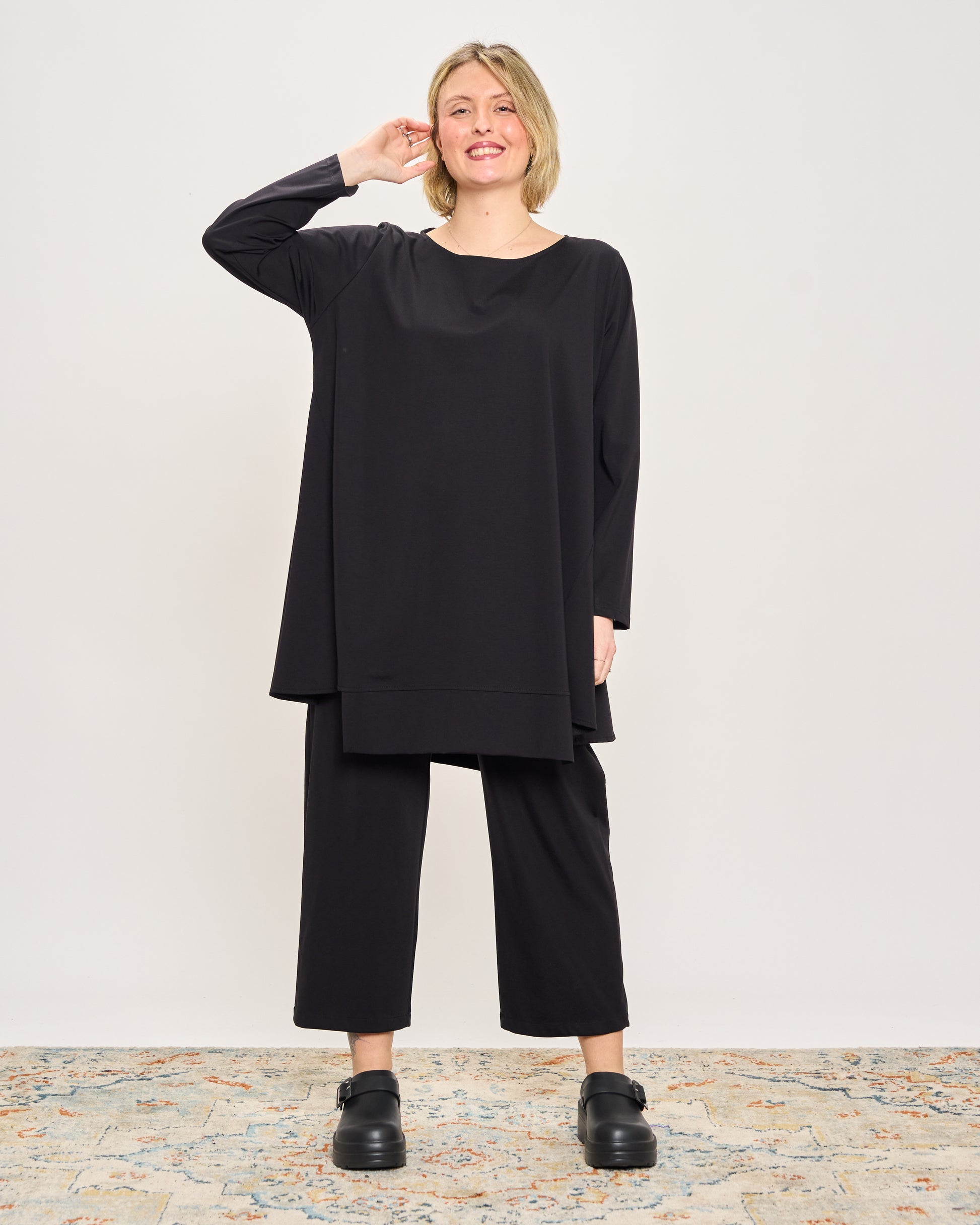 Maxi flared sweater in stretch poly viscose with side seams, long sleeves and staggered hem.