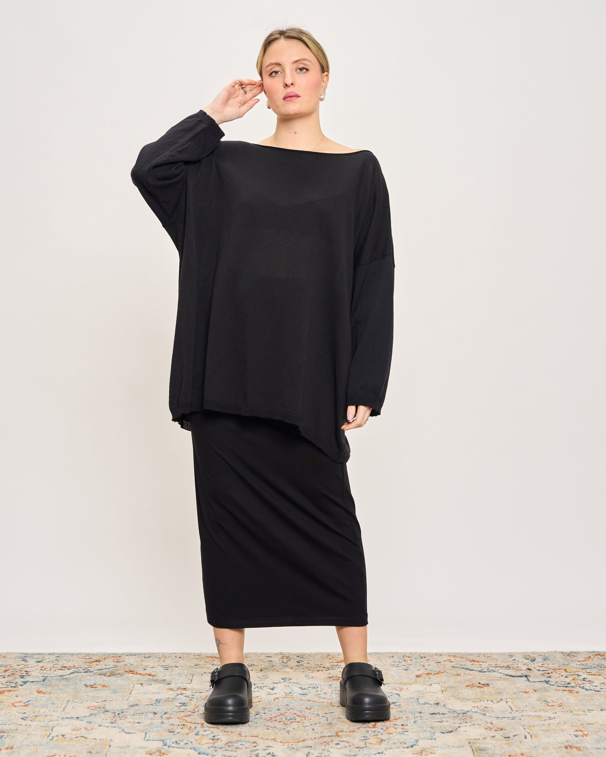 Oversized boxy cotton knit sweater with a boat neck and ribbed cuffs and hem.
