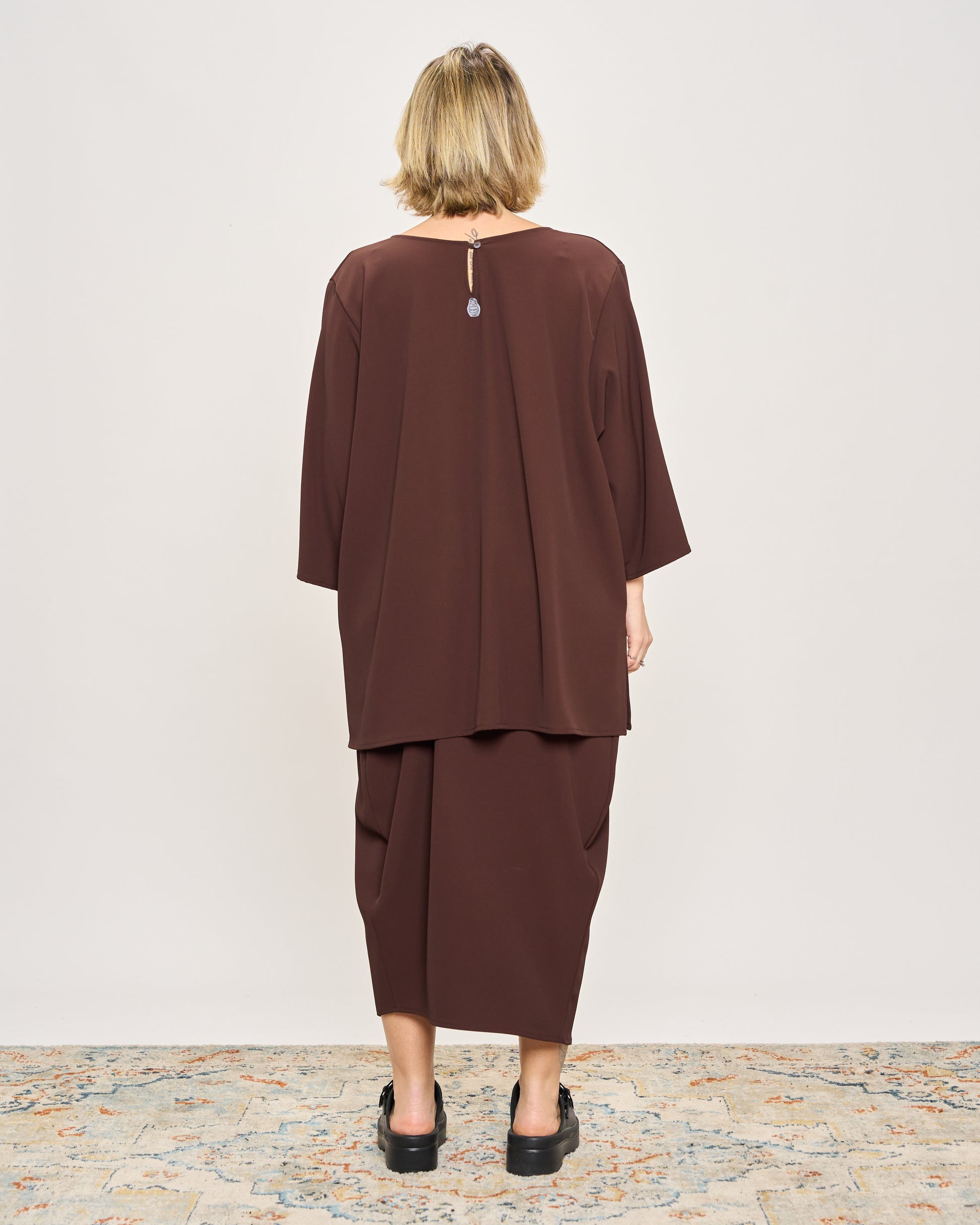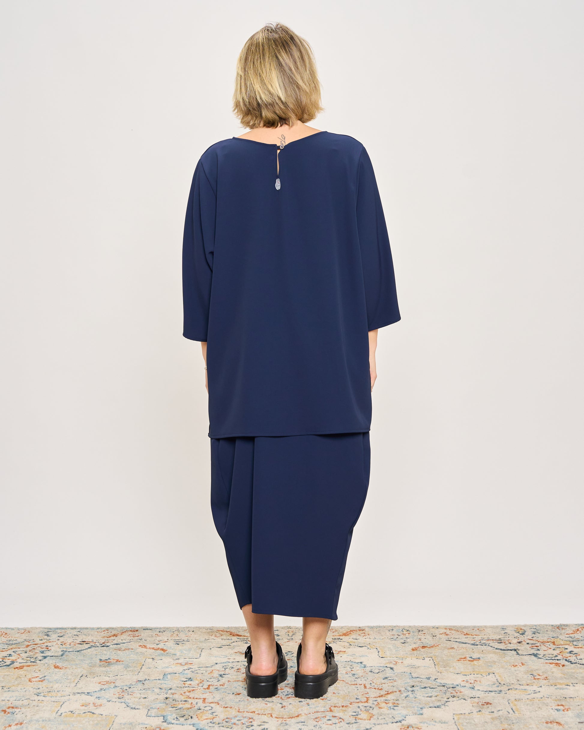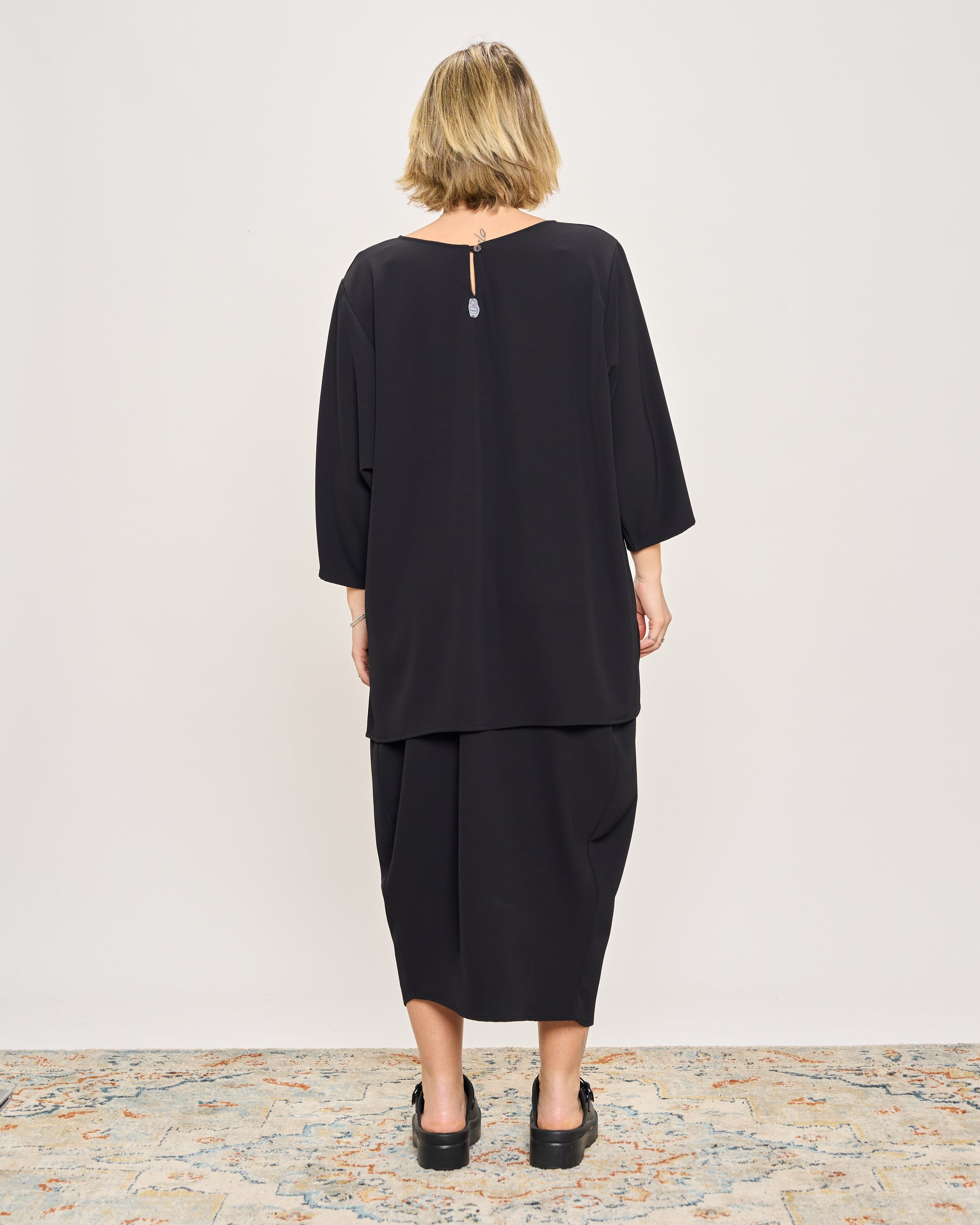Maxi t-shirt in stretch cady with buttoning on the back, 3/4 sleeves, slit on the armhole and on the sides.