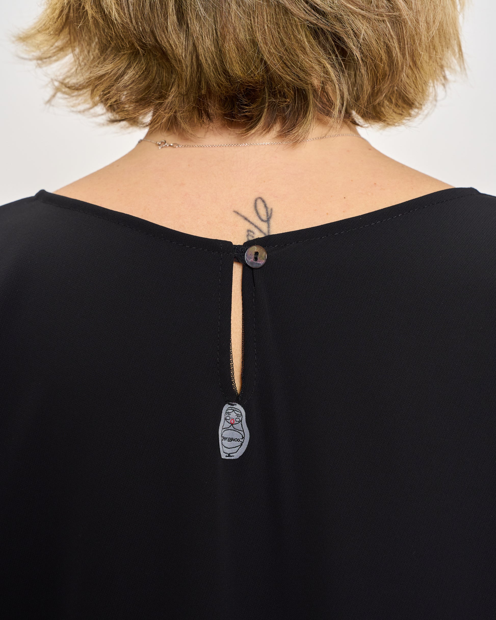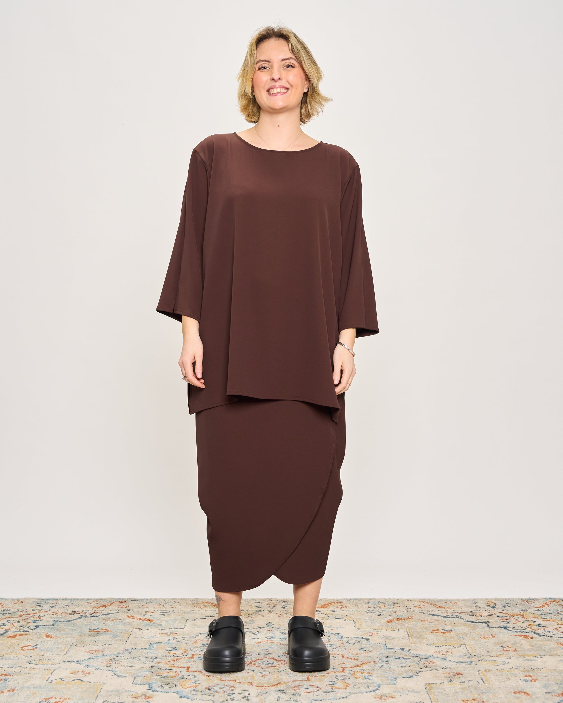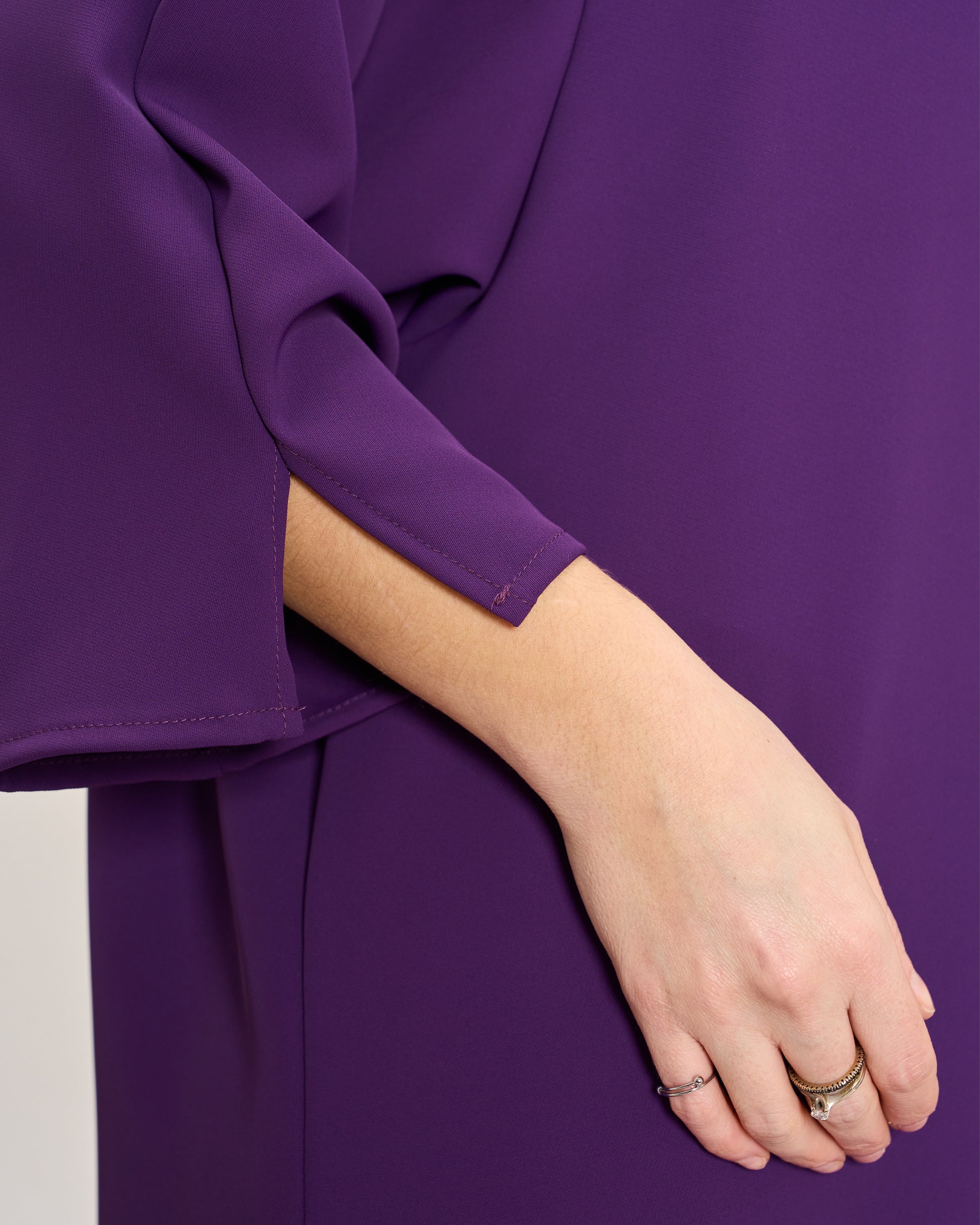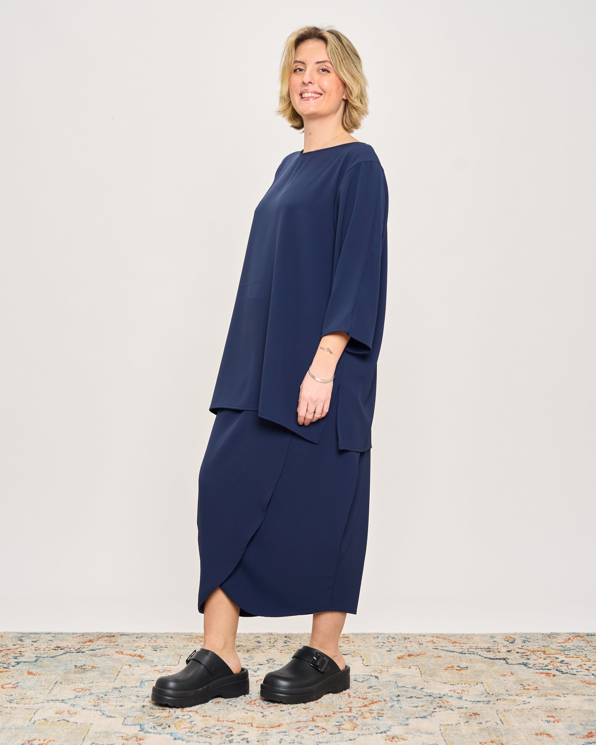 Maxi t-shirt in stretch cady with buttoning on the back, 3/4 sleeves, slit on the armhole and on the sides.