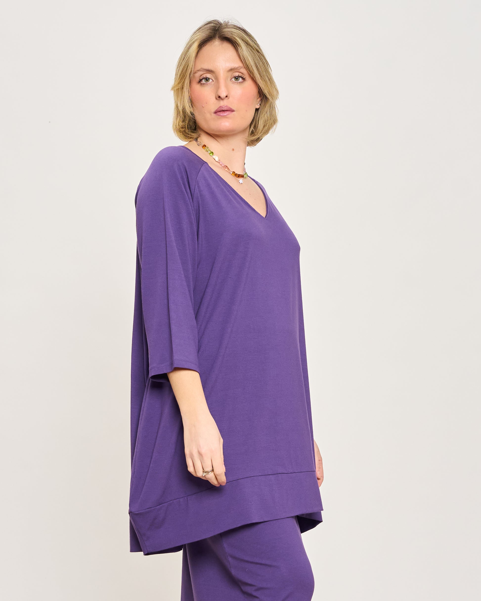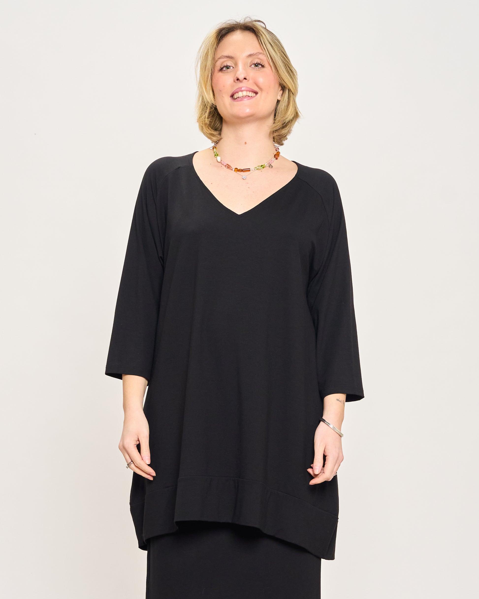 Maxi sweater in stretch viscose with V-neck, 3/4 sleeves and flounce at the bottom.