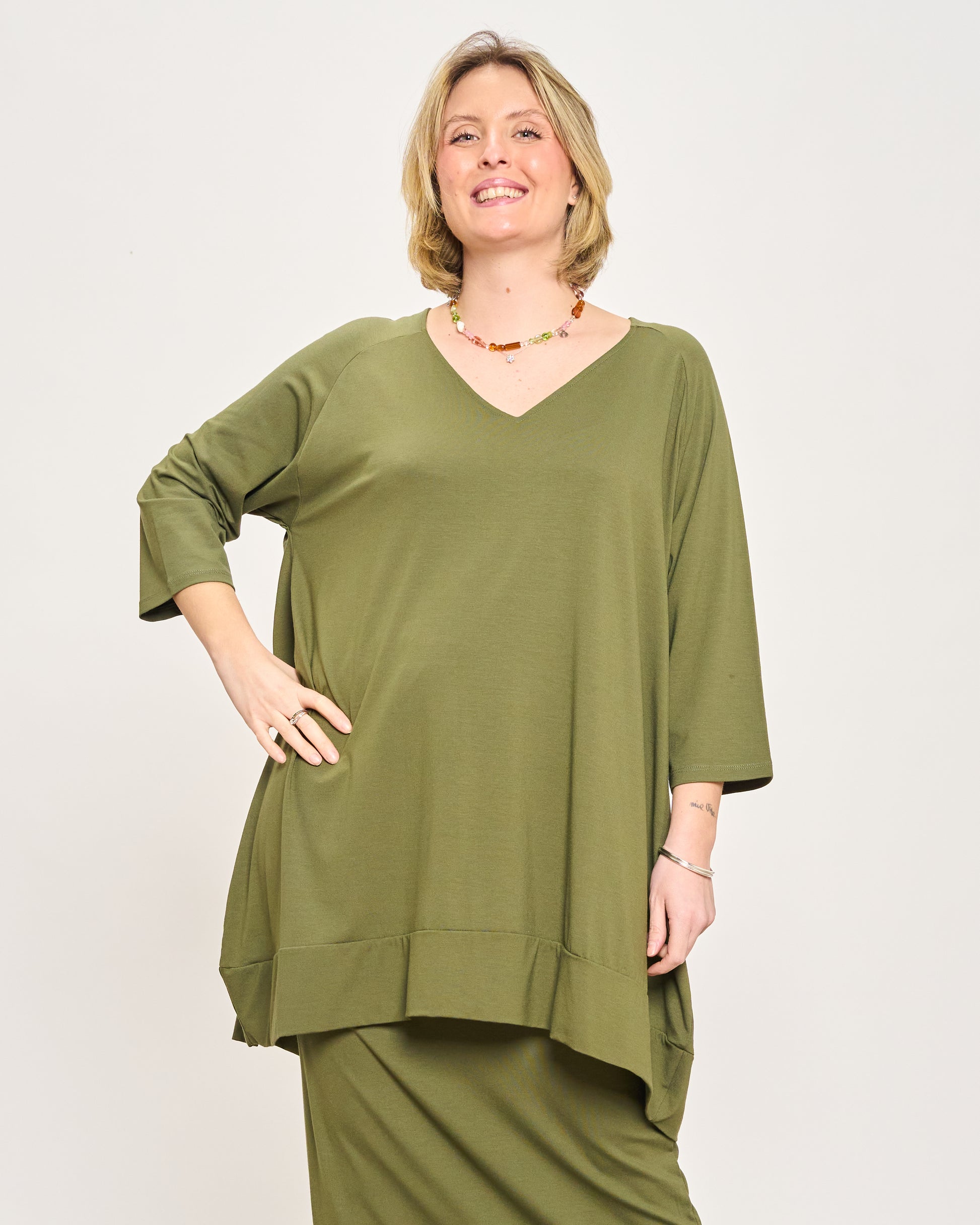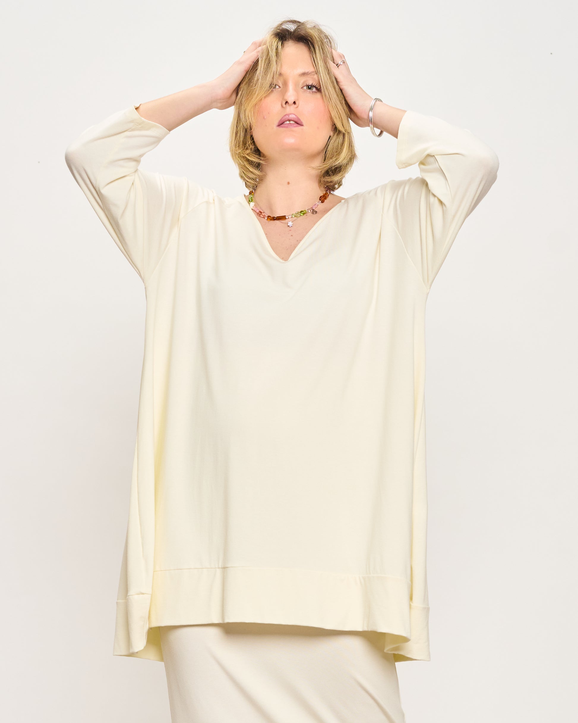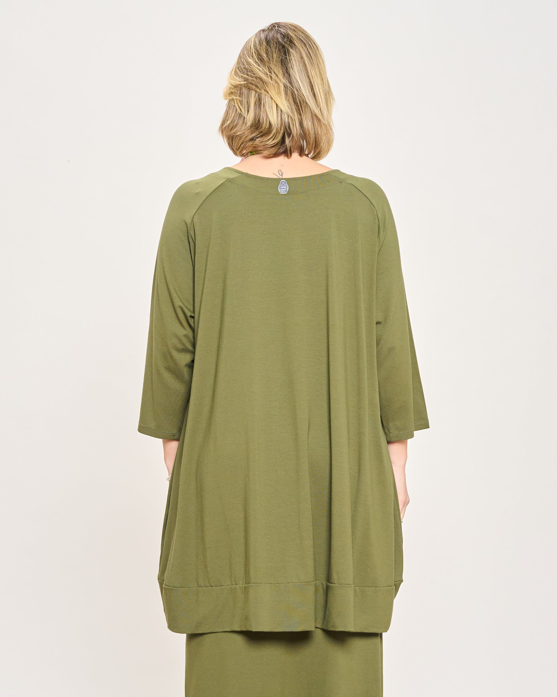 The model is 165 cm tall and wears size M Measures: M: 120 cm bust circumference - 150 cm hips circumference - 81 cm front length - 90 cm back length - 40 cm armhole L: 130 cm bust circumference - 160 cm hips circumference - 81 cm front length - 90 cm back length - 50 cm armhole XL: 145 cm bust circumference - 170 cm hips circumference - 81 cm front length - 90 cm back length - 60 cm armhole