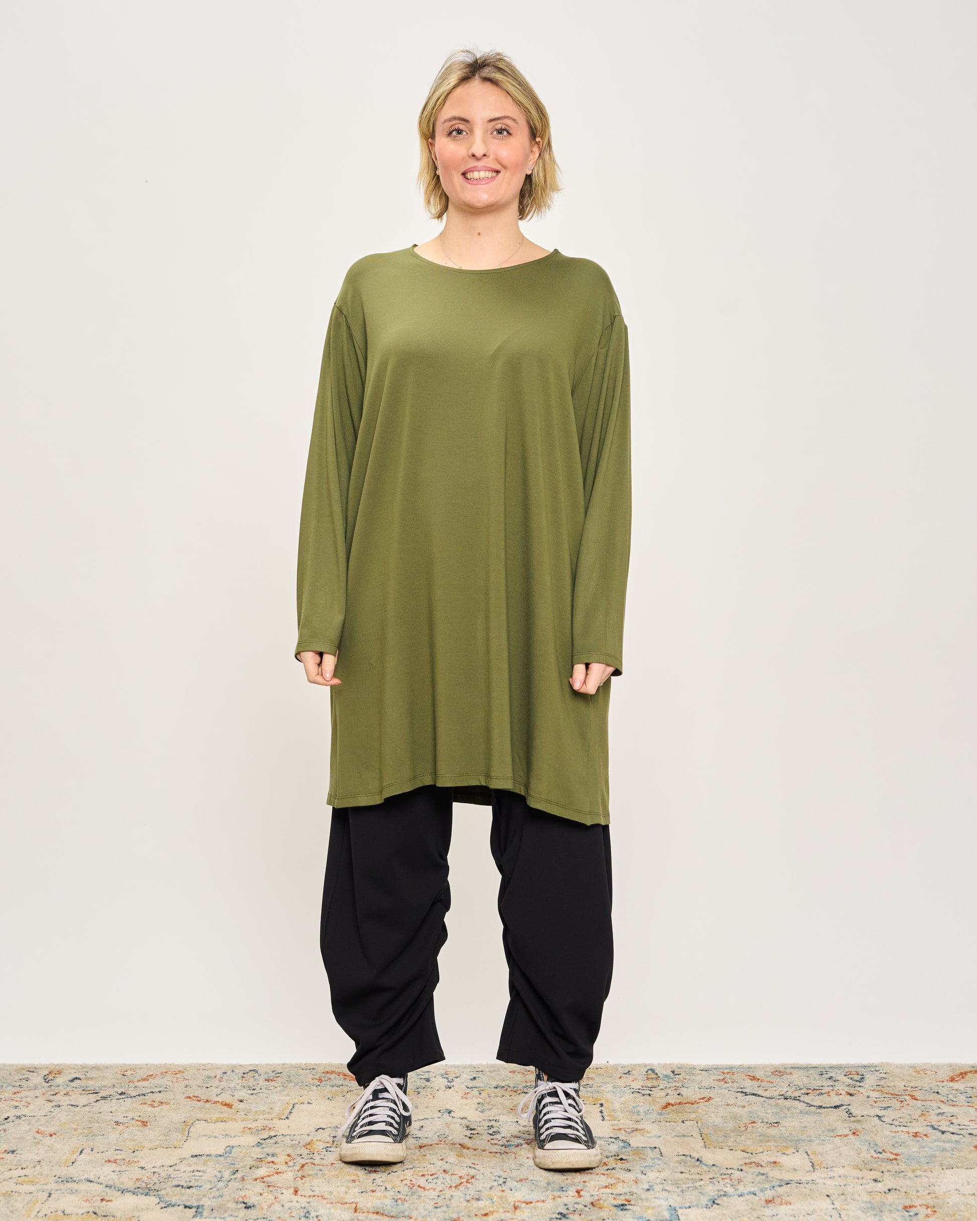 Oversized long viscose T-shirt with round neck and long sleeves.