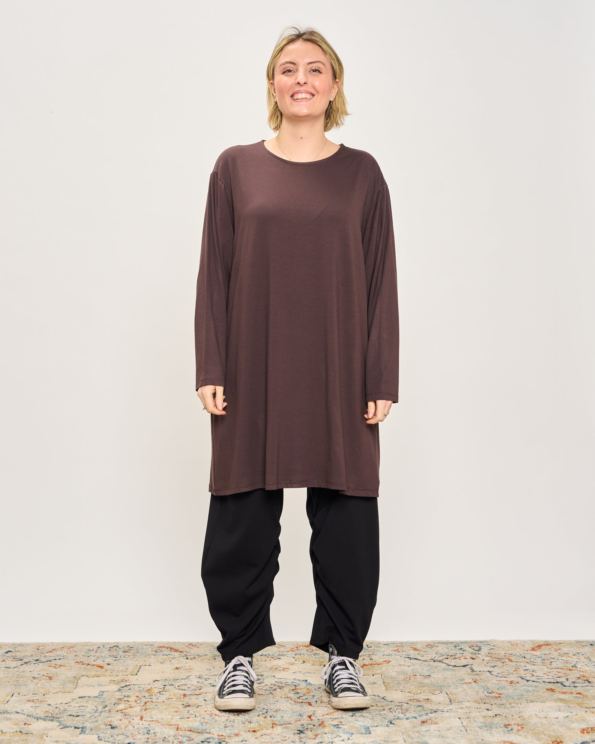 Oversized long viscose T-shirt with round neck and long sleeves.