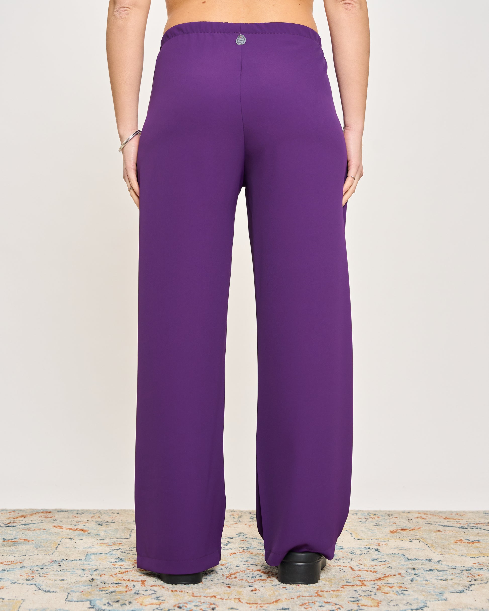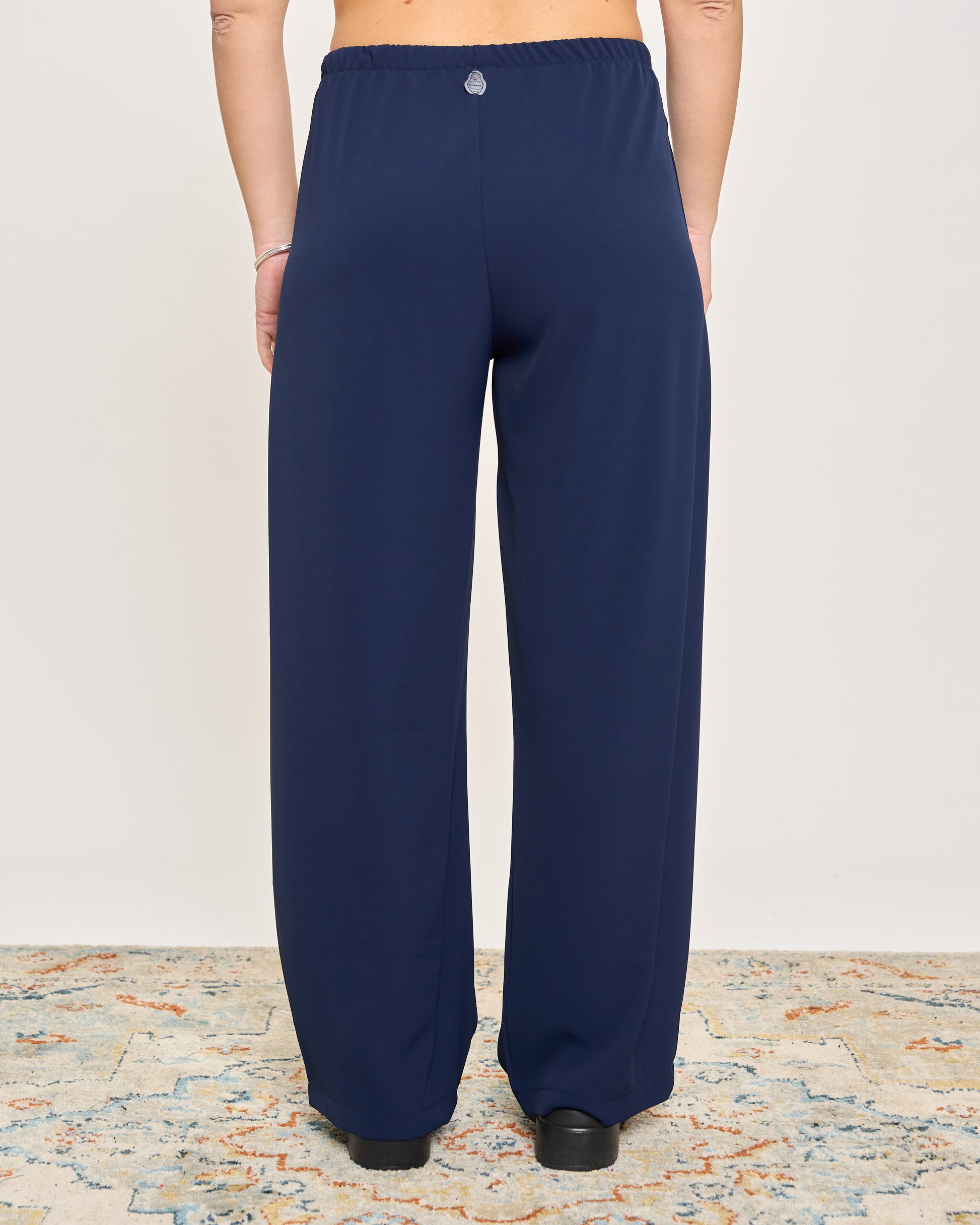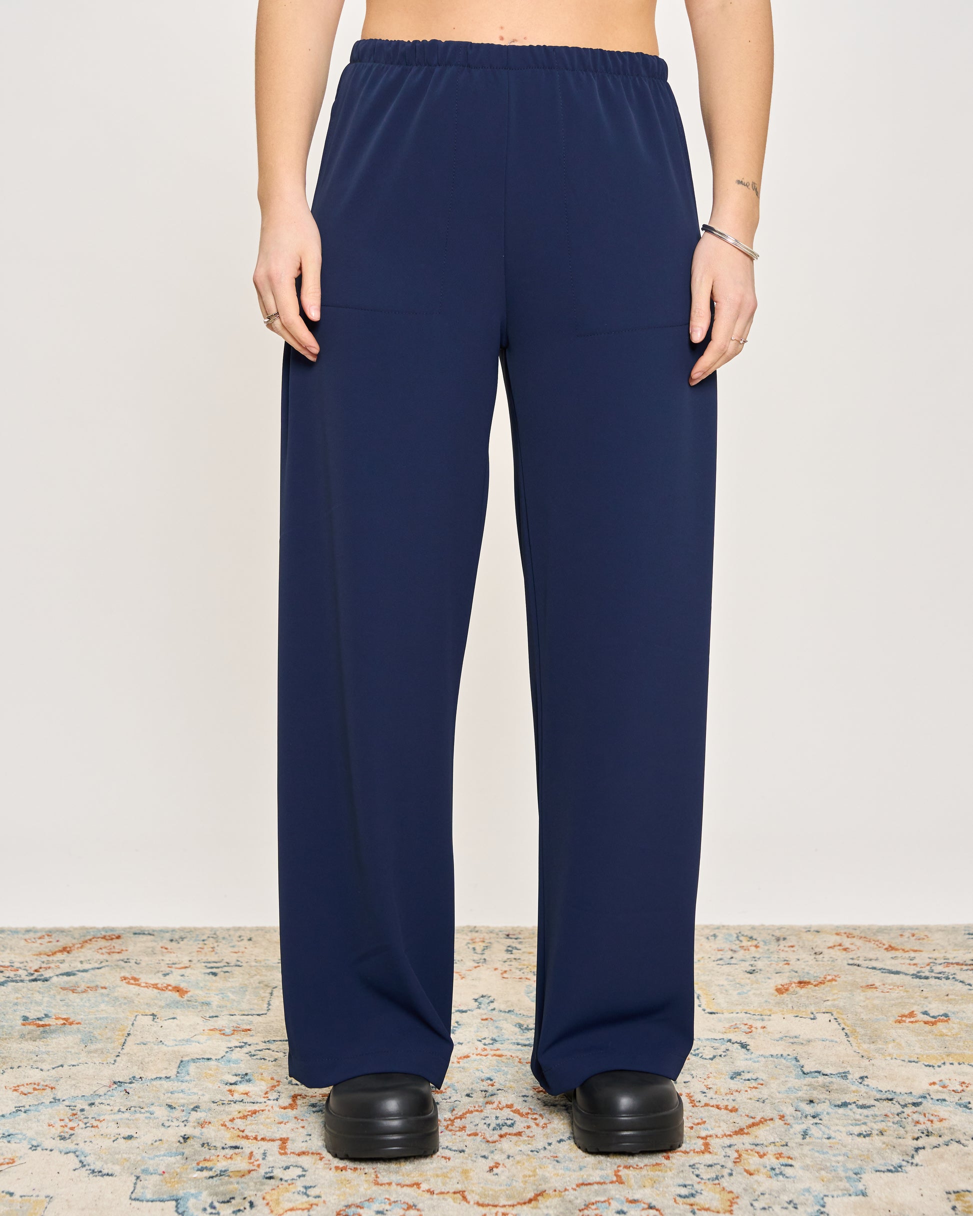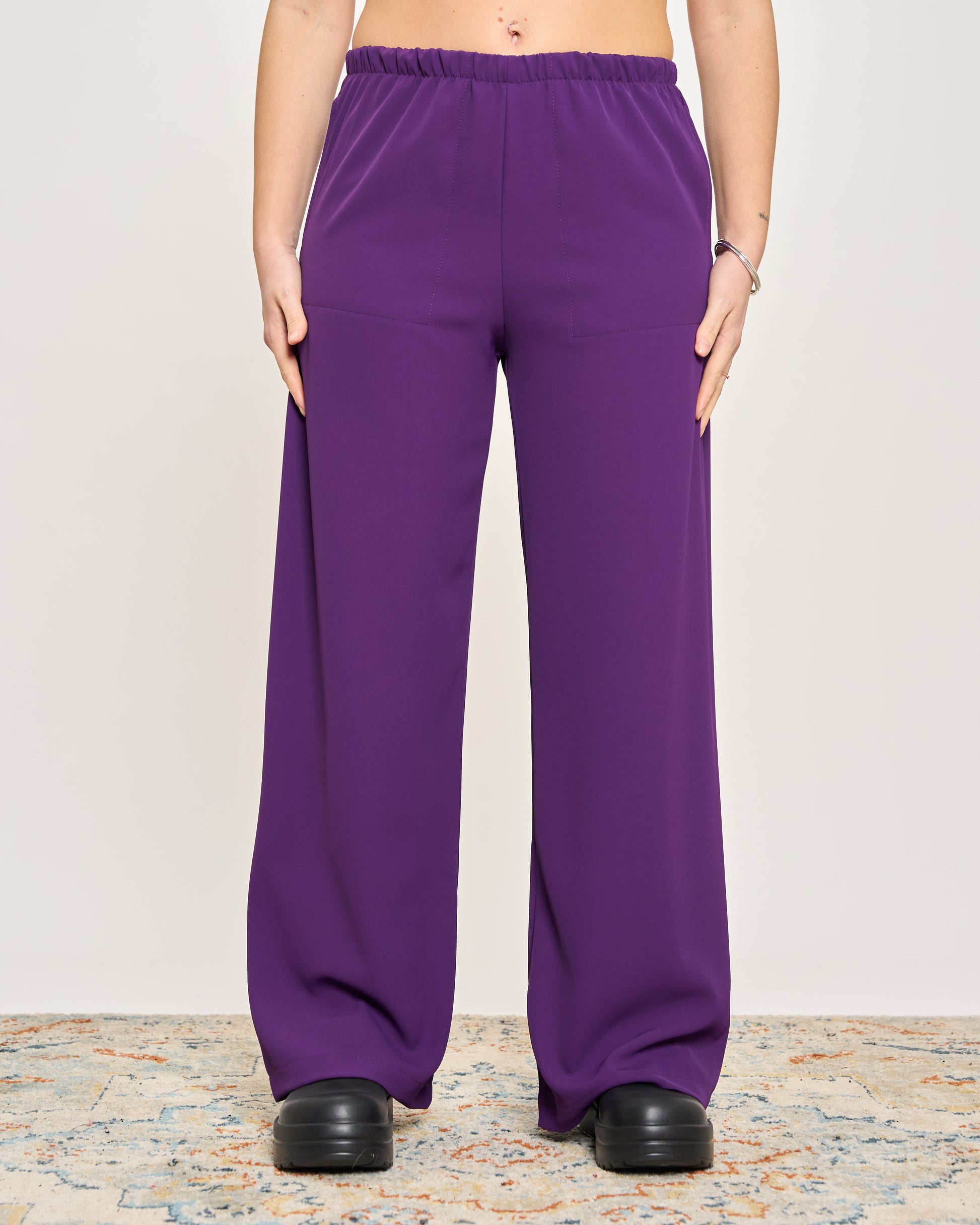 Straight trousers made of stretch cady without seams on the sides, with elasticated waist and side pockets.