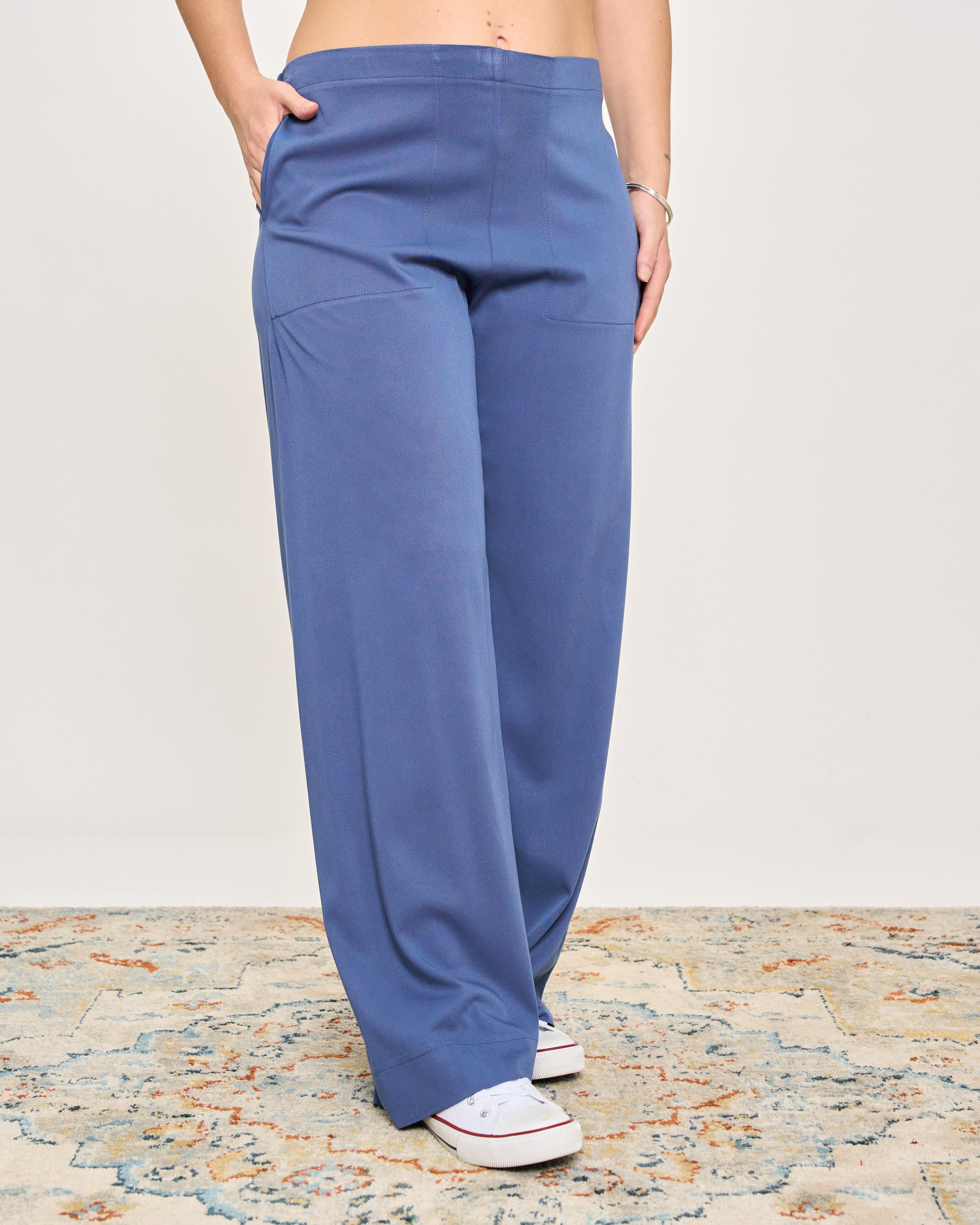 Straight trousers made of stretch cady without seams on the sides, with elasticated waist and side pockets.