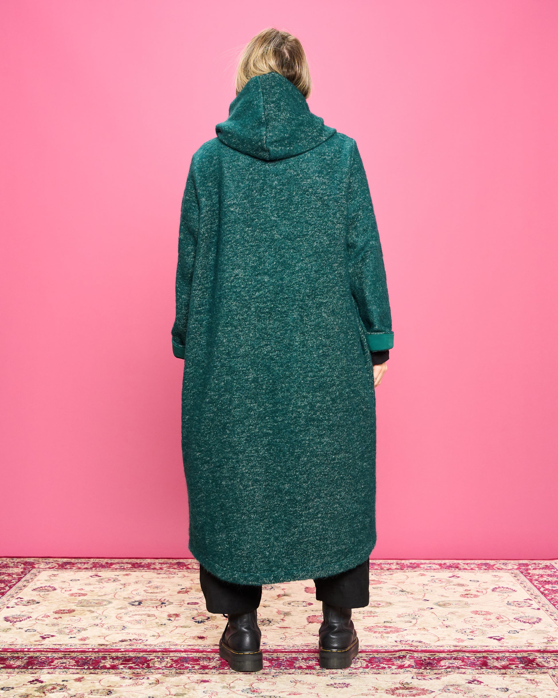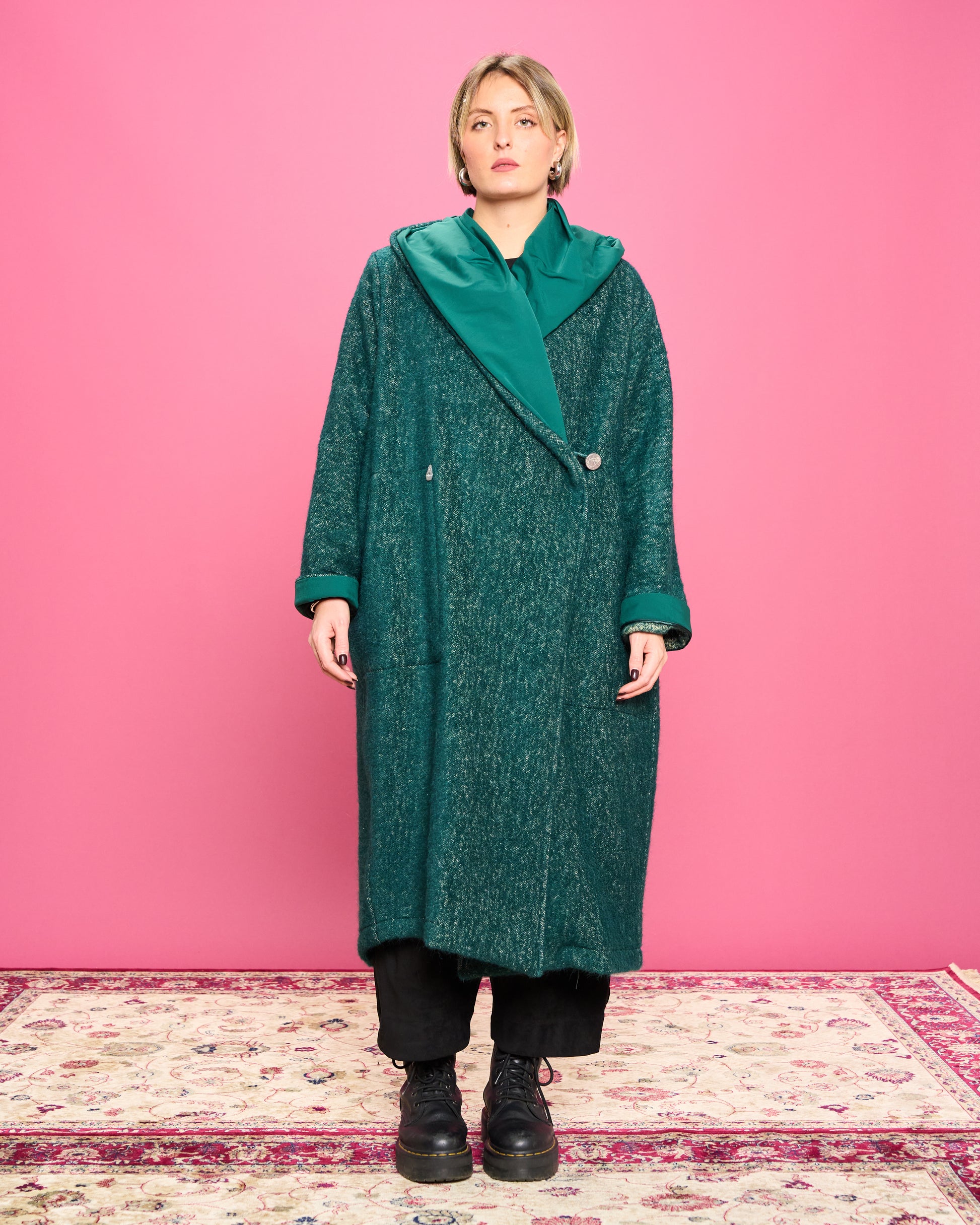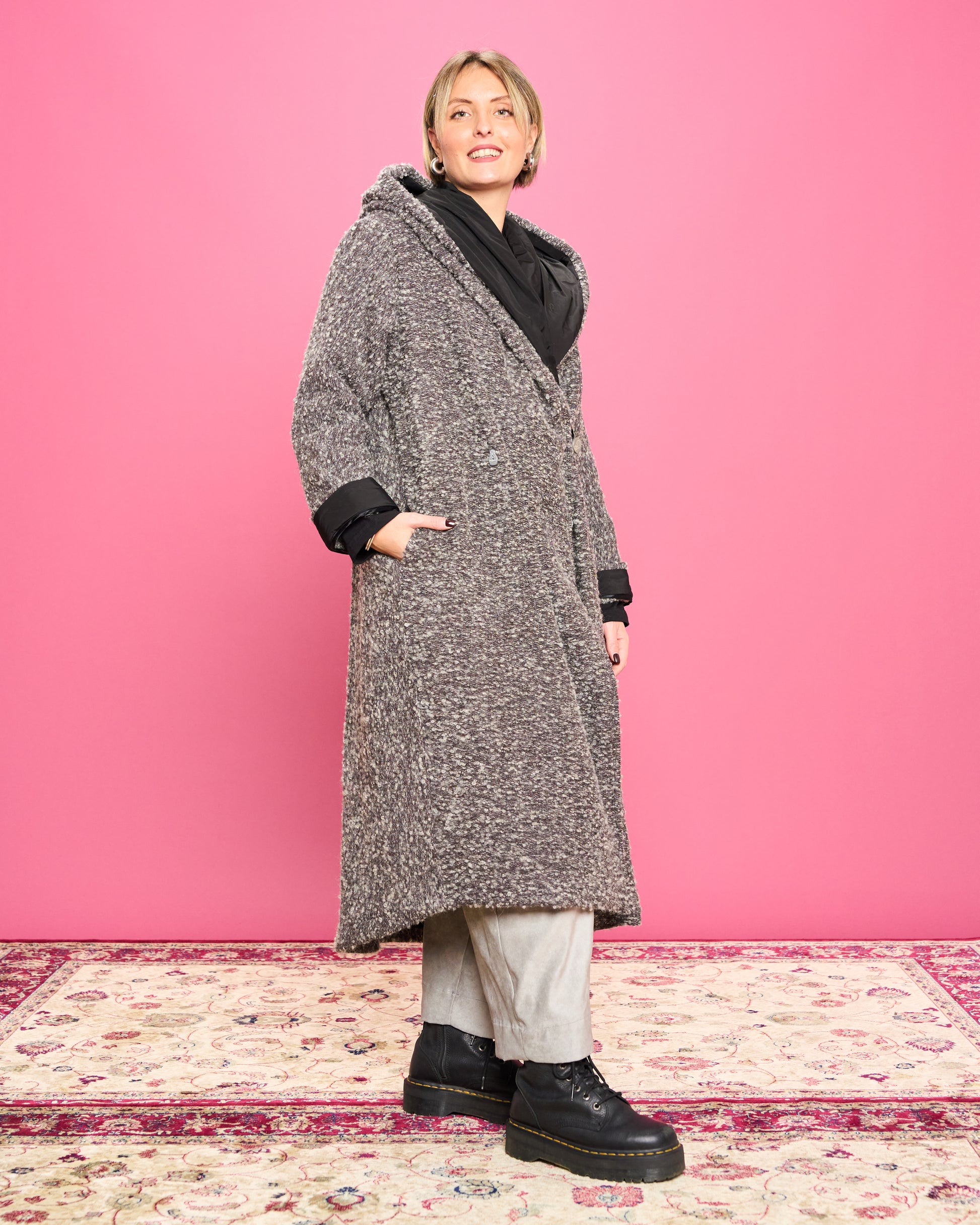 Unlined mohair coat with a boucle effect and hood, patch pockets and front button fastening.