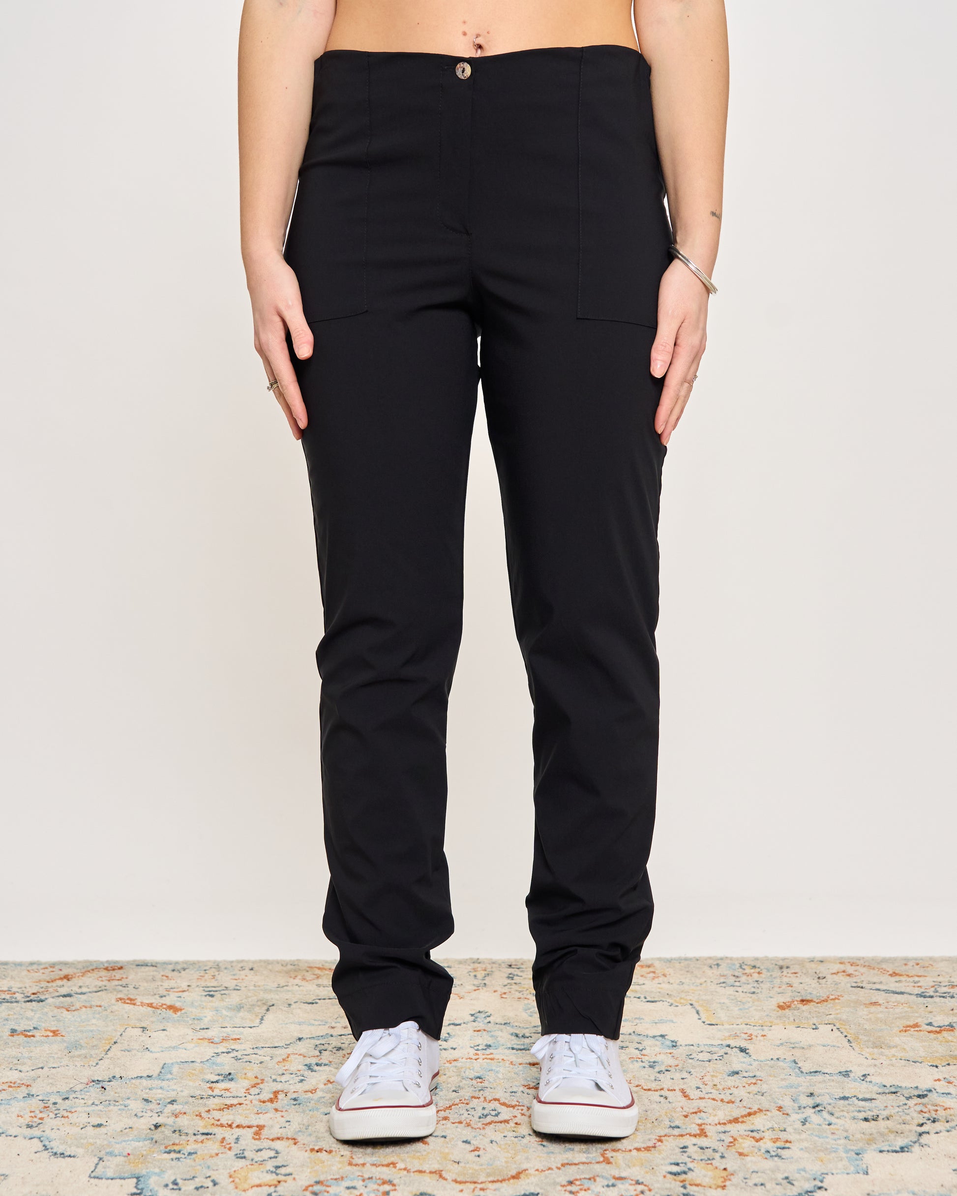 Long trousers with patch pockets on the front, made of stretch fabric.