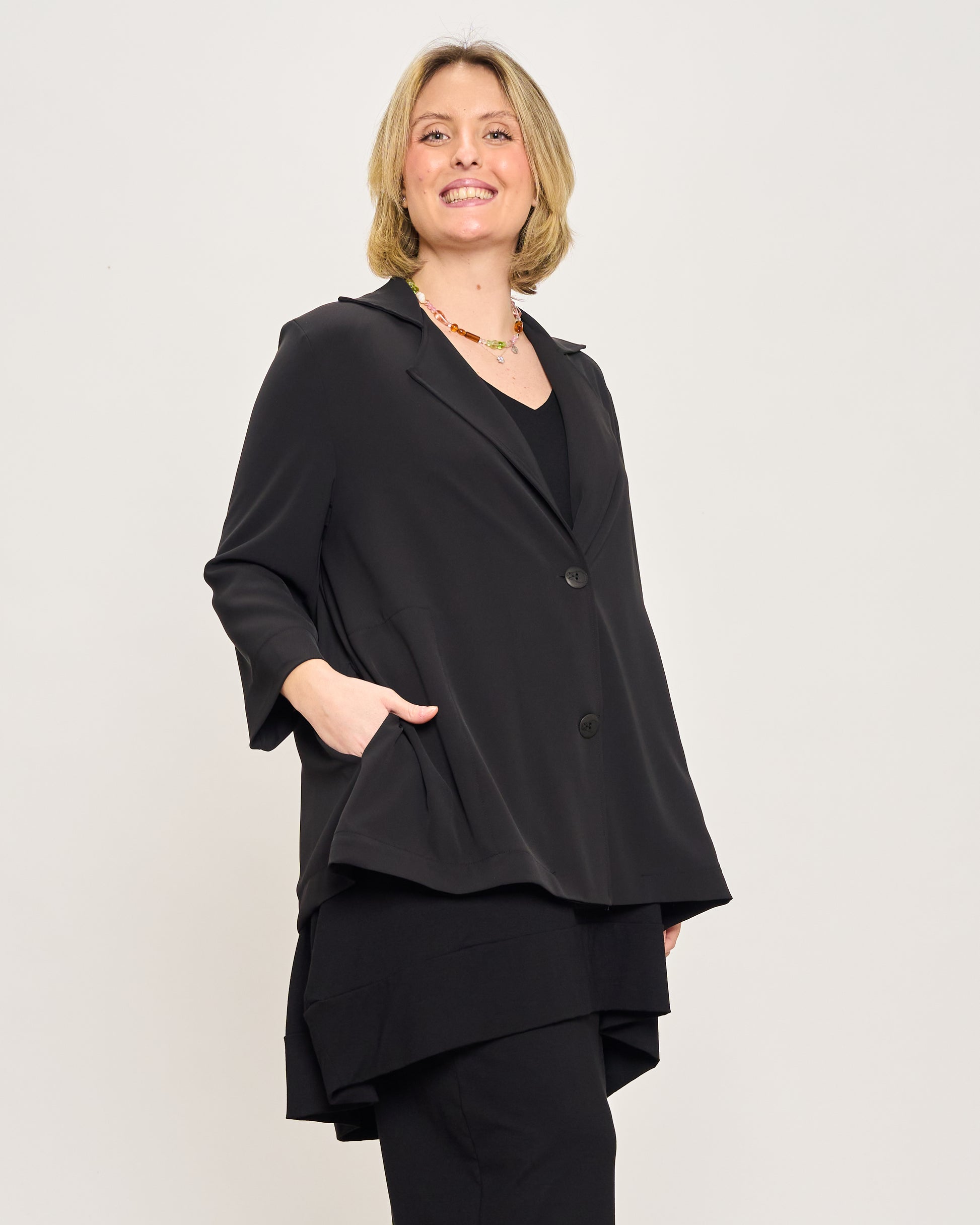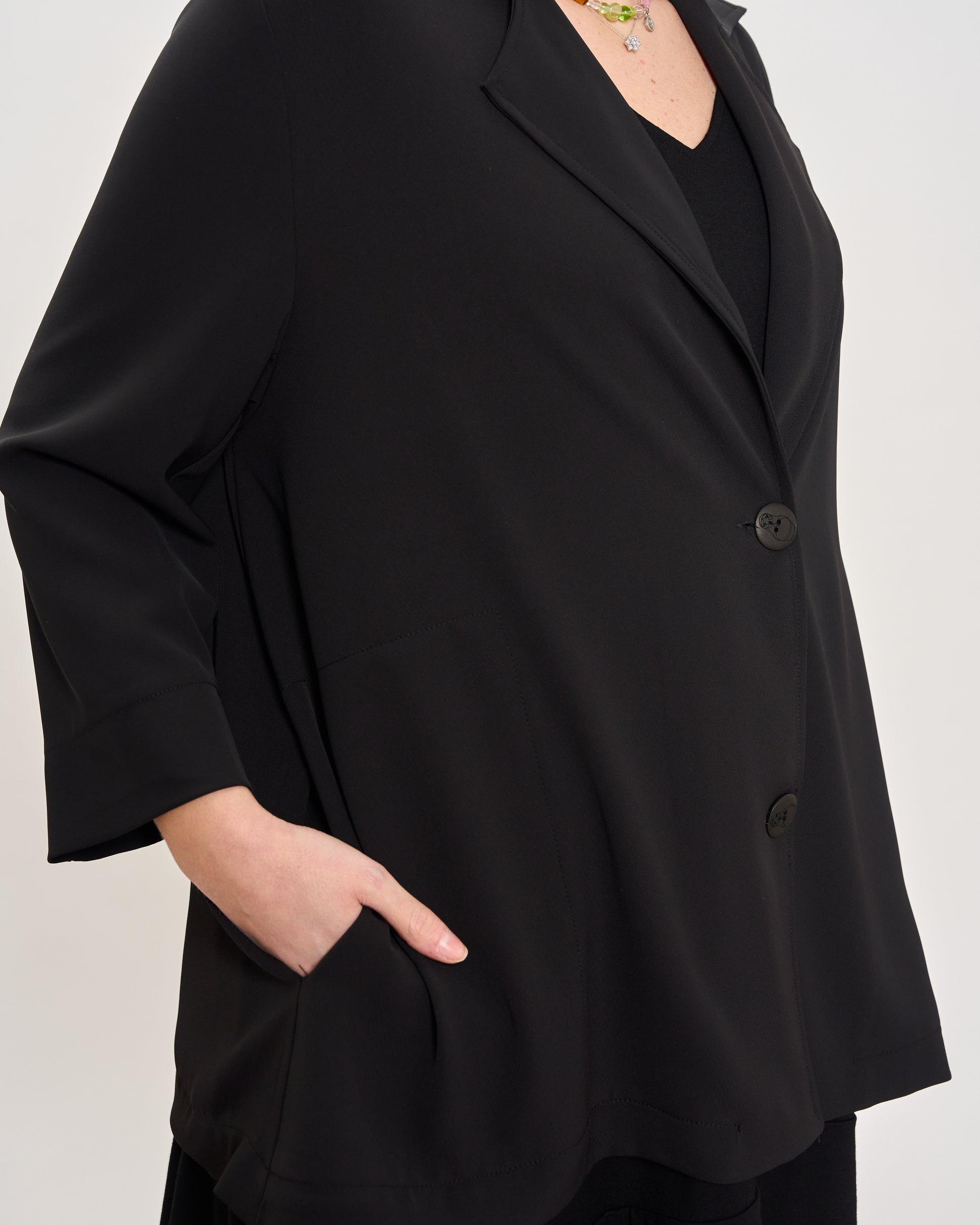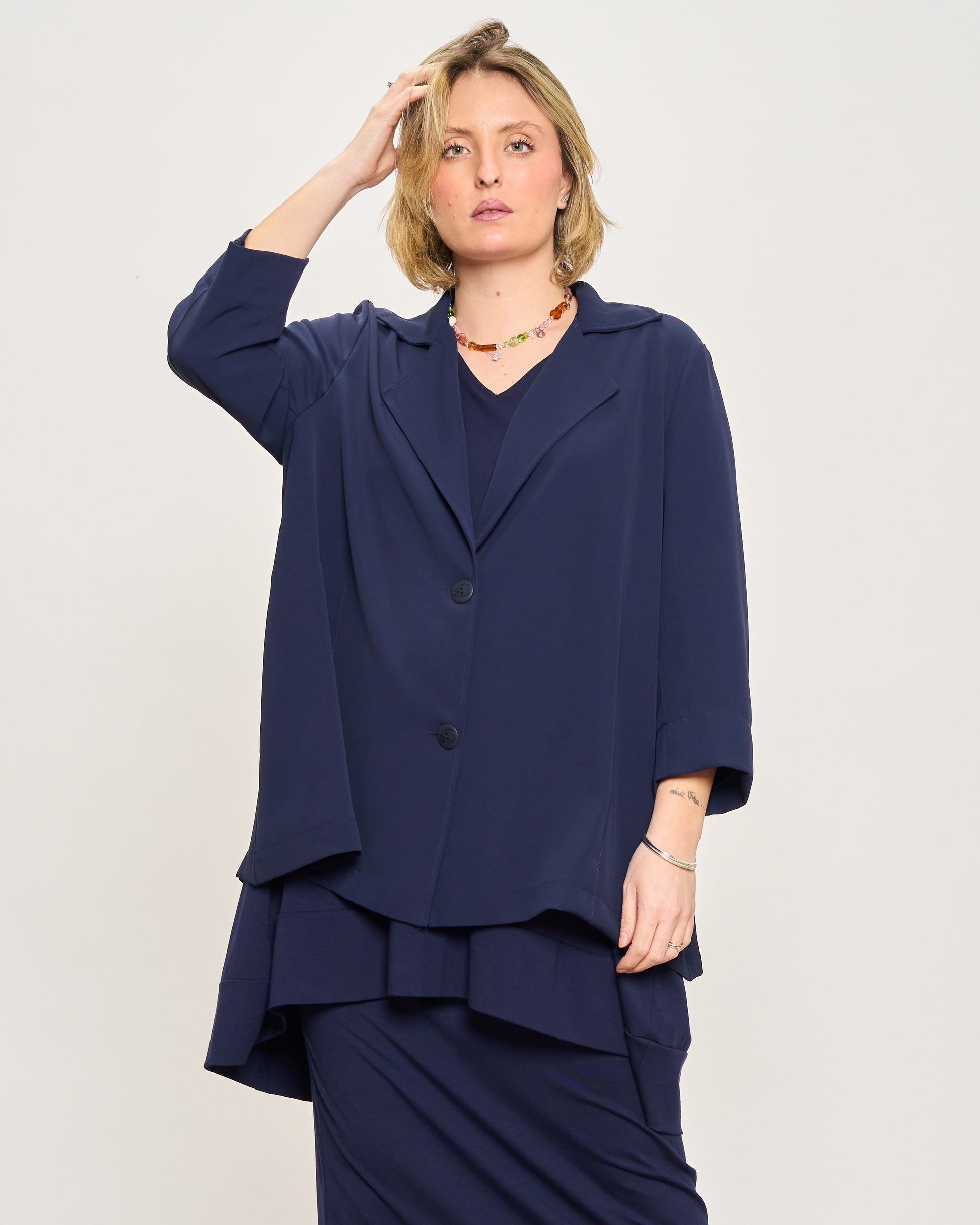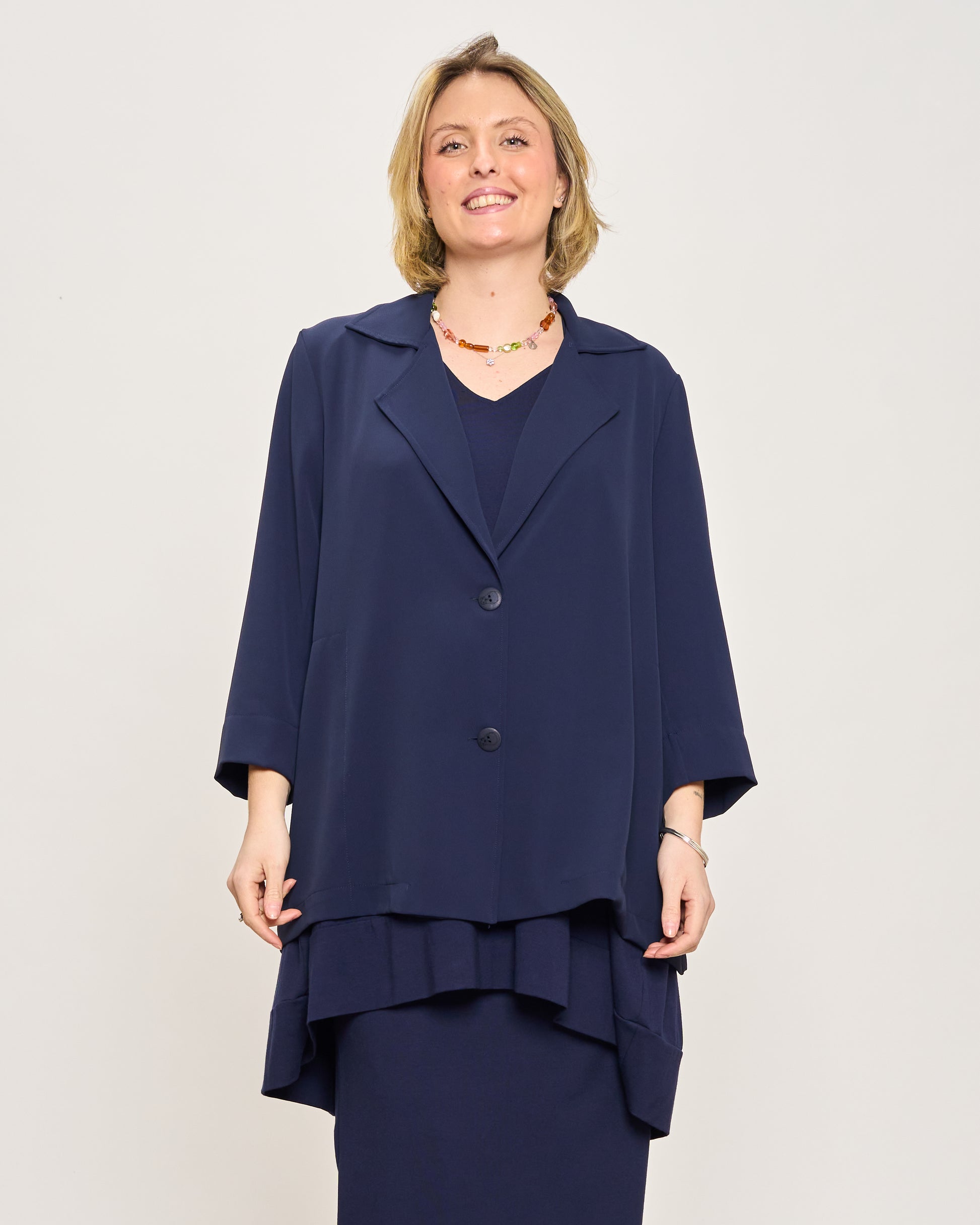 Men's jacket in strechy cady with welt pockets on the front, buttoning on the front and flounce at the bottom and cuff.
