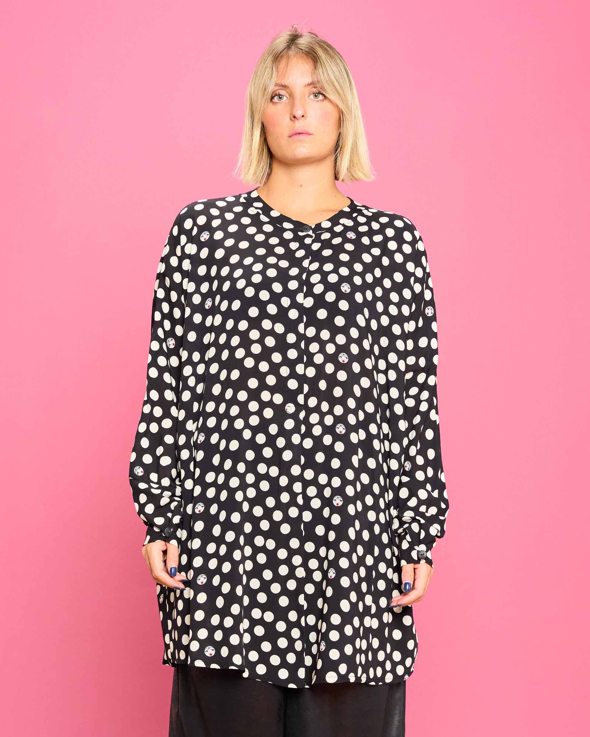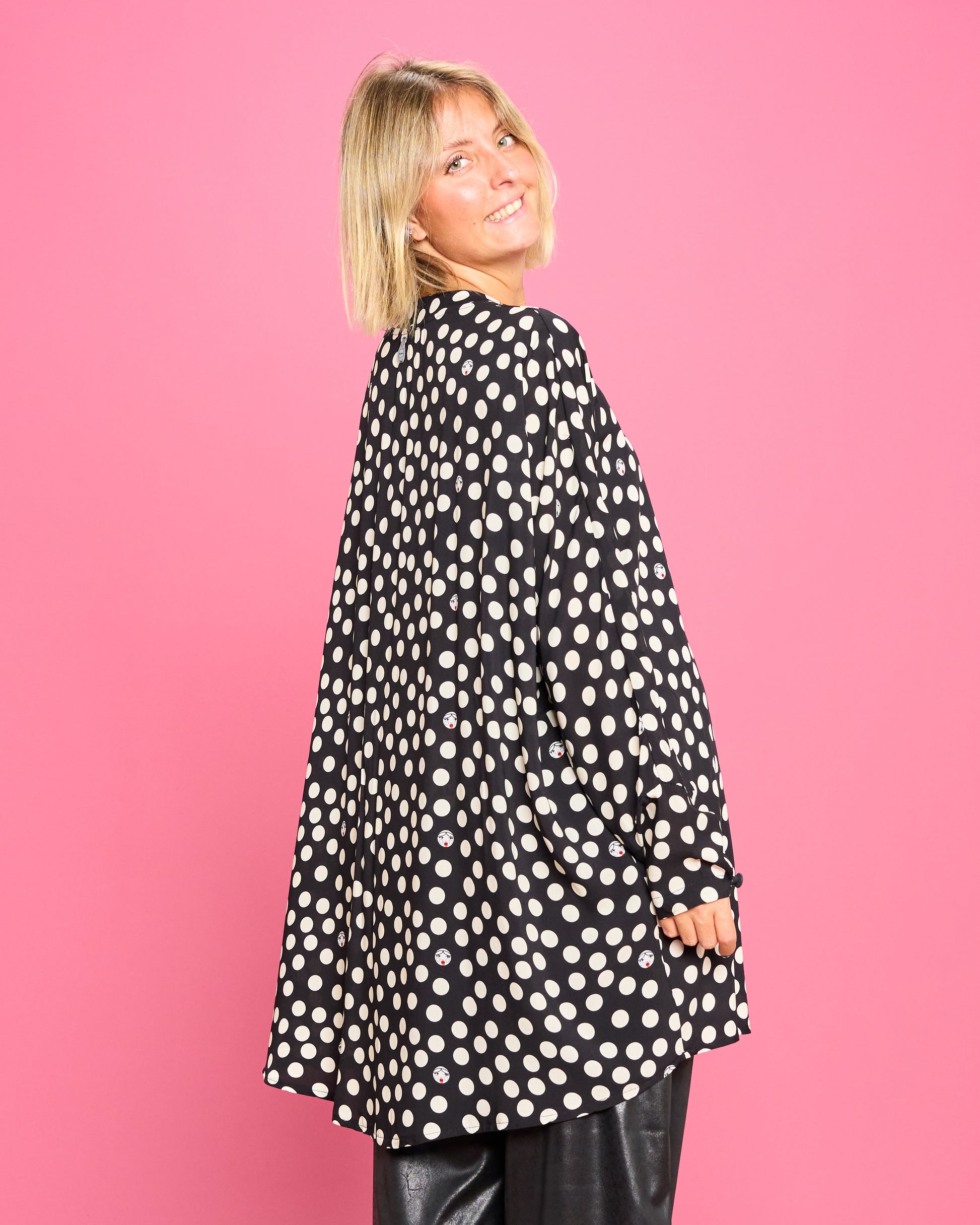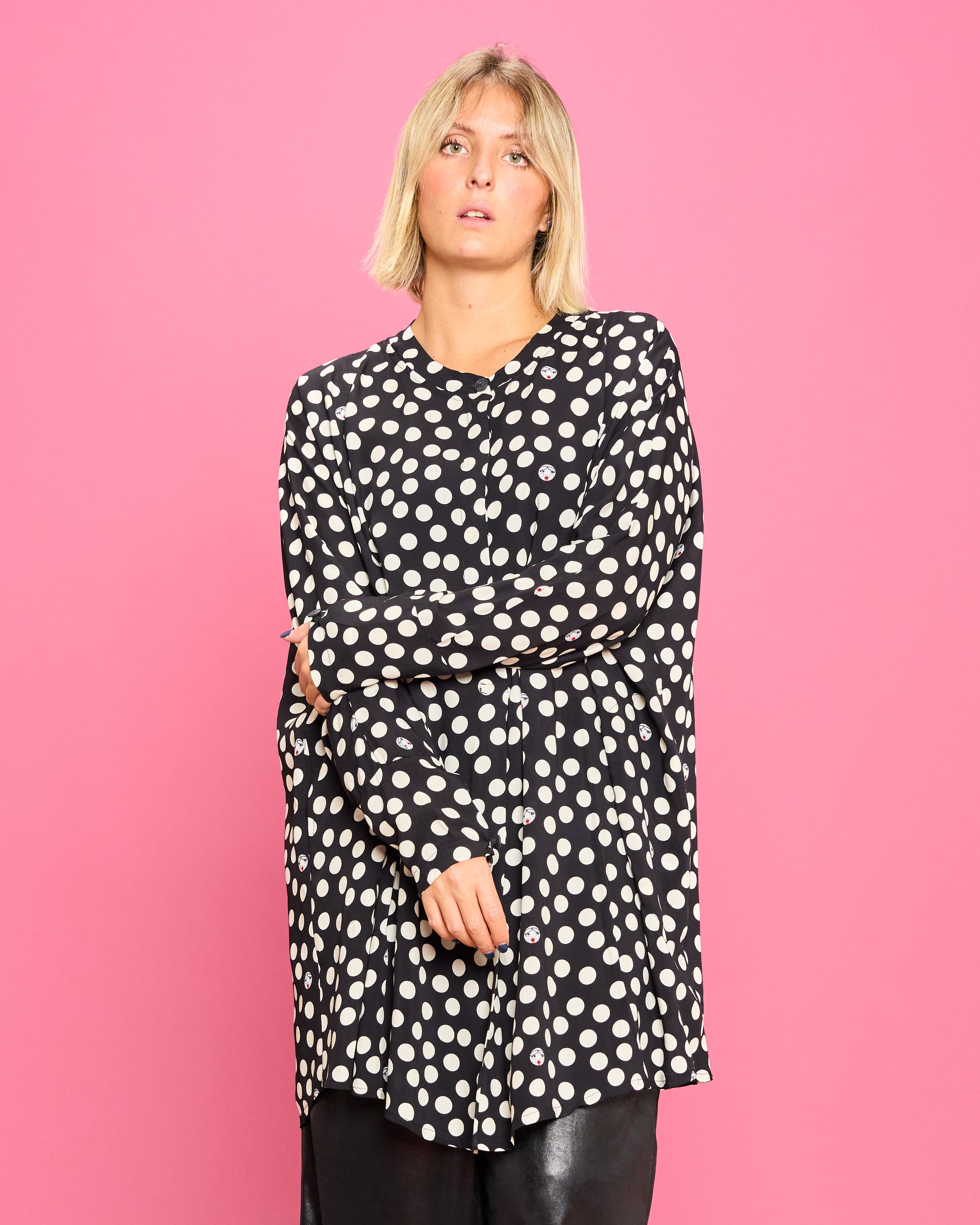 Blusa over in viscosa stampata con colletto a coreana, maniche con polsino e tasche sui fianchi