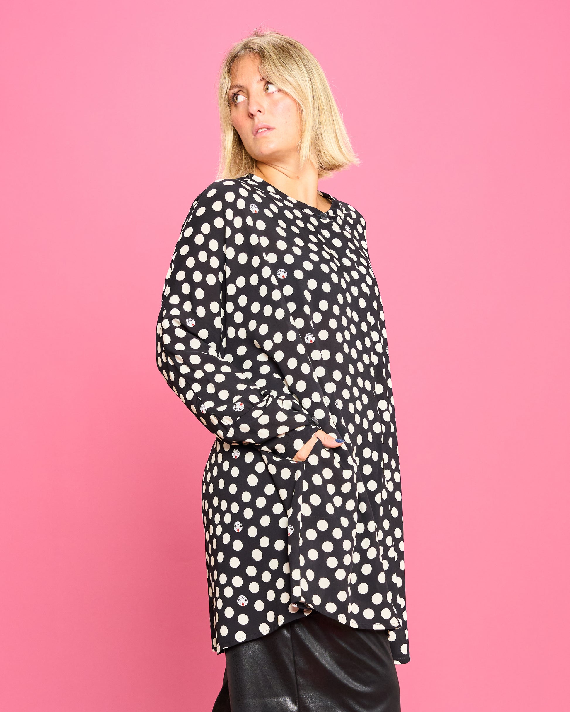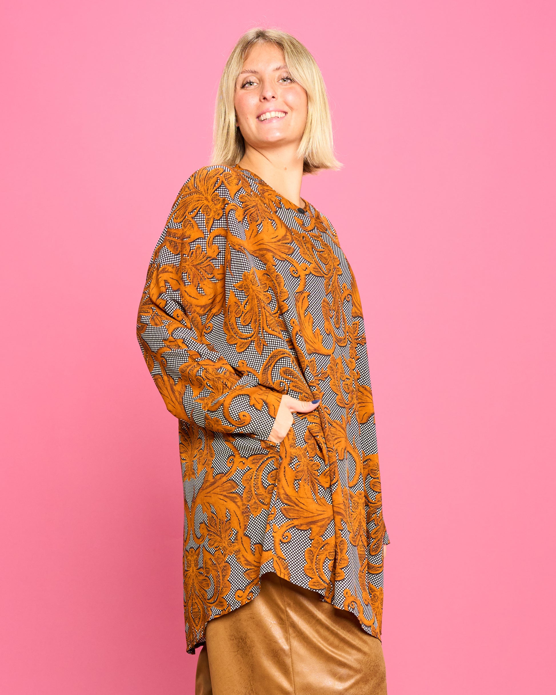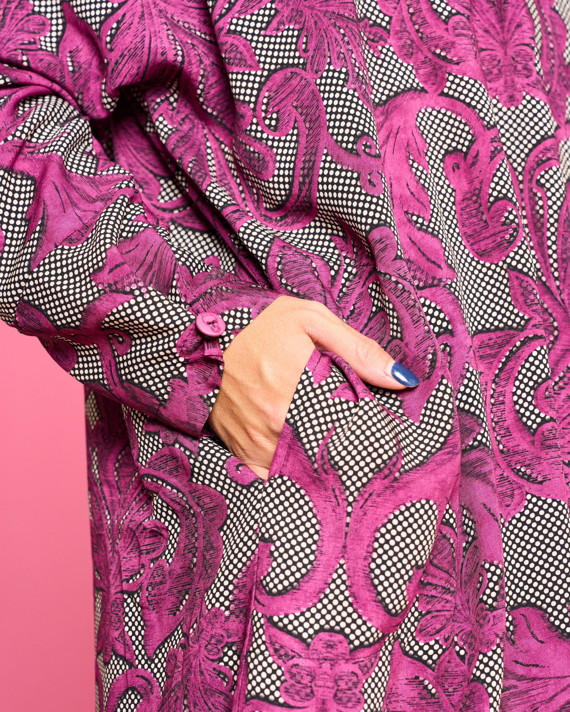 Blusa over in viscosa stampata con colletto a coreana, maniche con polsino e tasche sui fianchi