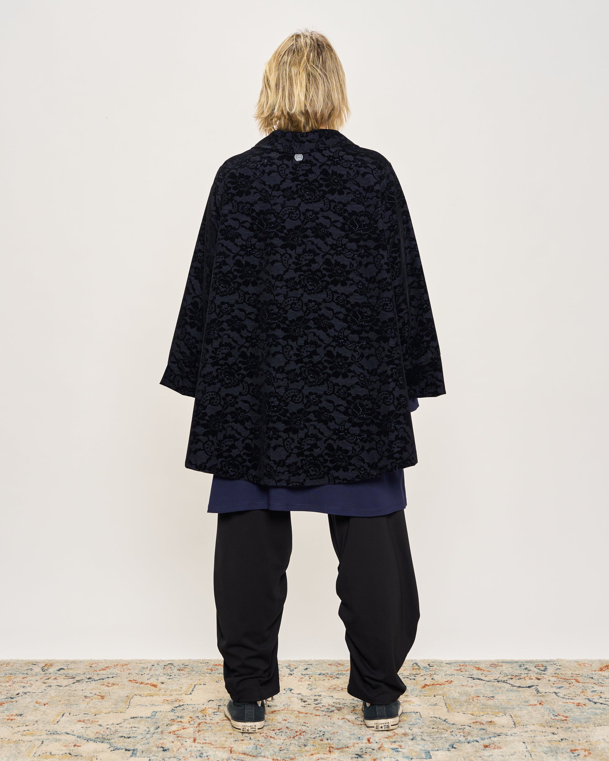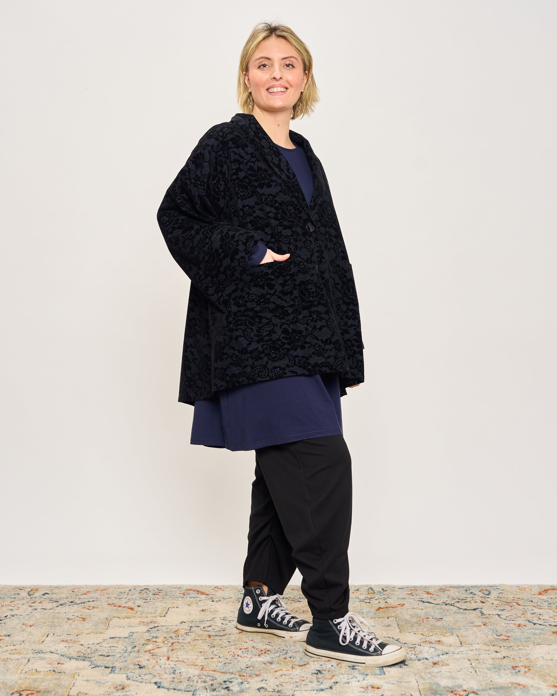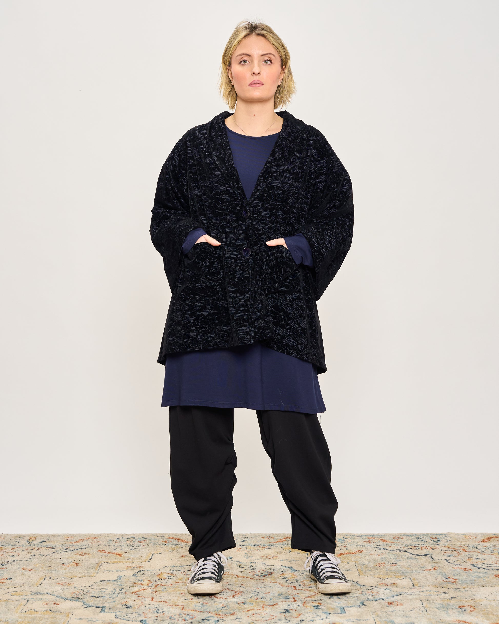 Giacca svasata in tessuto memory con fantasia in velluto, collo sciallato, tasche a toppa, abbottonatura sul davanti e manica ampia con risvolto.