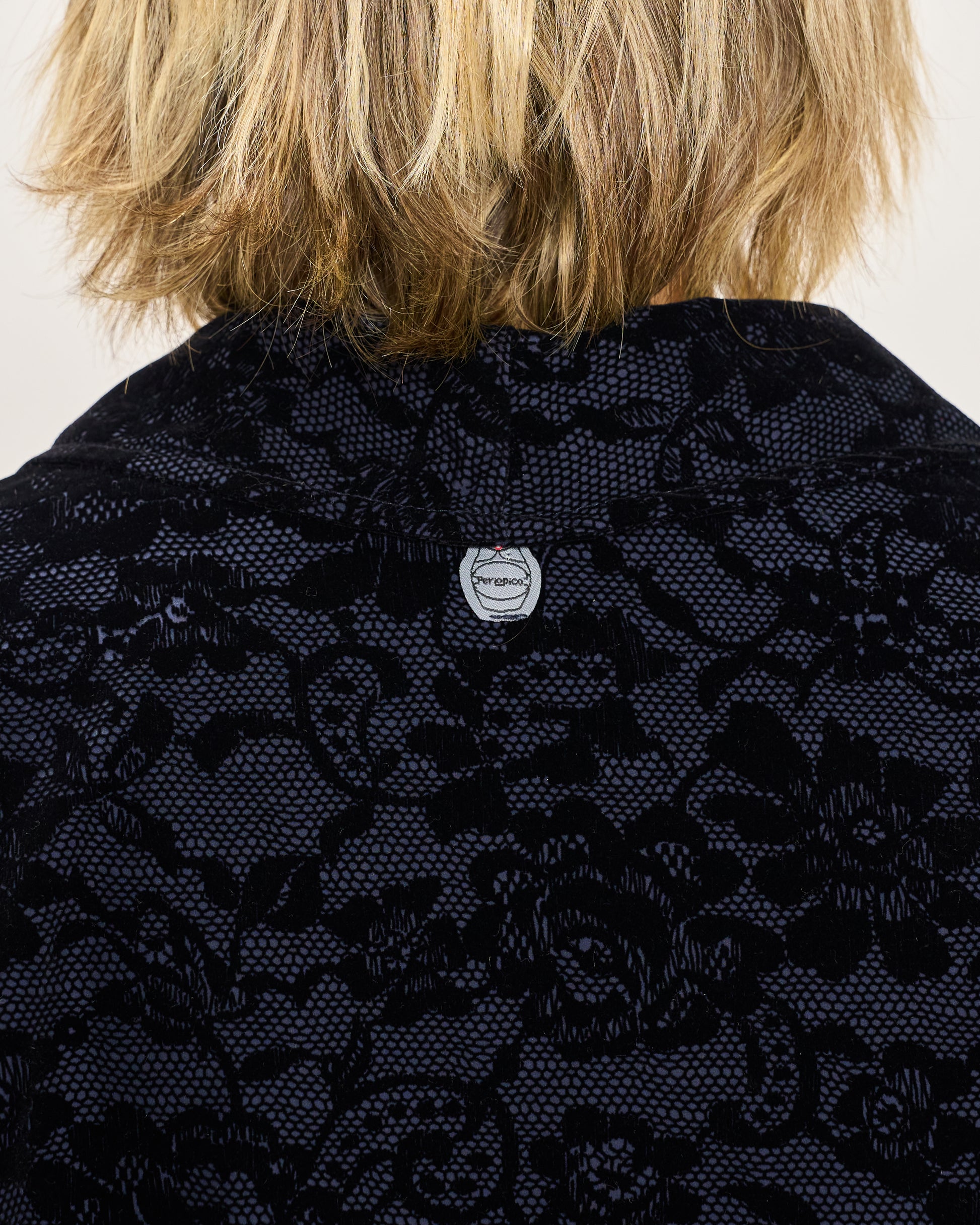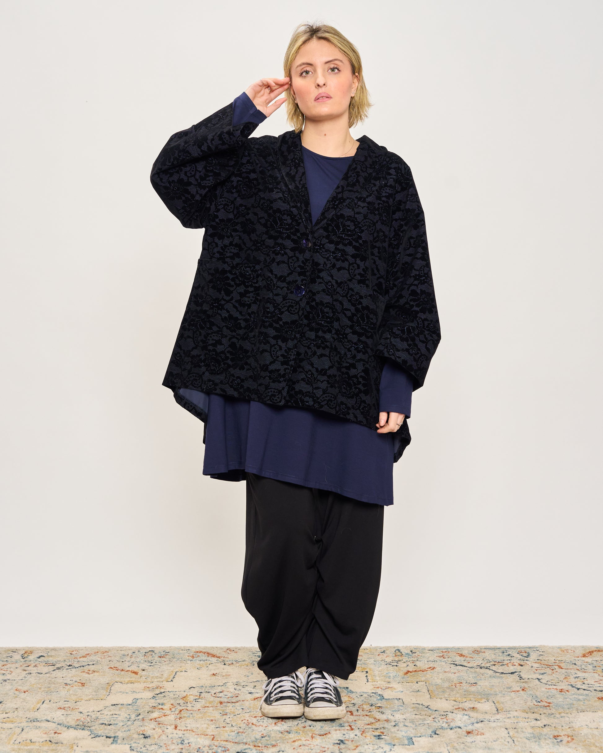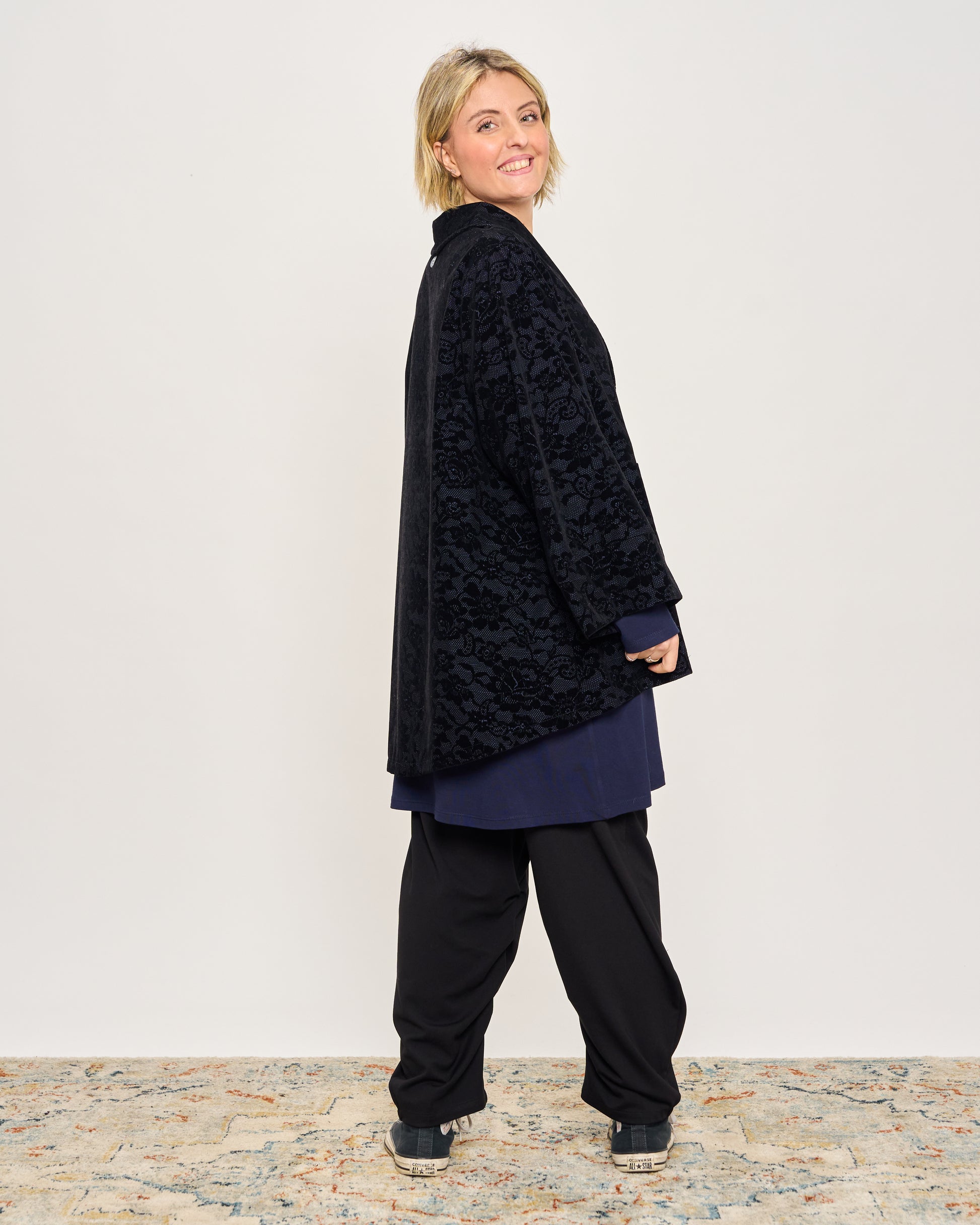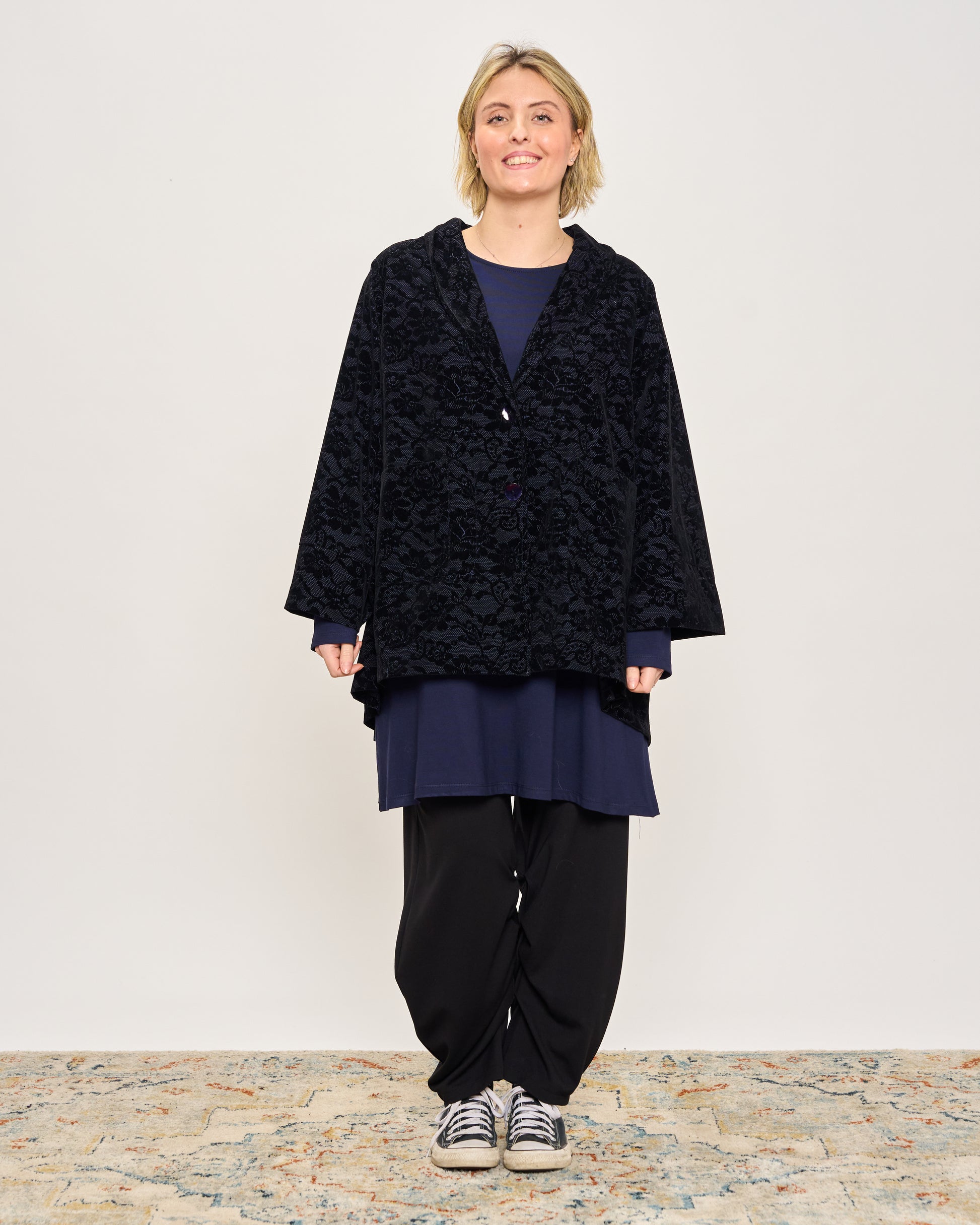 Giacca svasata in tessuto memory con fantasia in velluto, collo sciallato, tasche a toppa, abbottonatura sul davanti e manica ampia con risvolto.