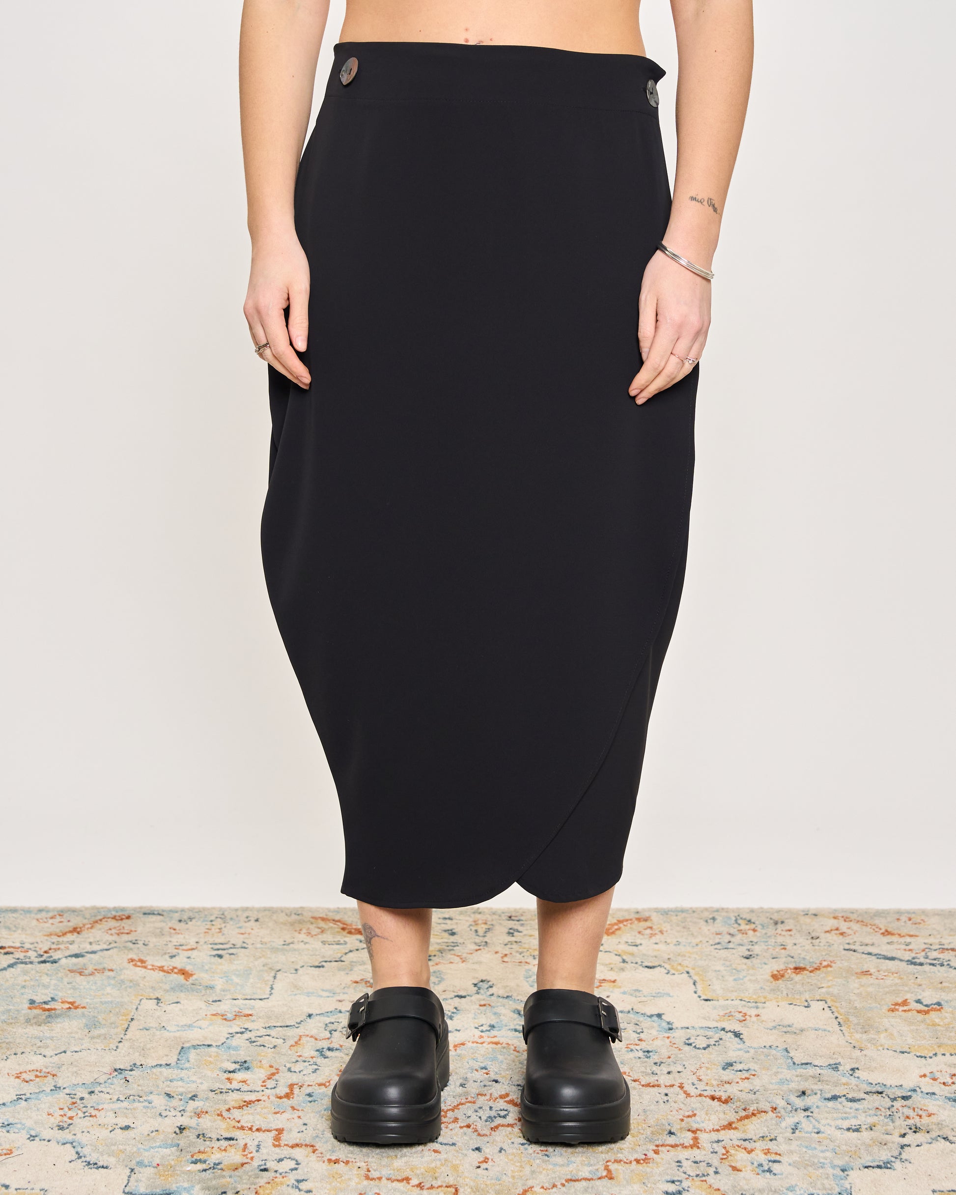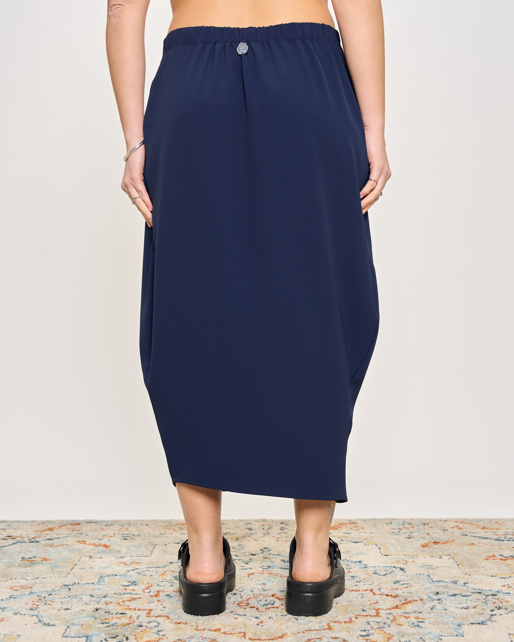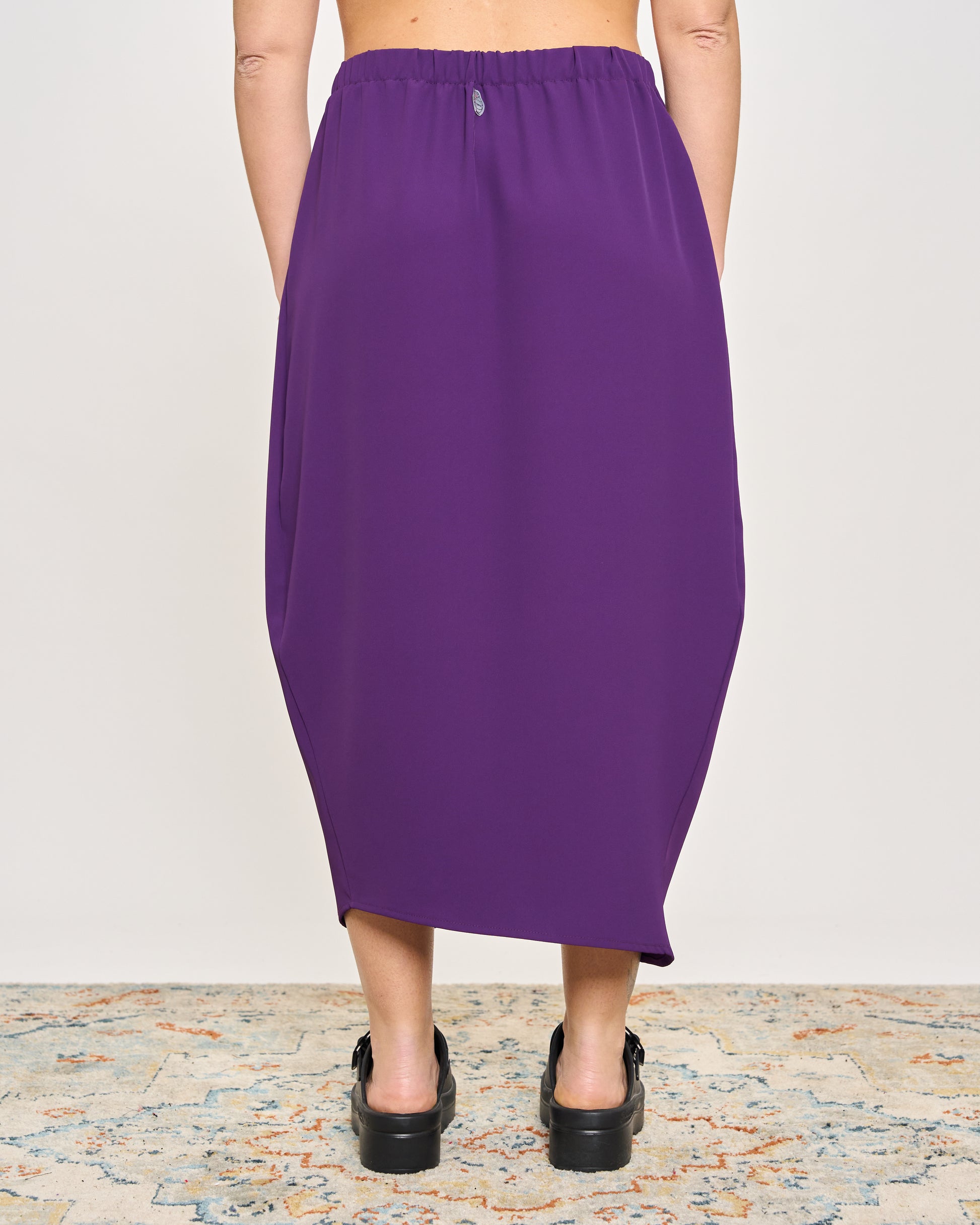 Gonna in cady elasticizzato con elastico in vita e chiusura con bottone sul fianco.