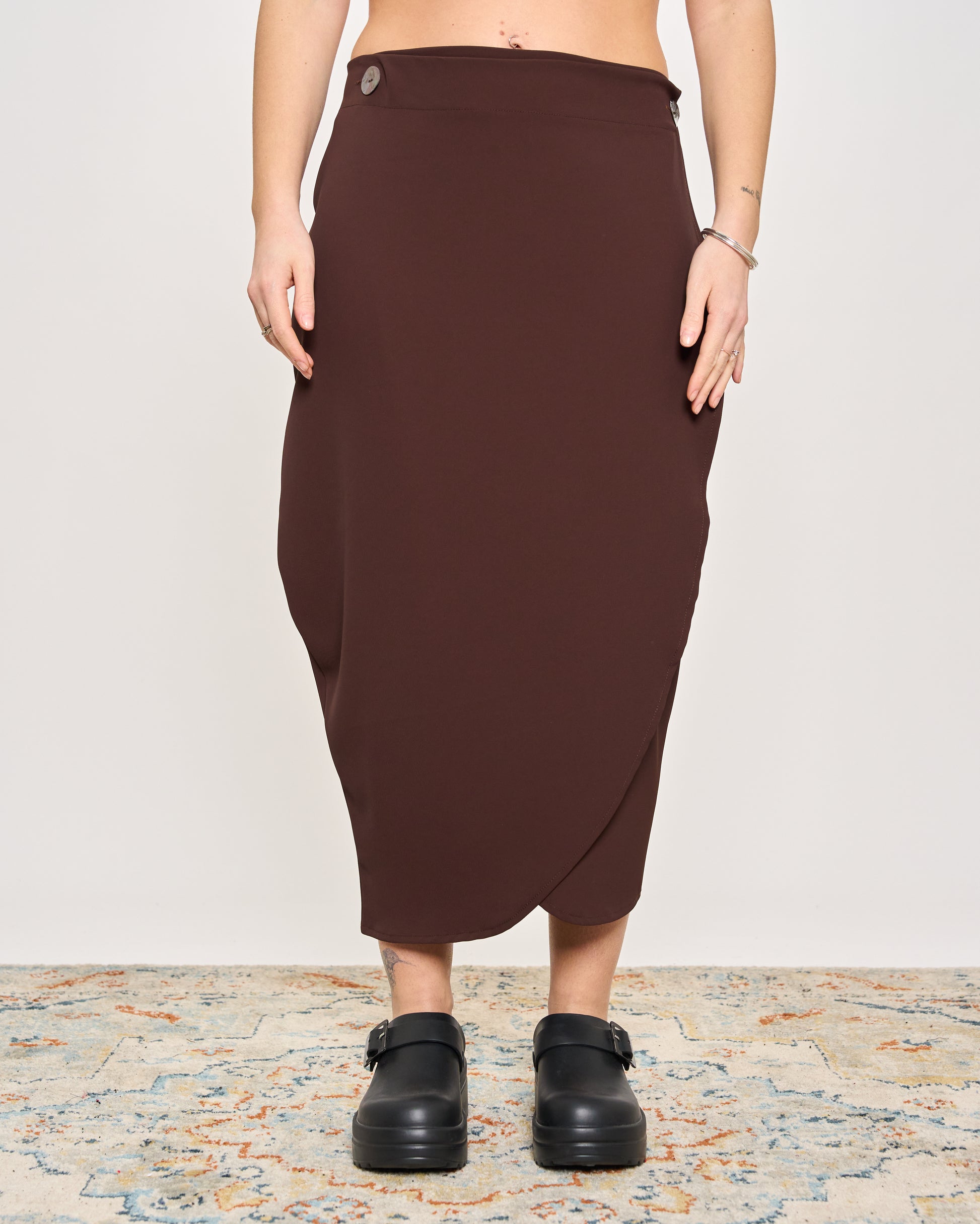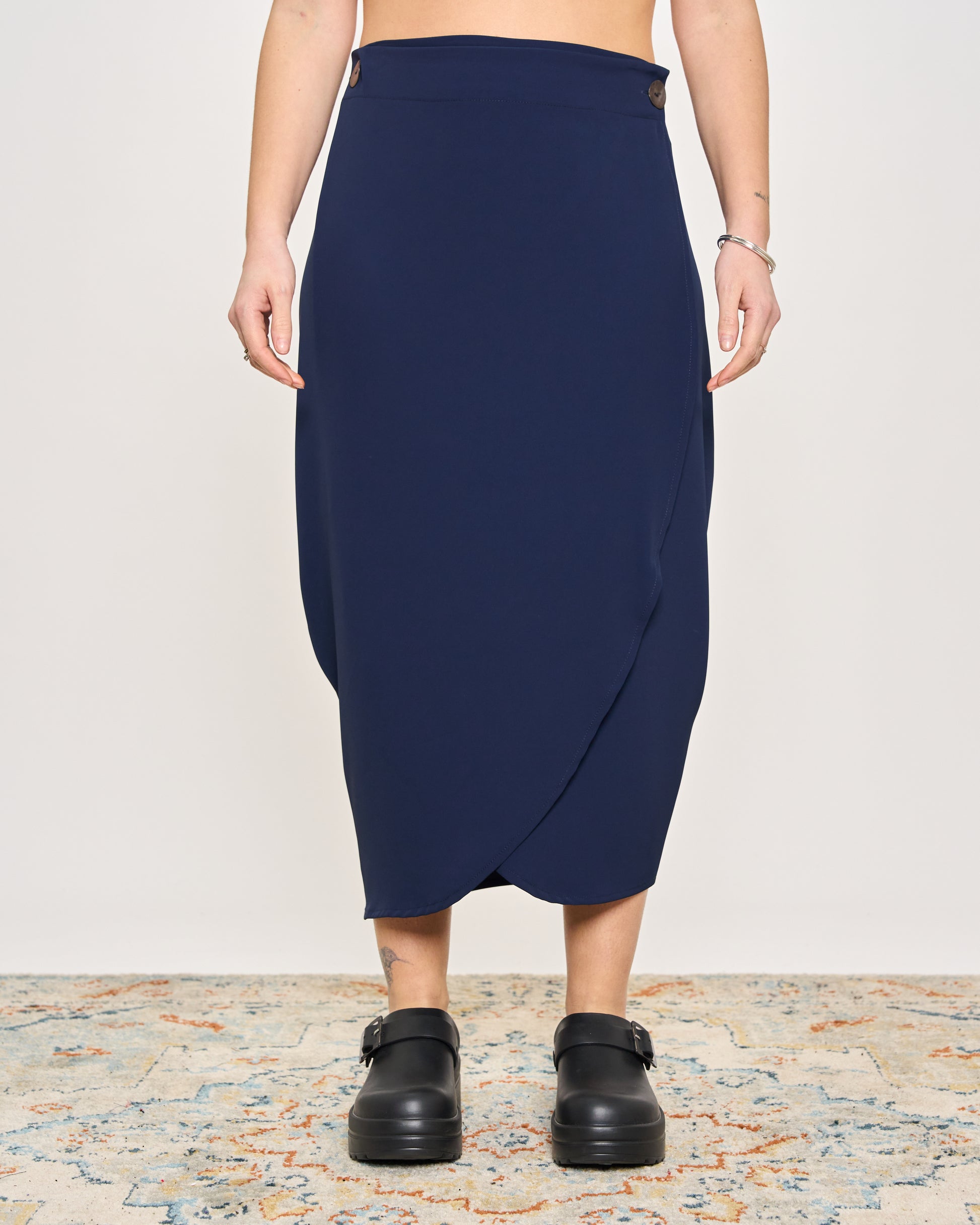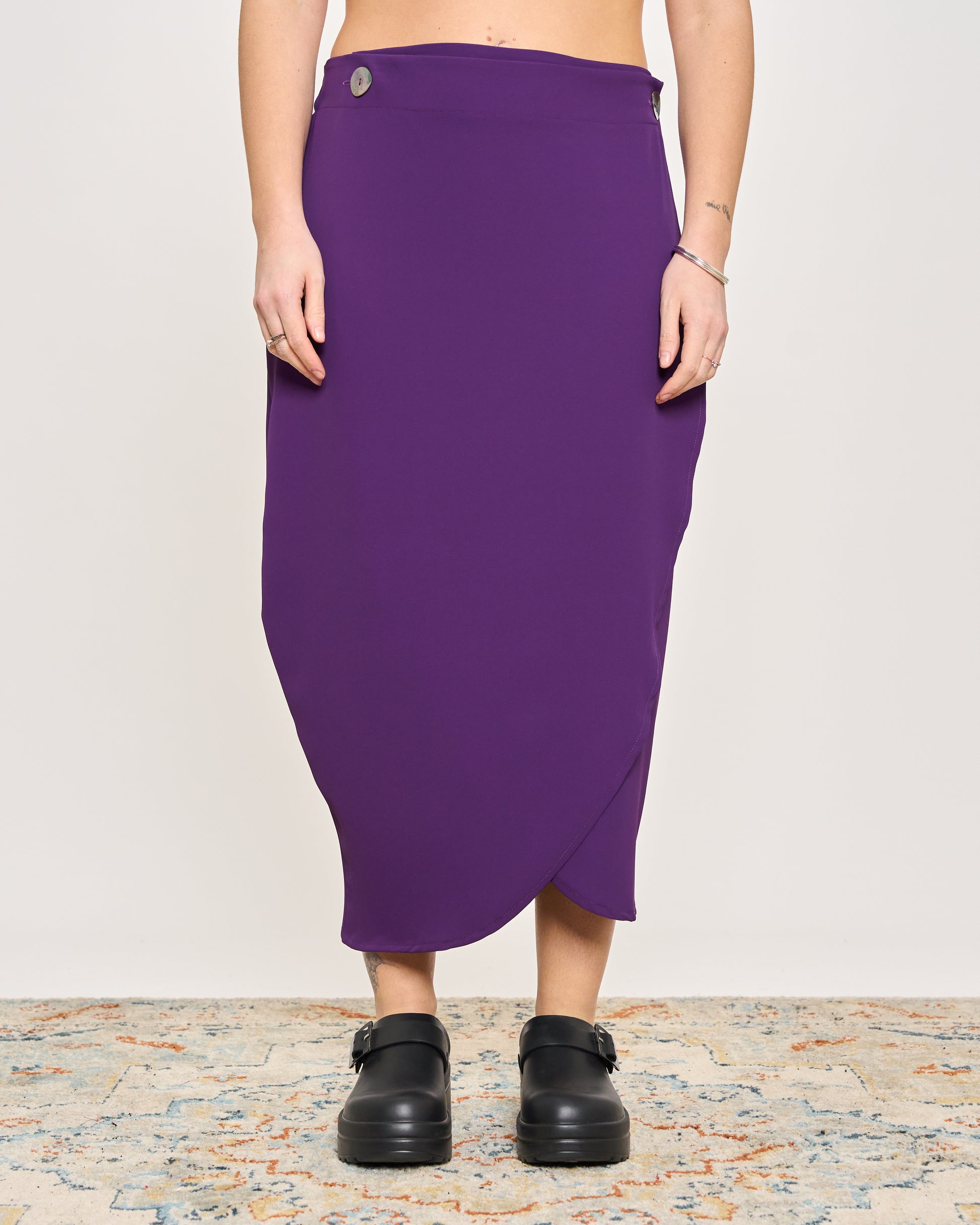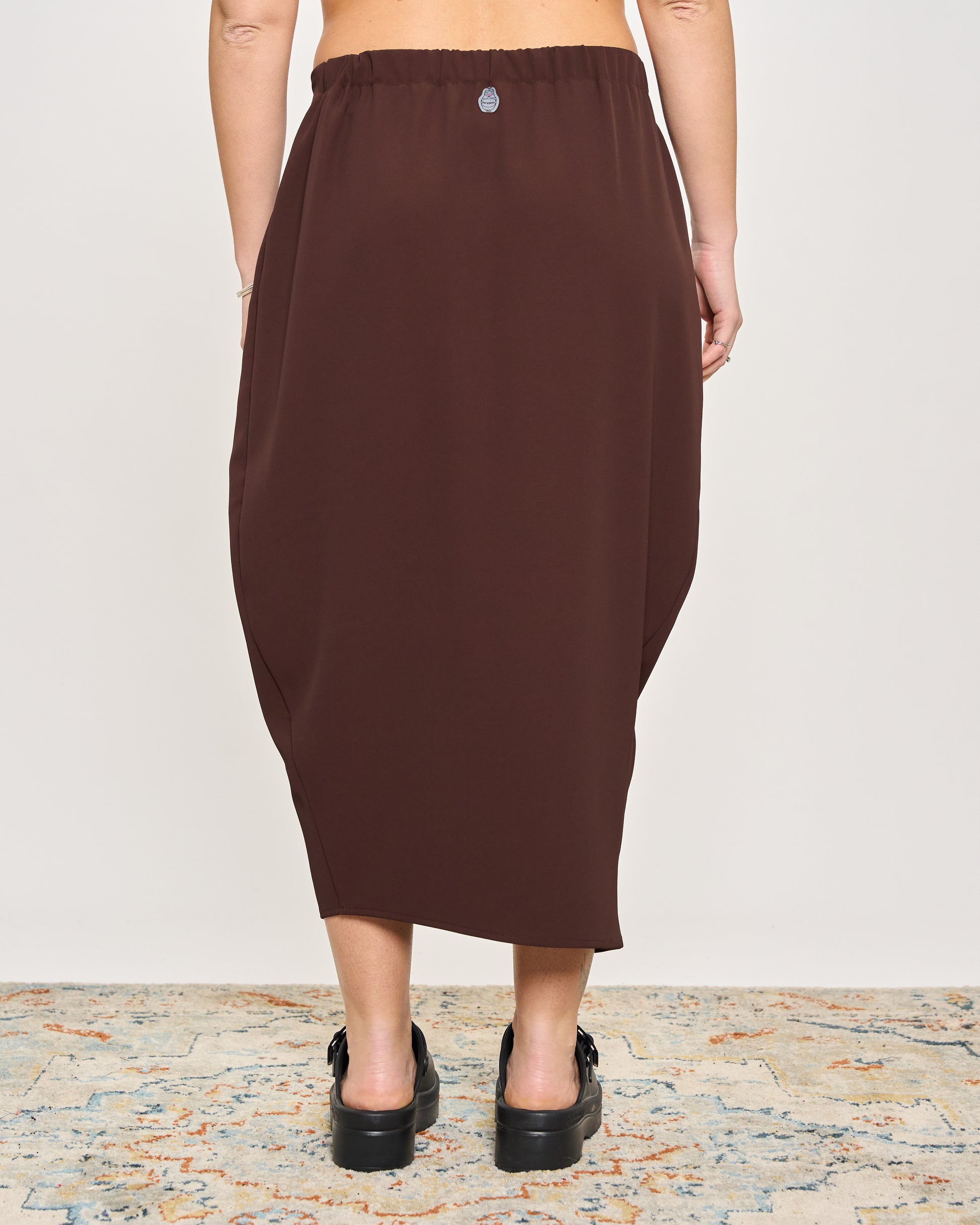 Gonna in cady elasticizzato con elastico in vita e chiusura con bottone sul fianco.