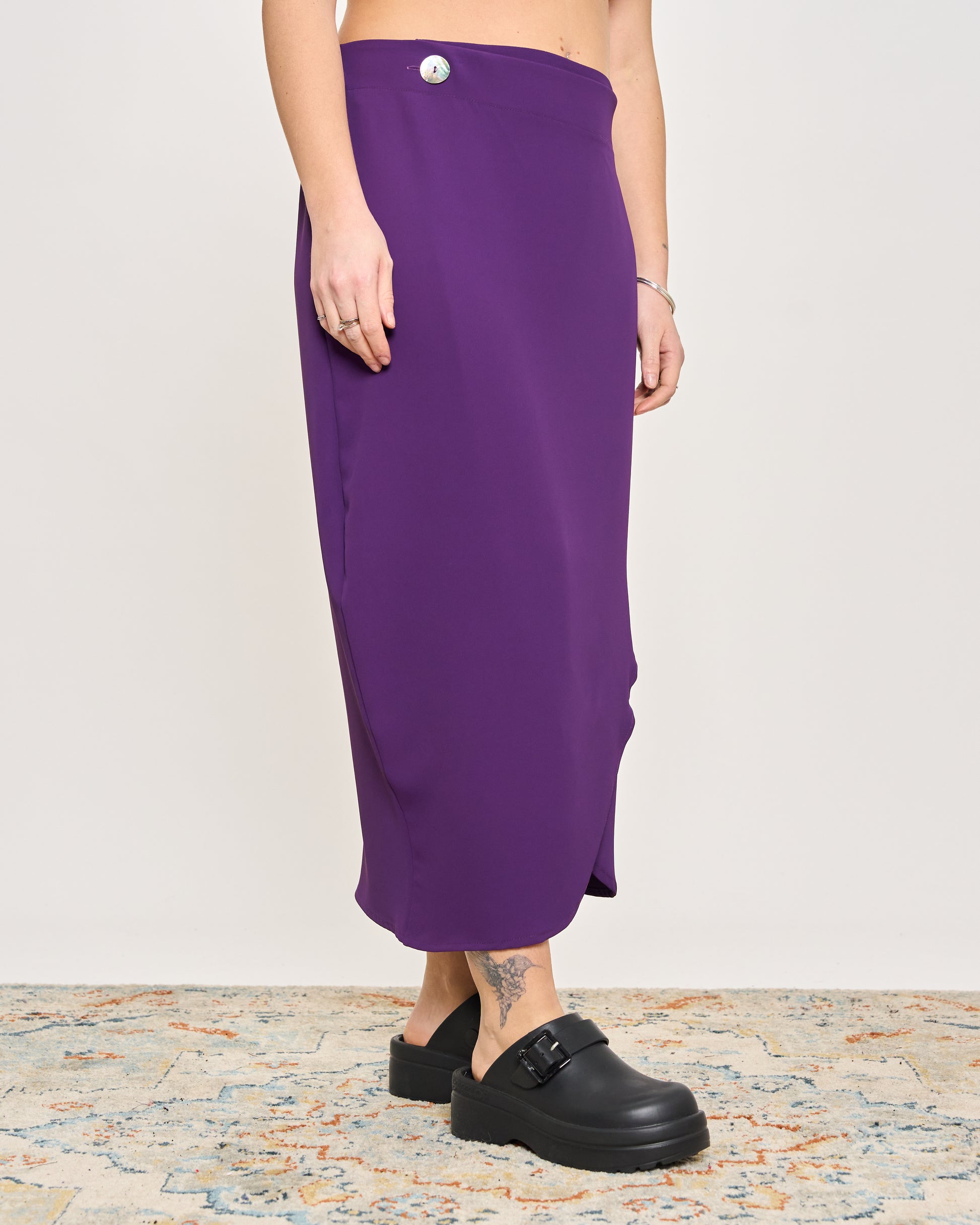 Gonna in cady elasticizzato con elastico in vita e chiusura con bottone sul fianco.