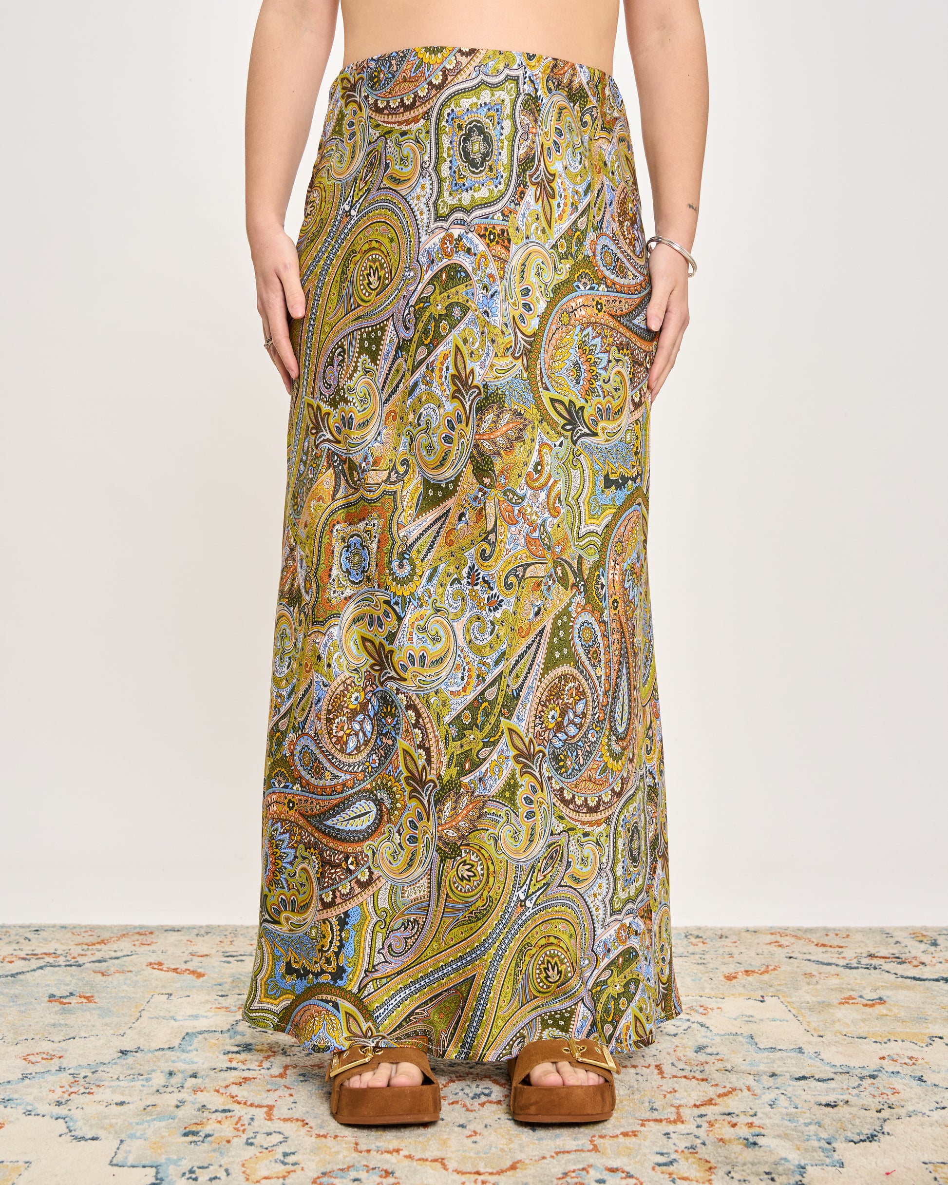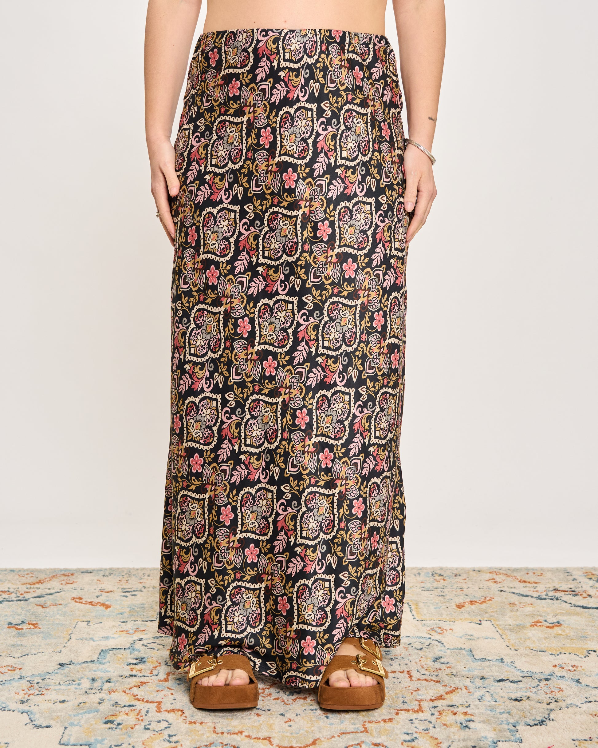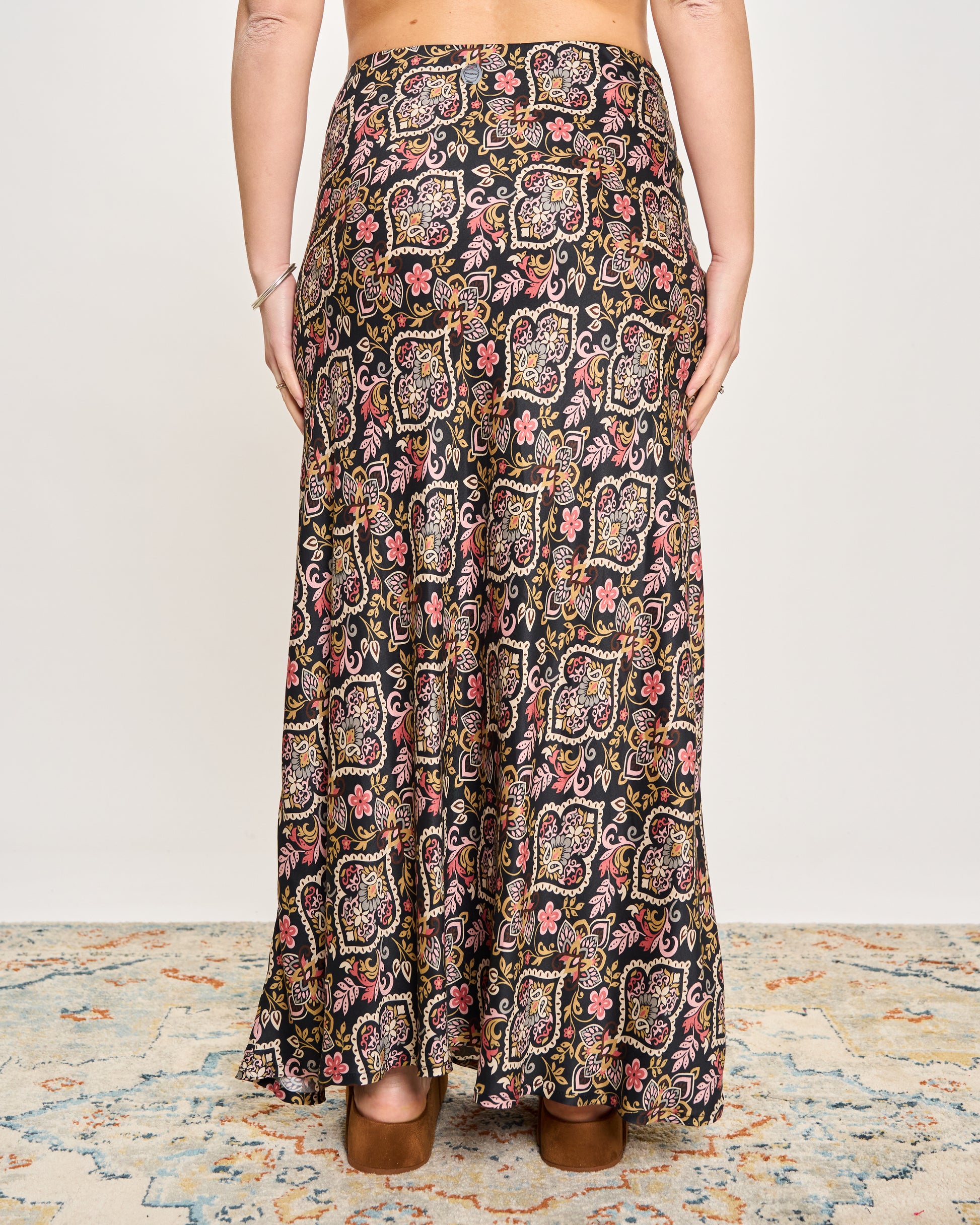 Gonna in viscosa stampata con fantasia cashmere con elastico in vita e orlo sul fondo.