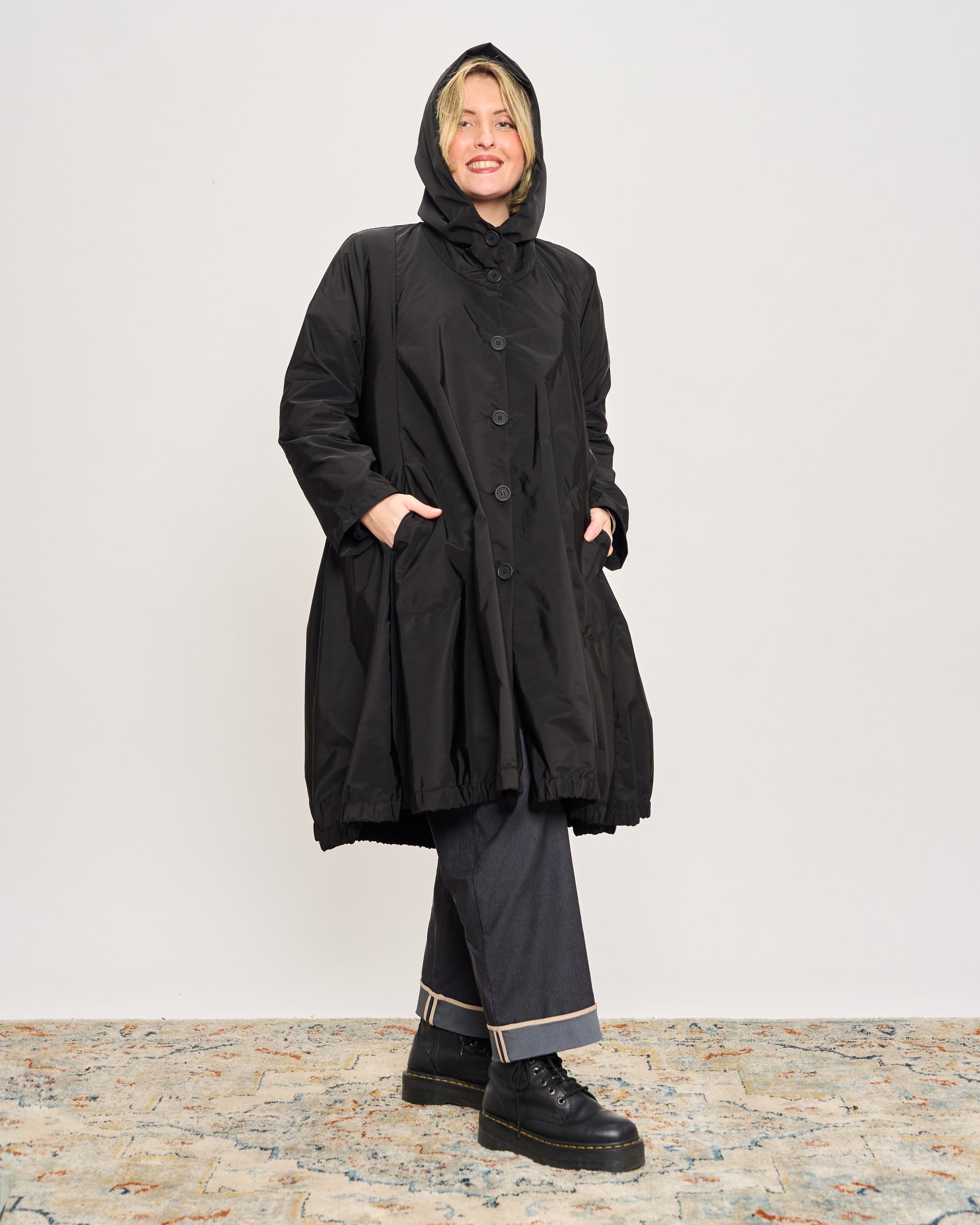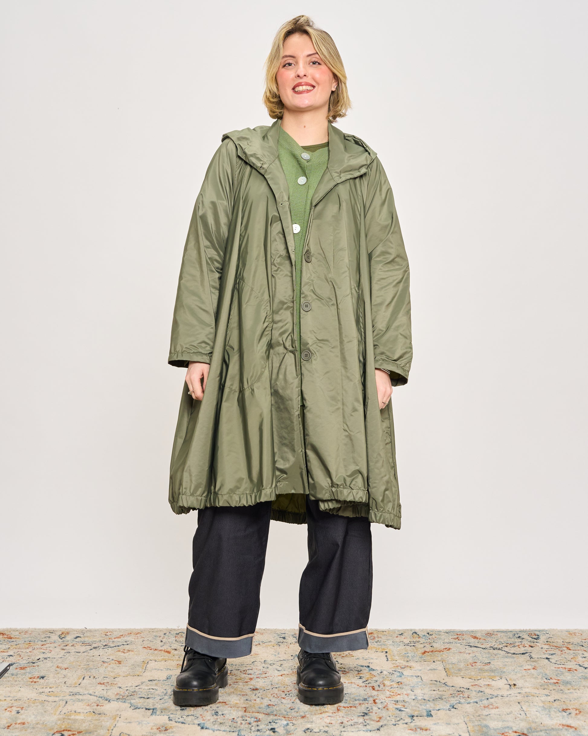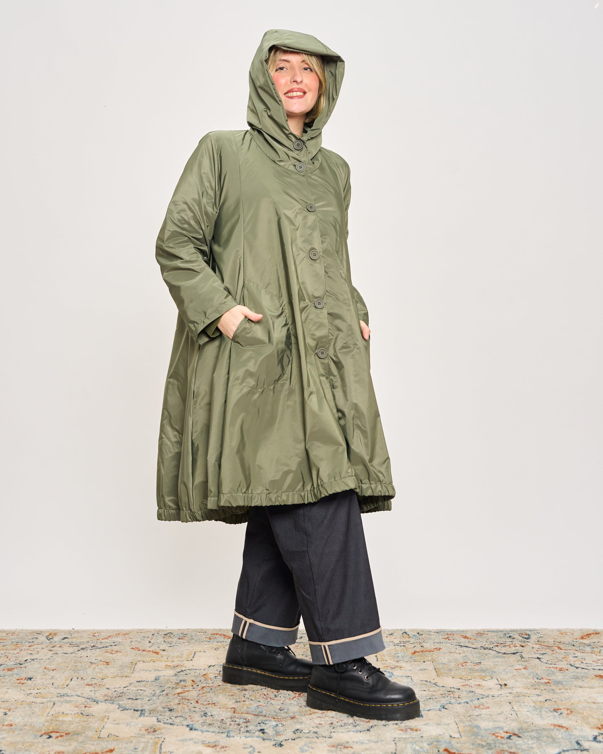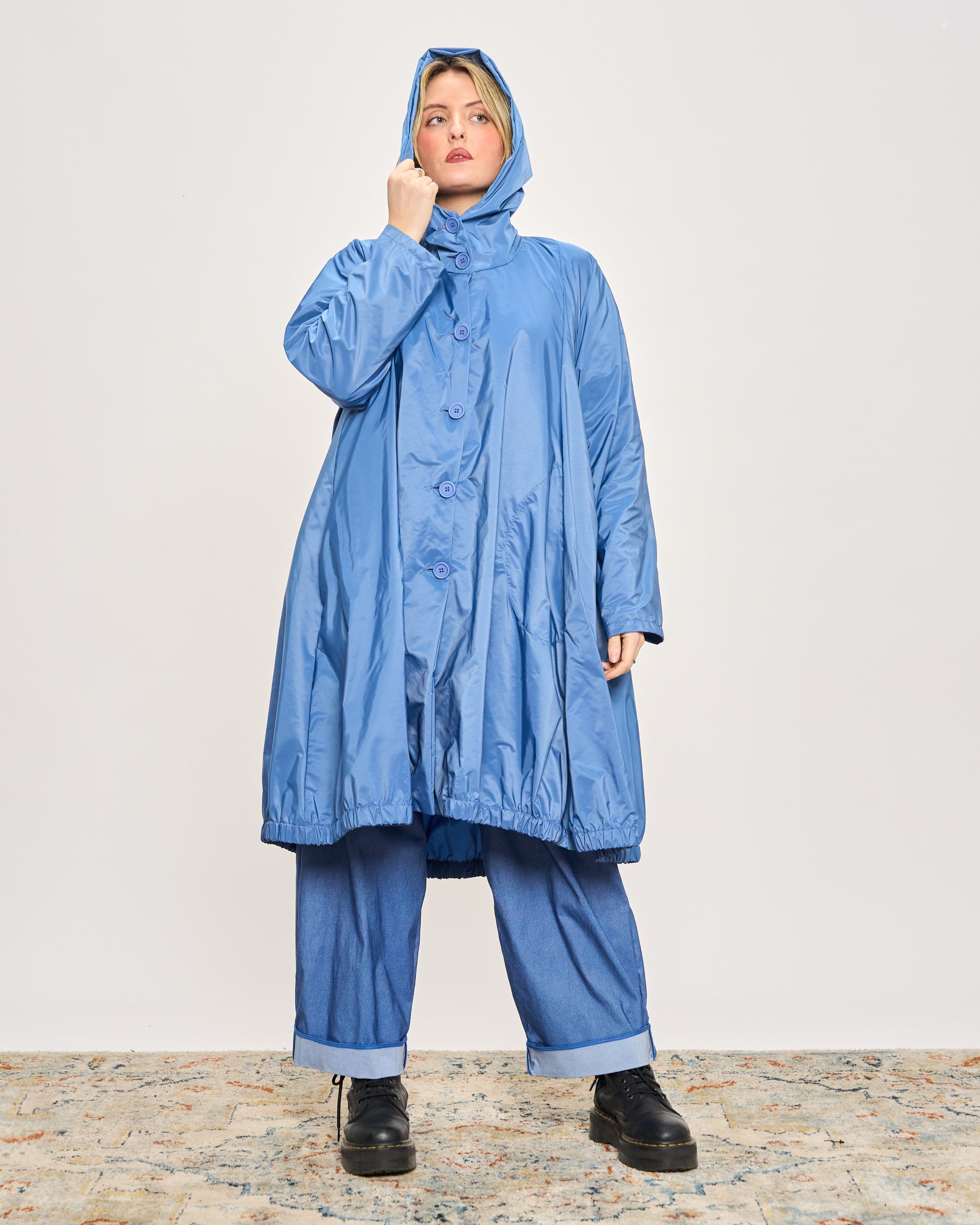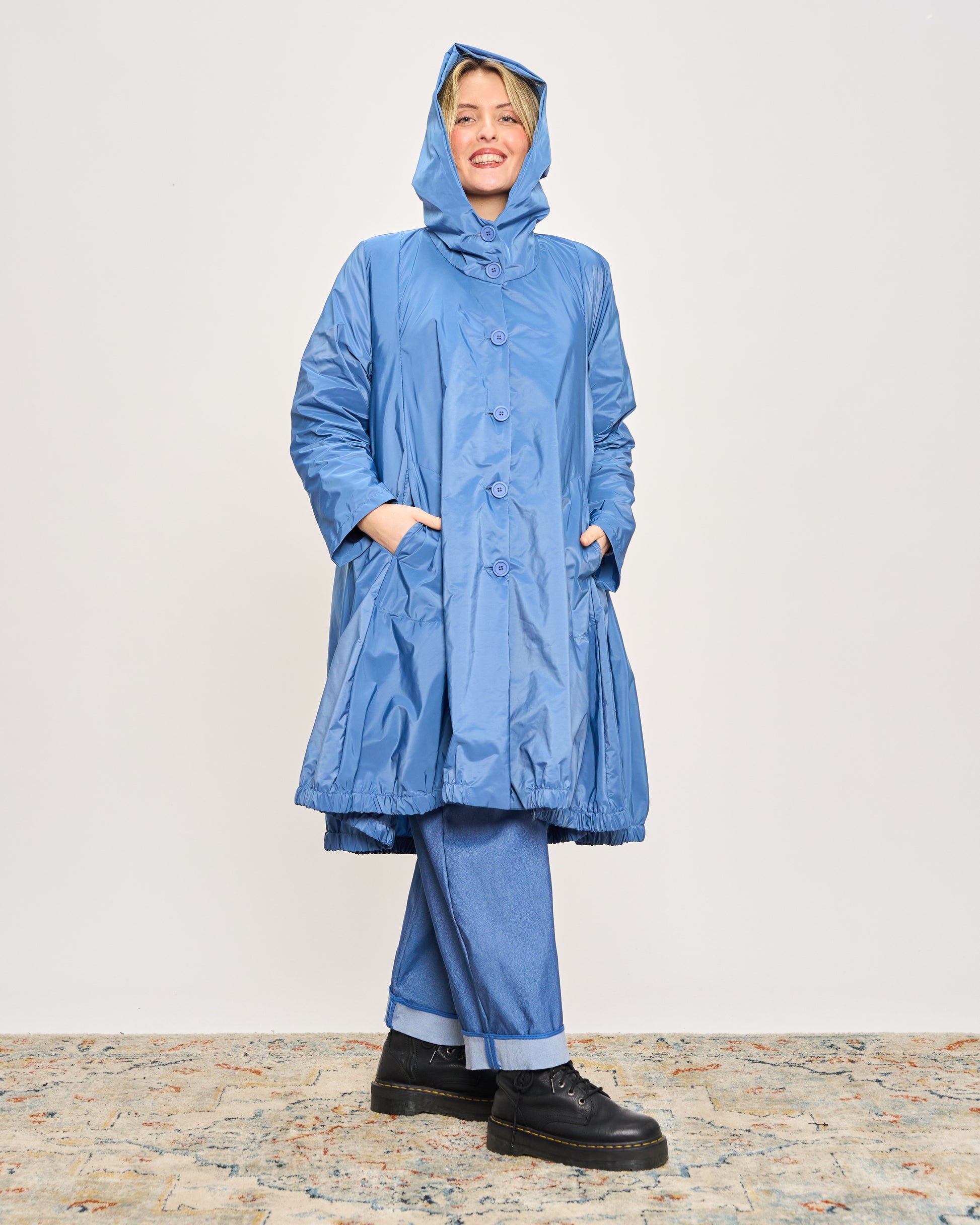 Impermeabile in tessuto memory stropicciato con cappuccio, tasche sui fianchi e chiusura con bottoni.
