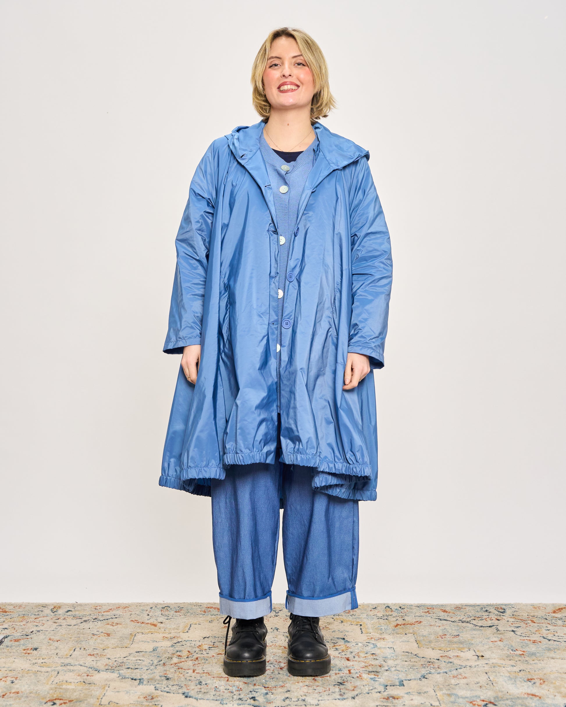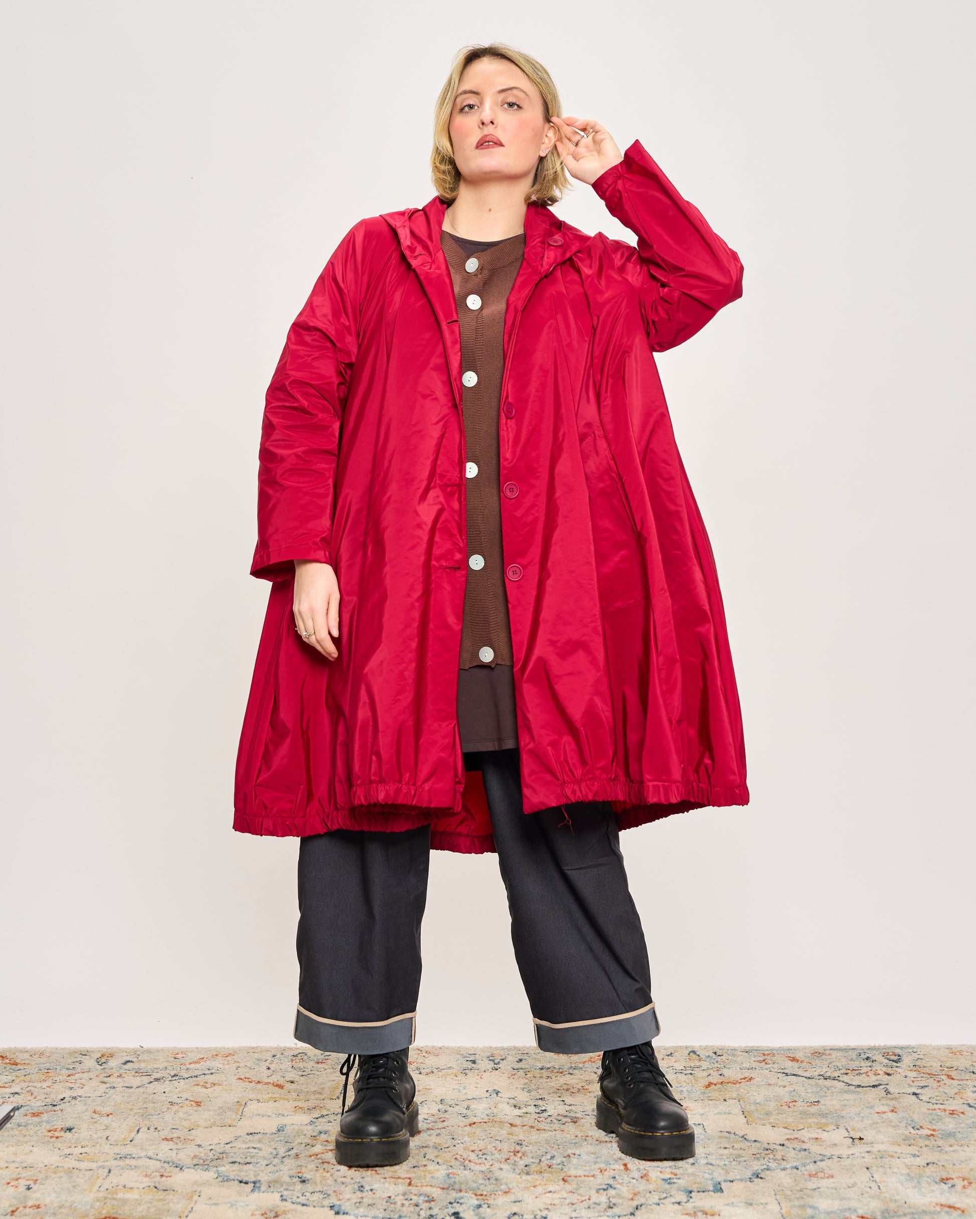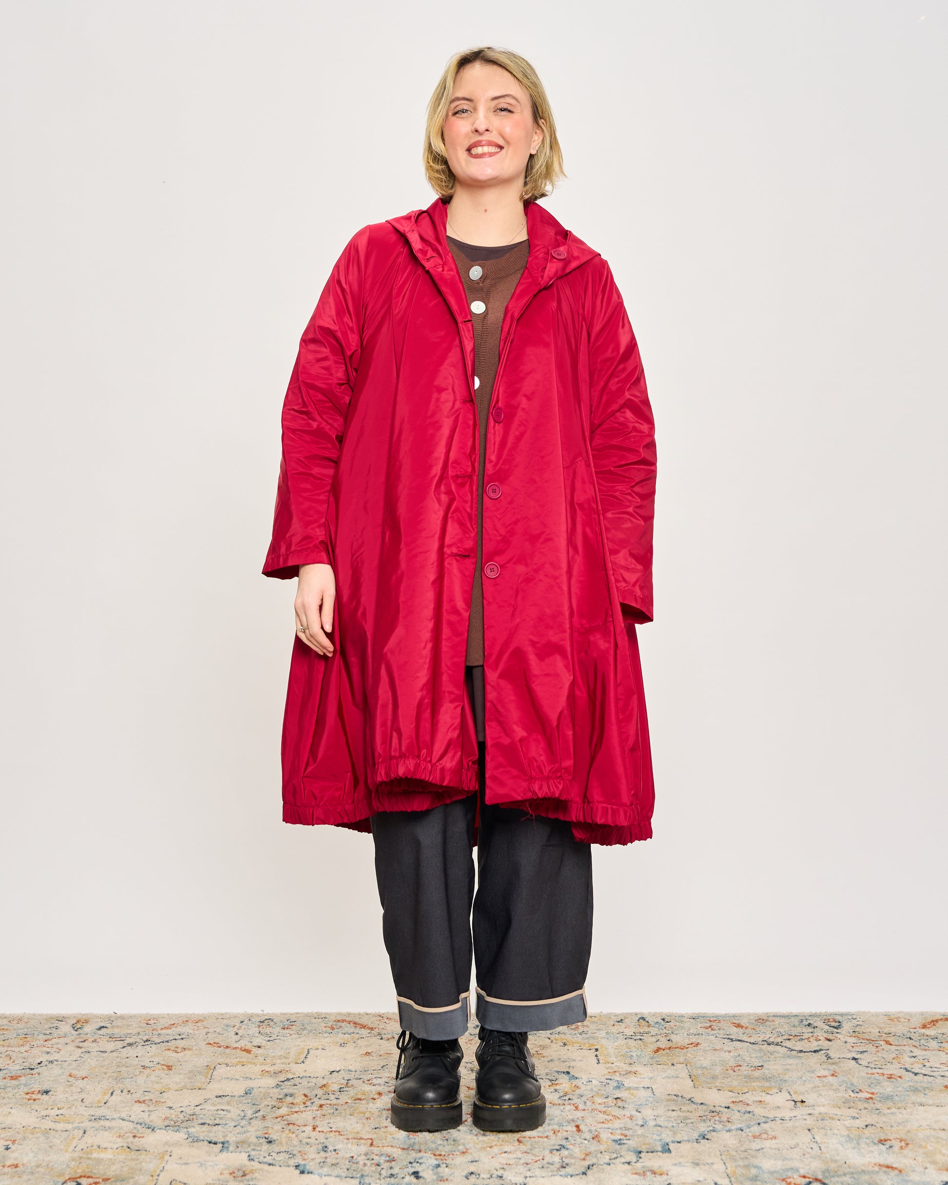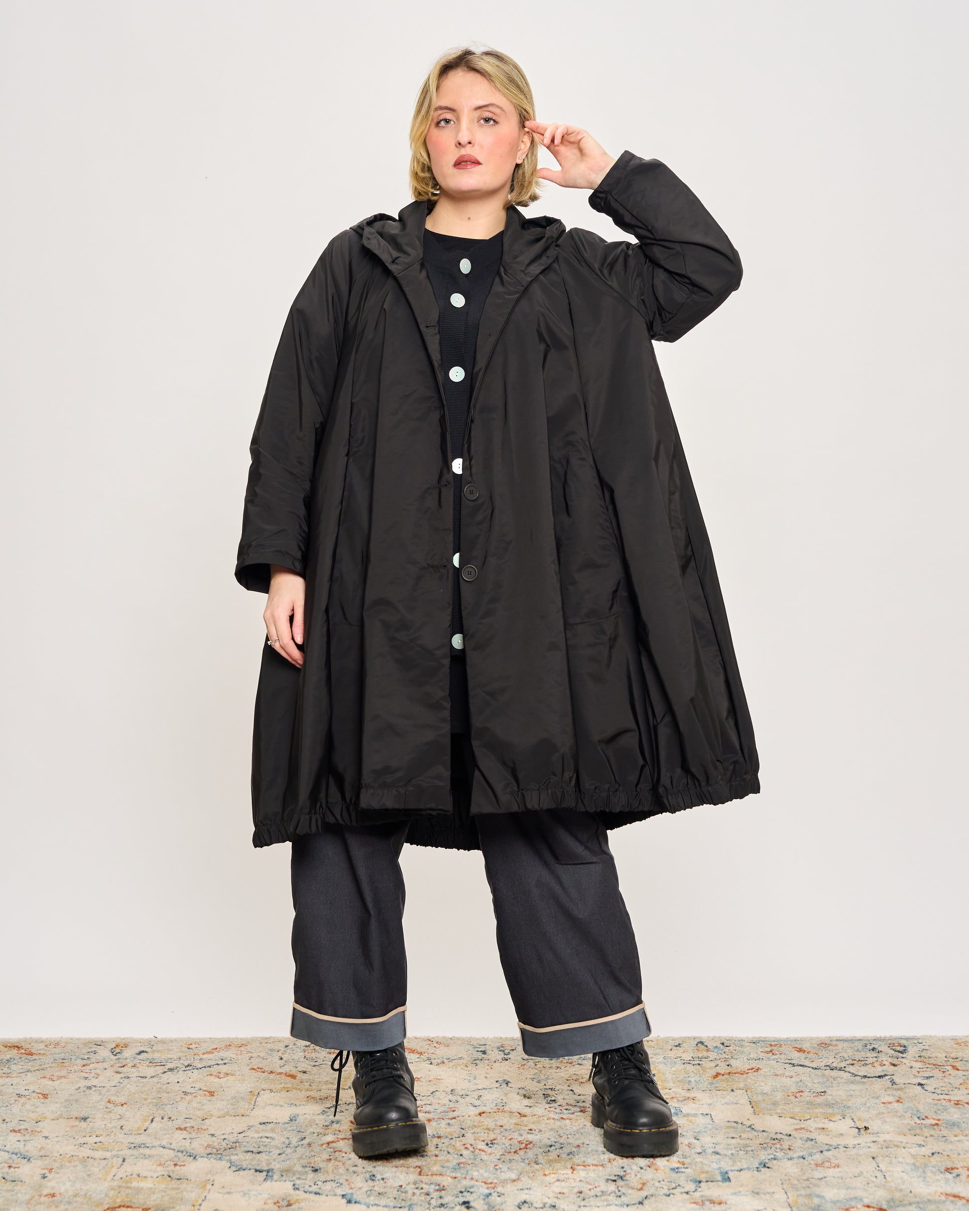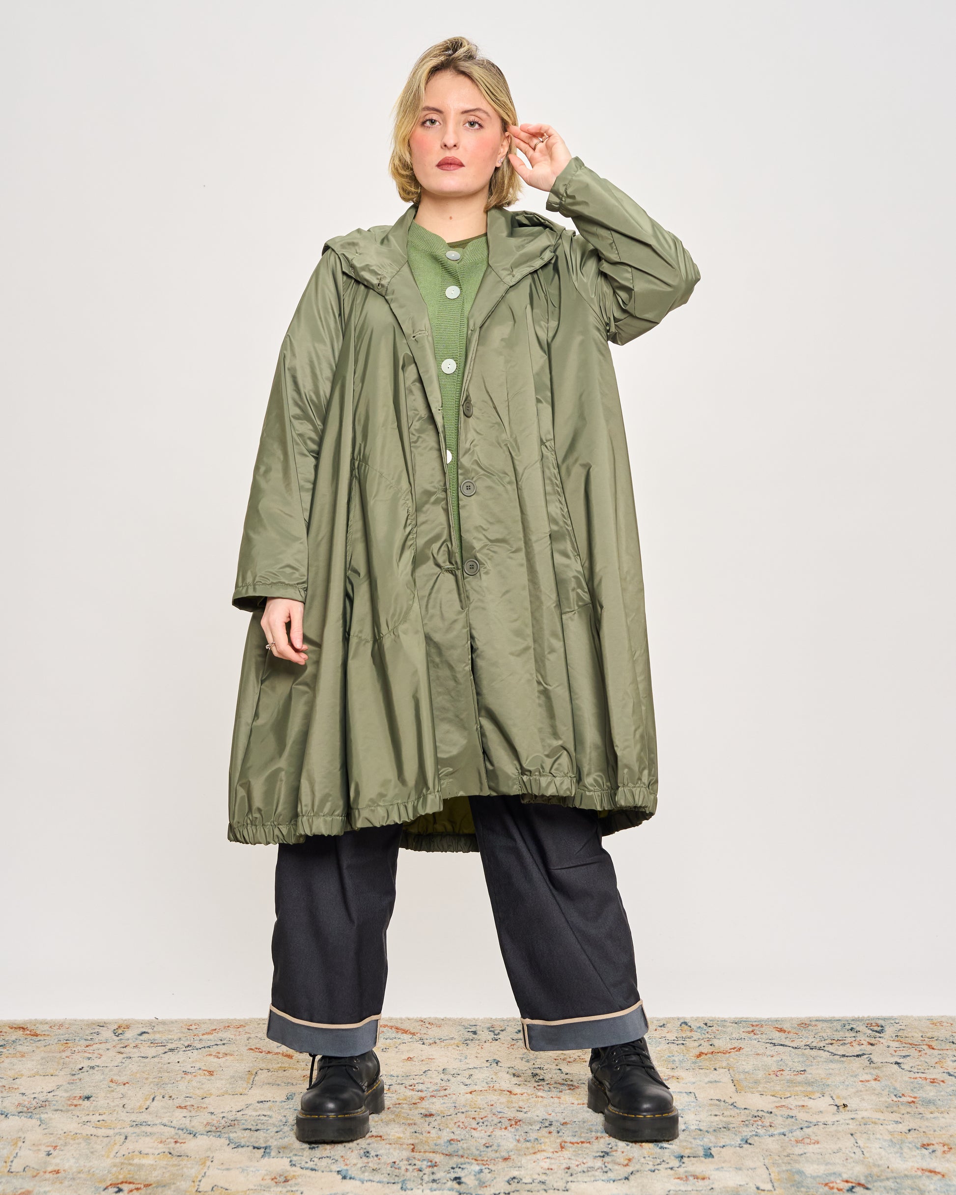 Impermeabile in tessuto memory stropicciato con cappuccio, tasche sui fianchi e chiusura con bottoni.