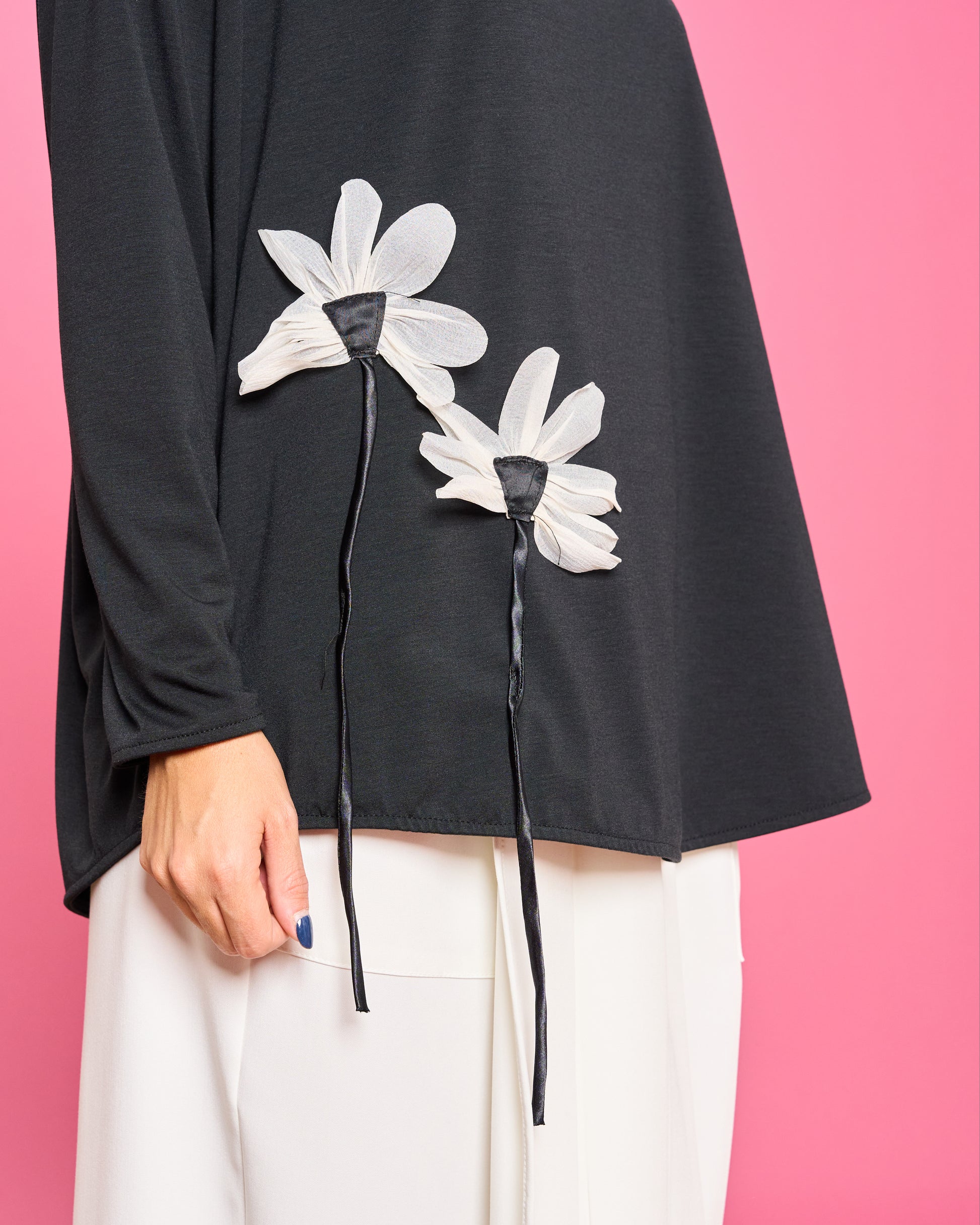 Maglia oversize con tasche sui fianchi, manica calata a 3/4 e fiori applicati sul davanti