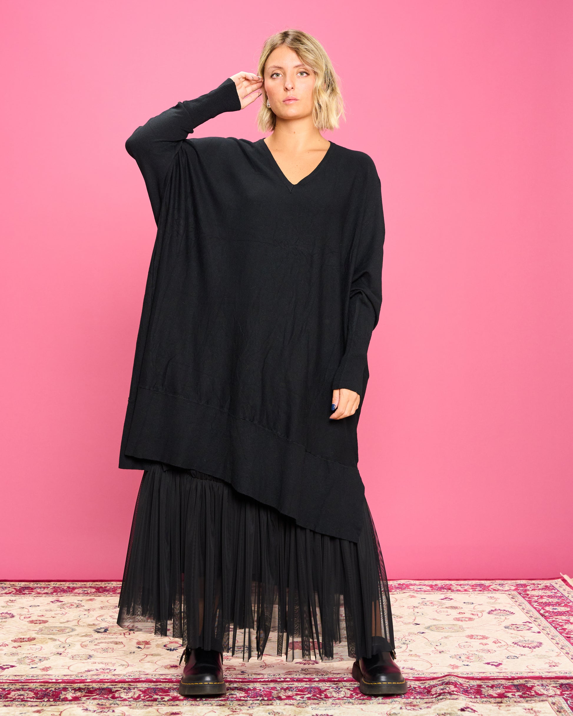 Maxi maglia in maglieria pettinata misto viscosa con scollo a V e balze a coste sulle maniche.