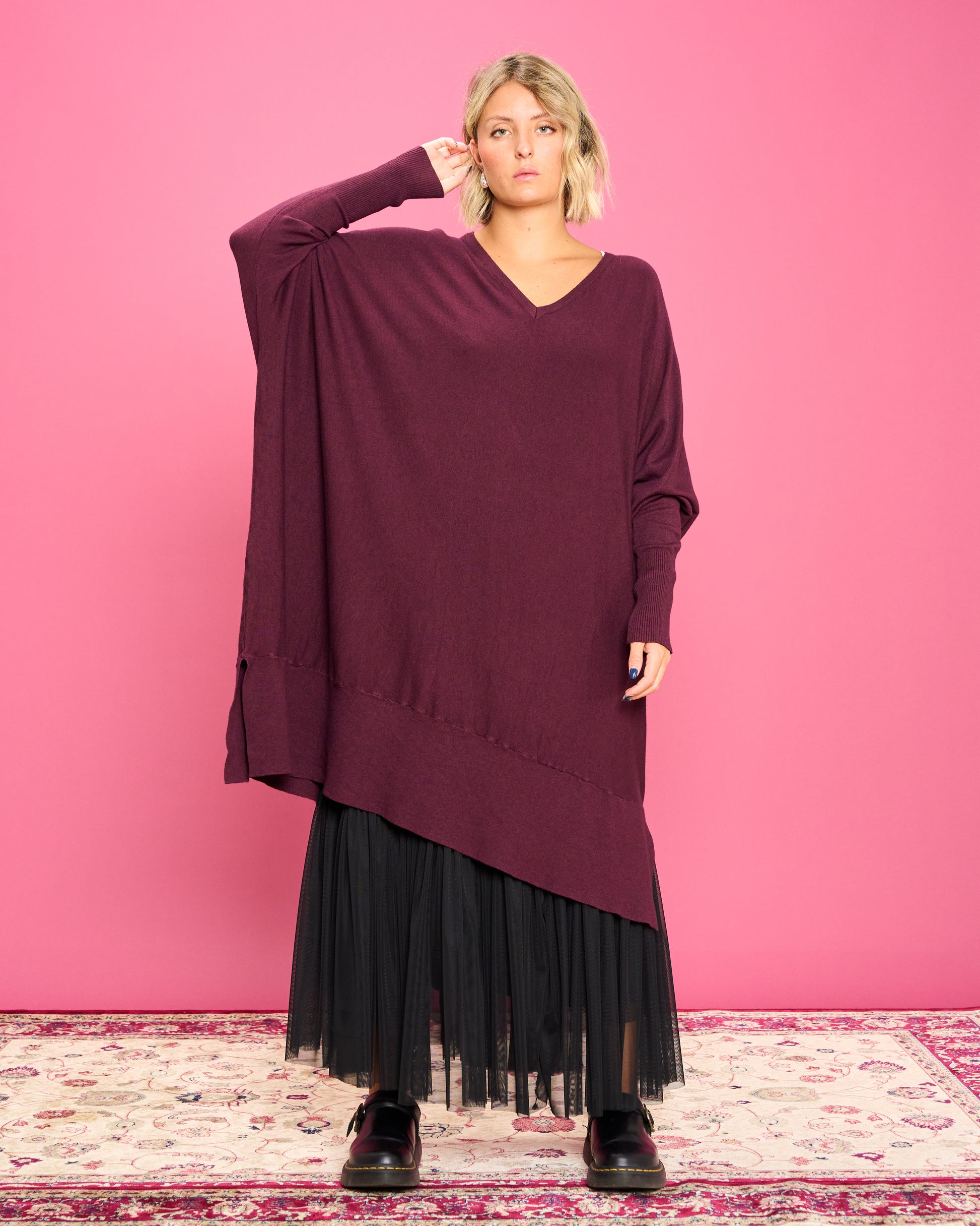 Maxi maglia in maglieria pettinata misto viscosa con scollo a V e balze a coste sulle maniche.