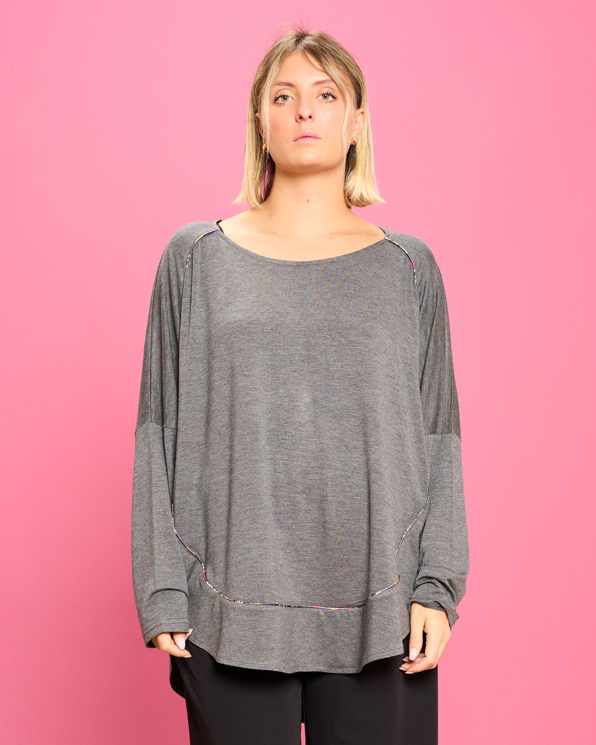 Maxi maglia rotonda in viscosa bordata con dettaglio bordo fantasia sul davanti, manica raglan e stondatura sul fondo.