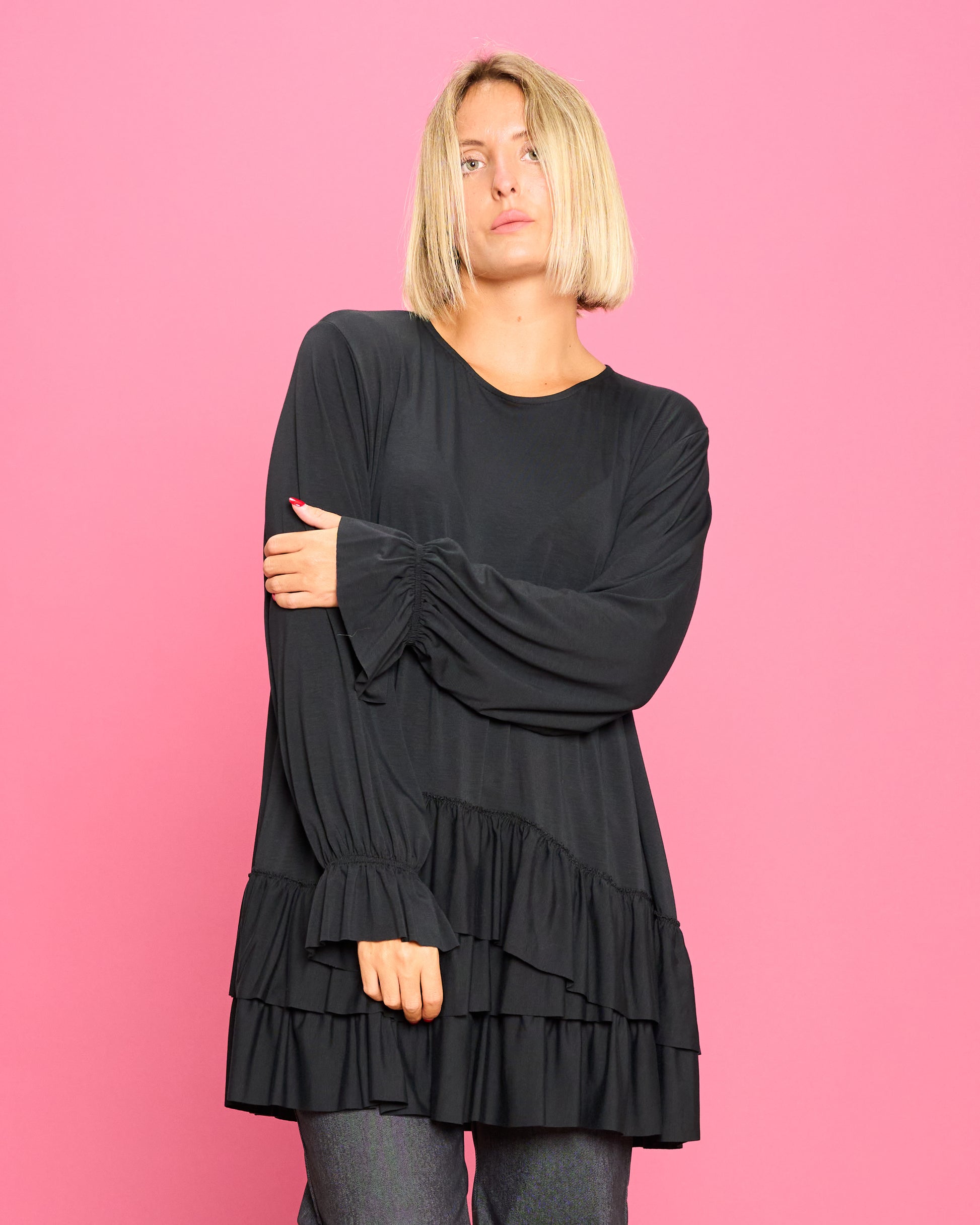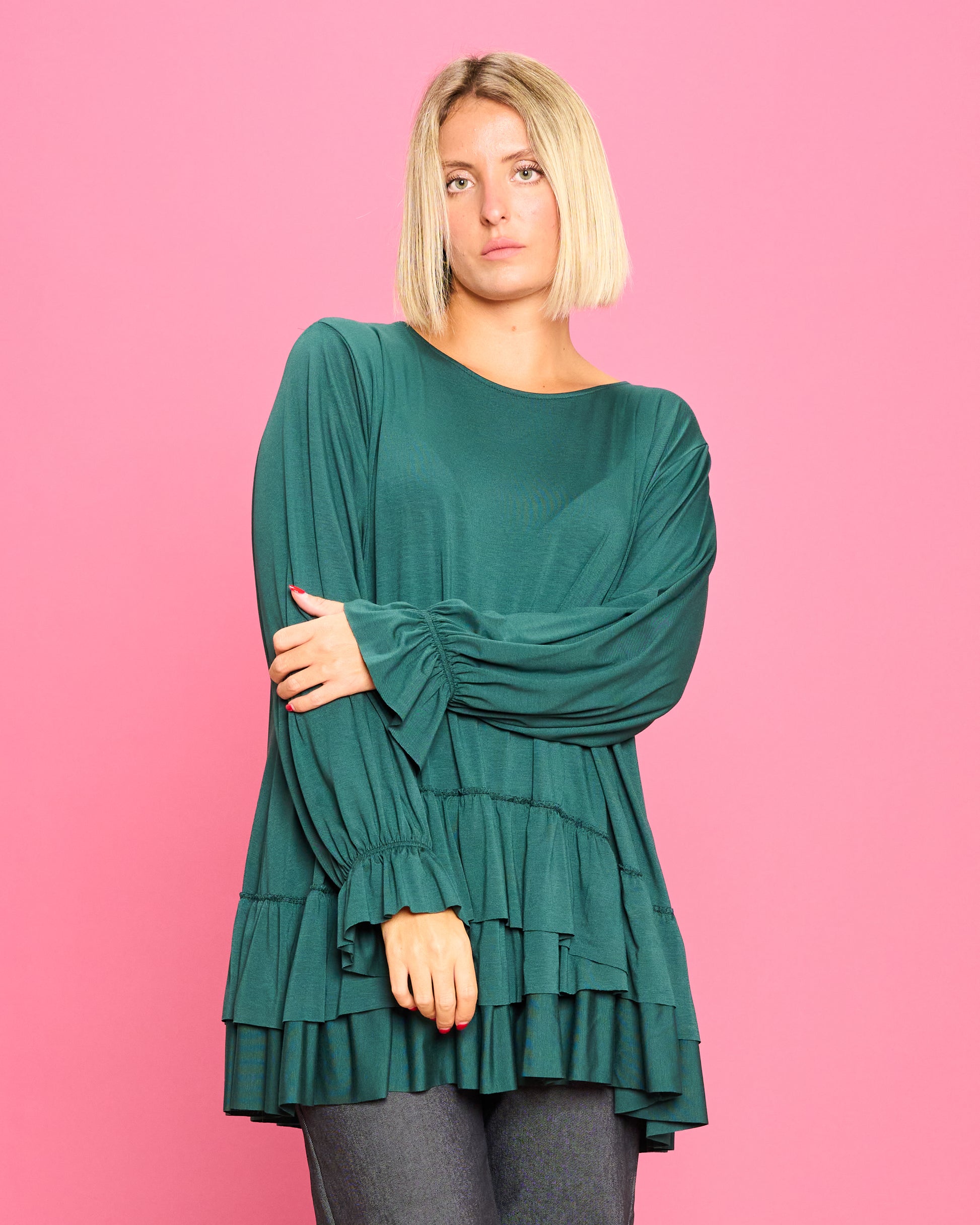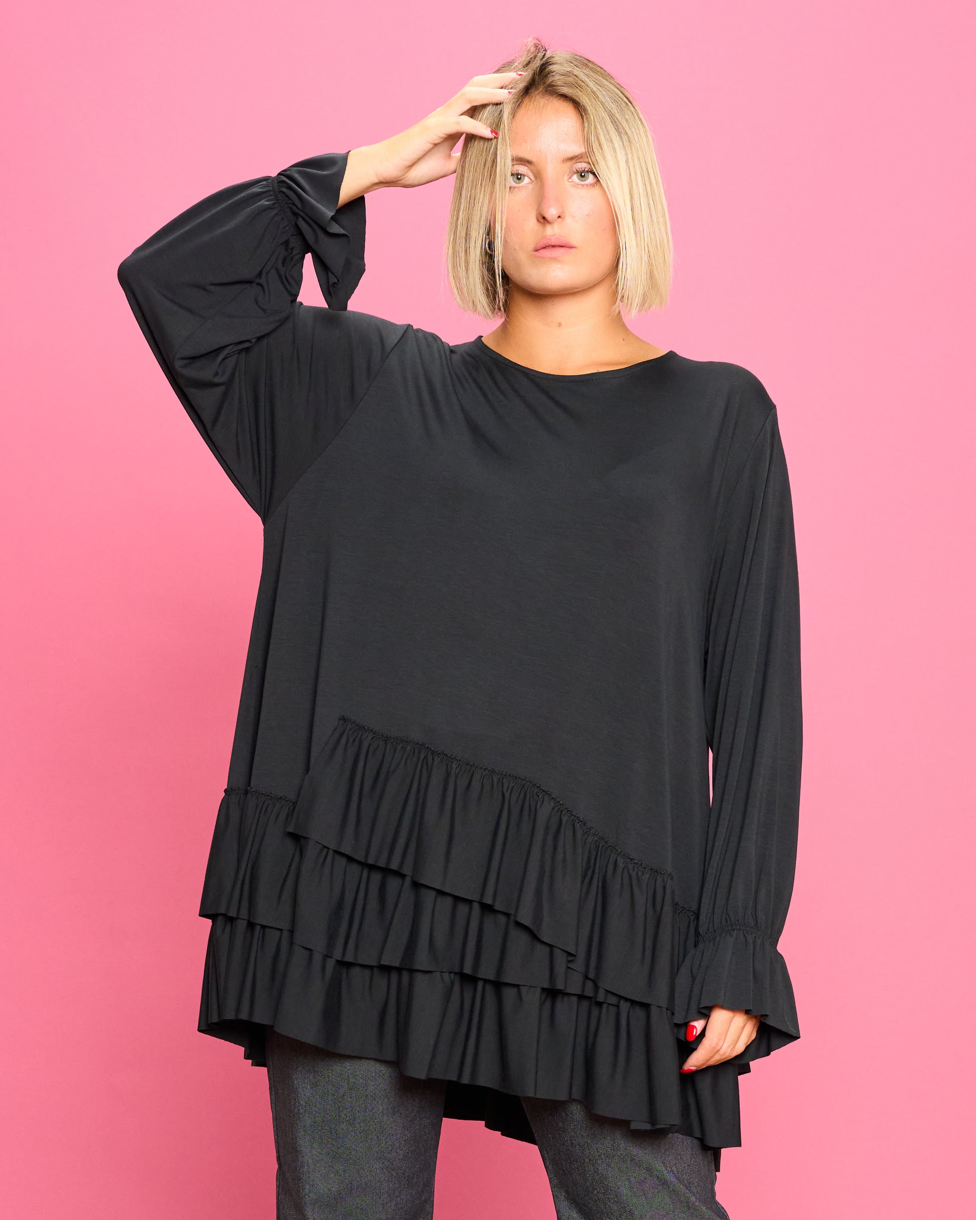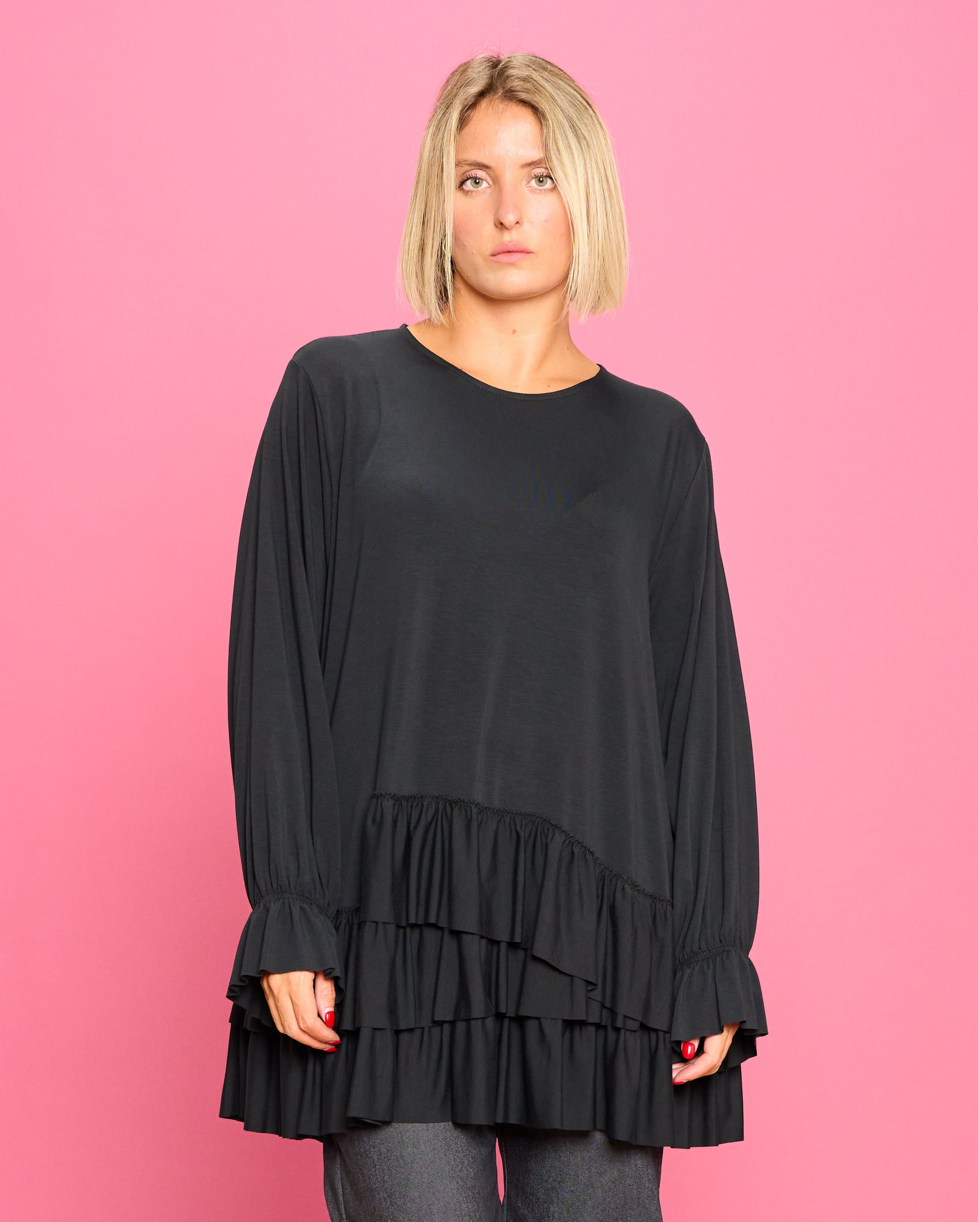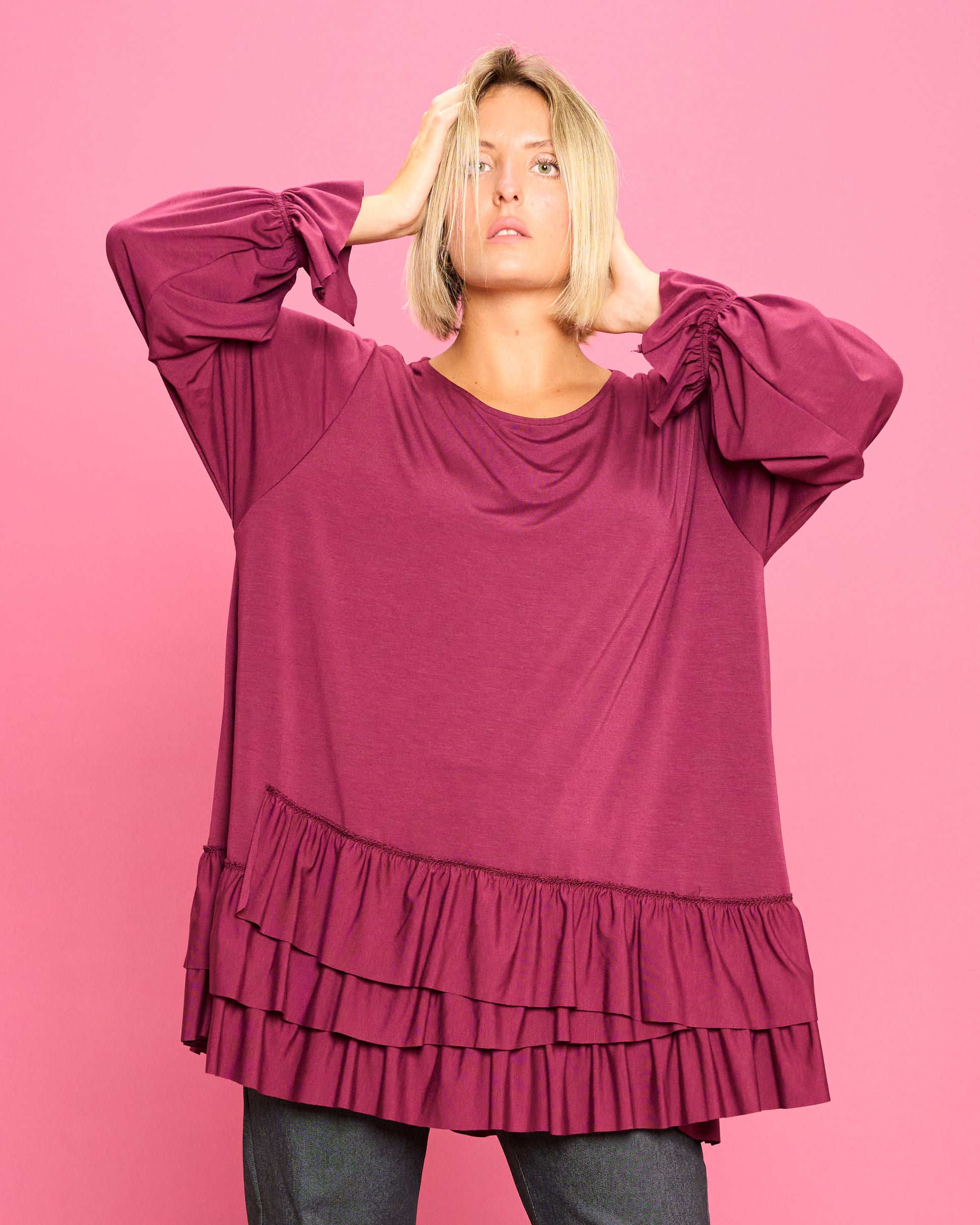 Maximaglia in viscosa con manica raglan e doppia gala sul fondo.