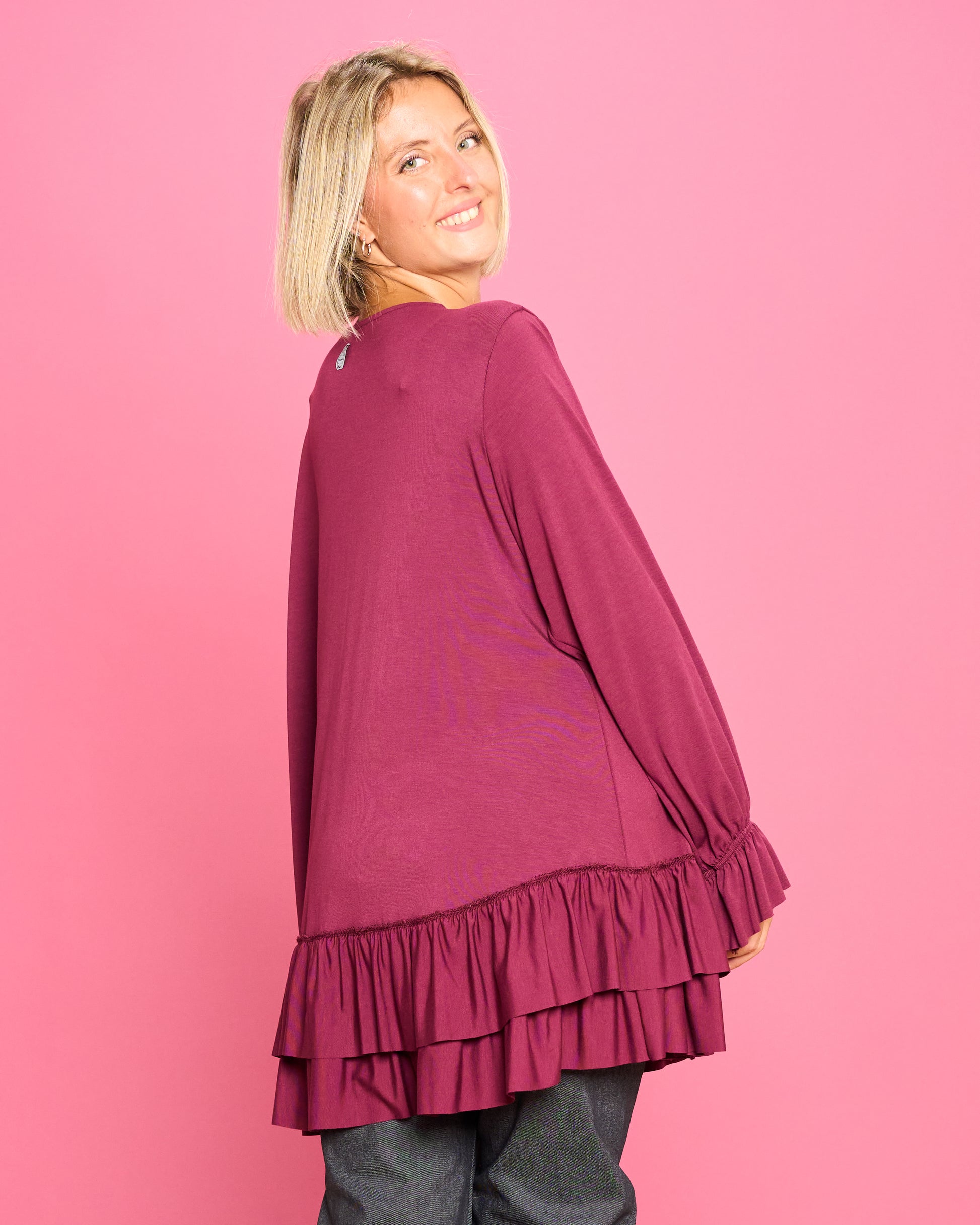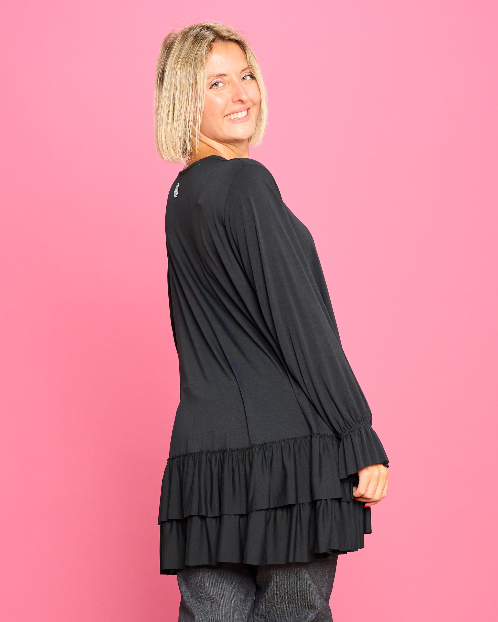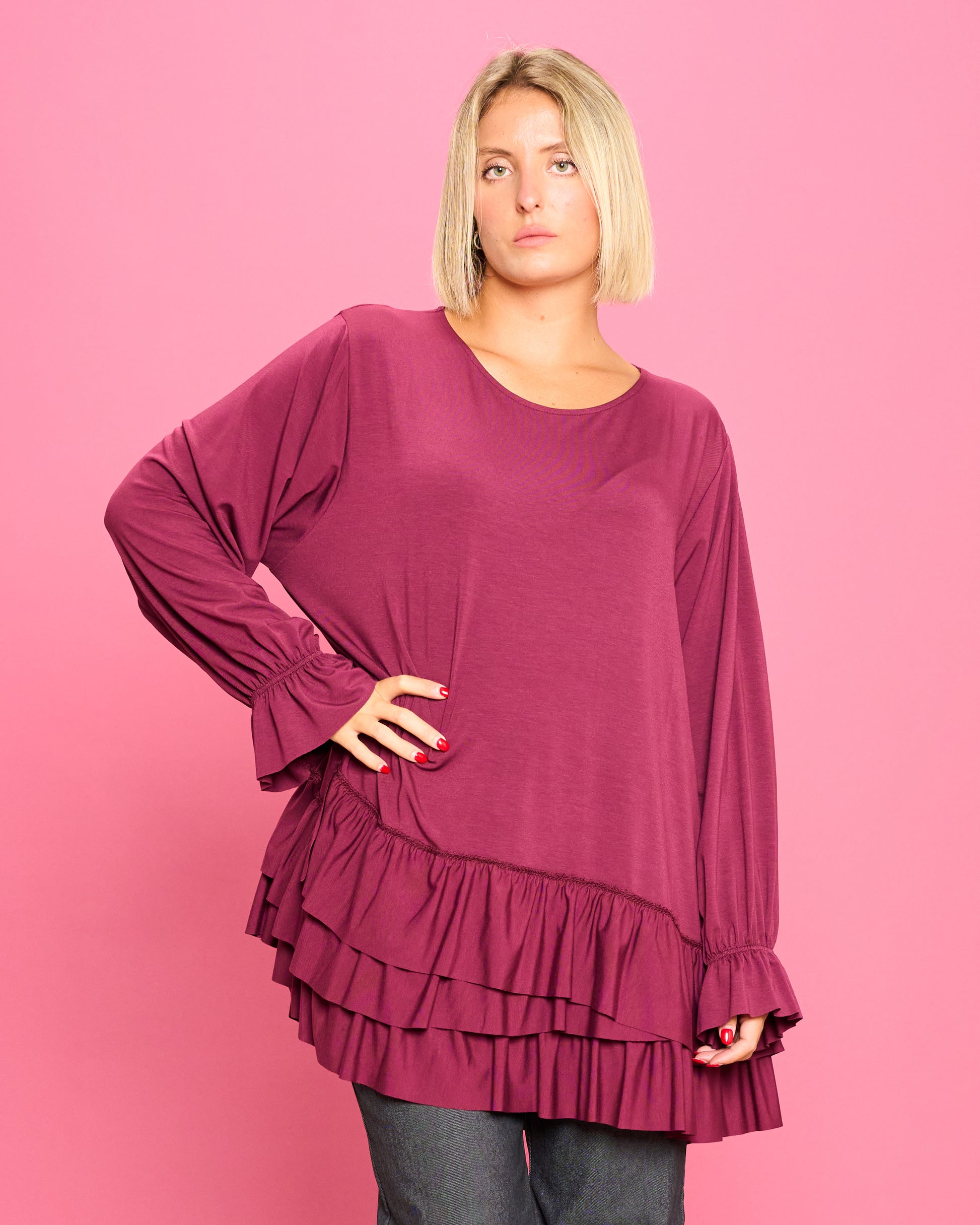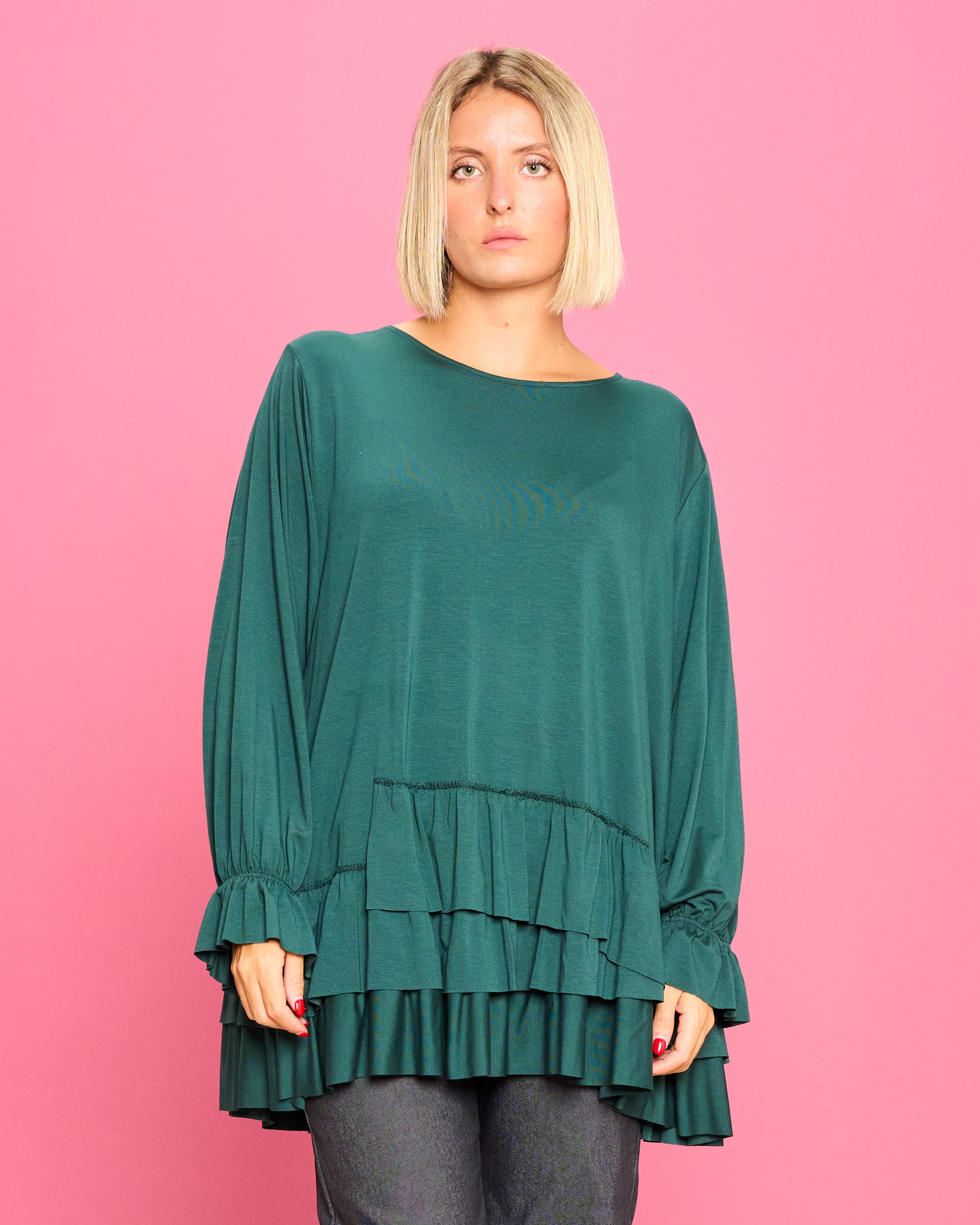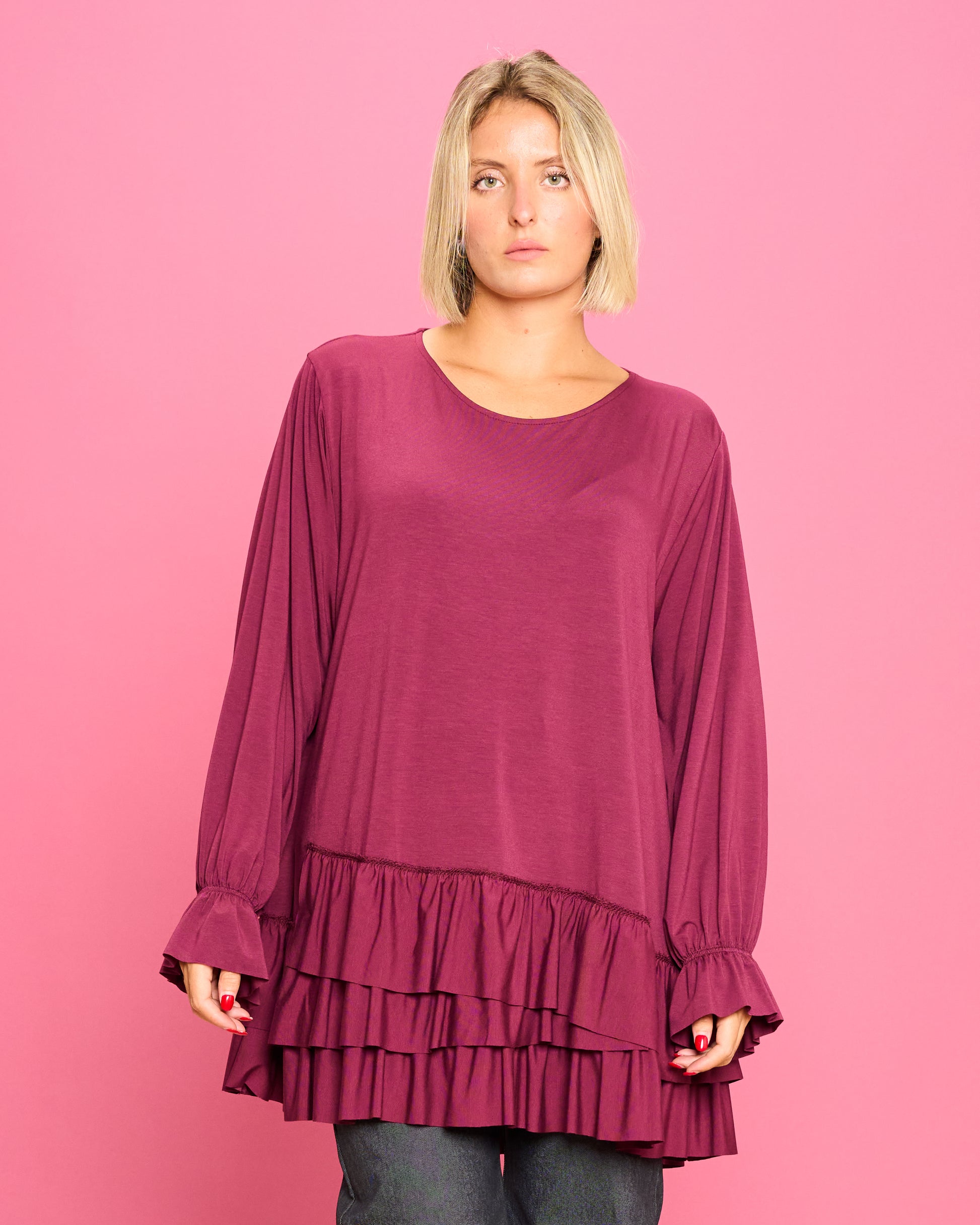 Maximaglia in viscosa con manica raglan e doppia gala sul fondo.