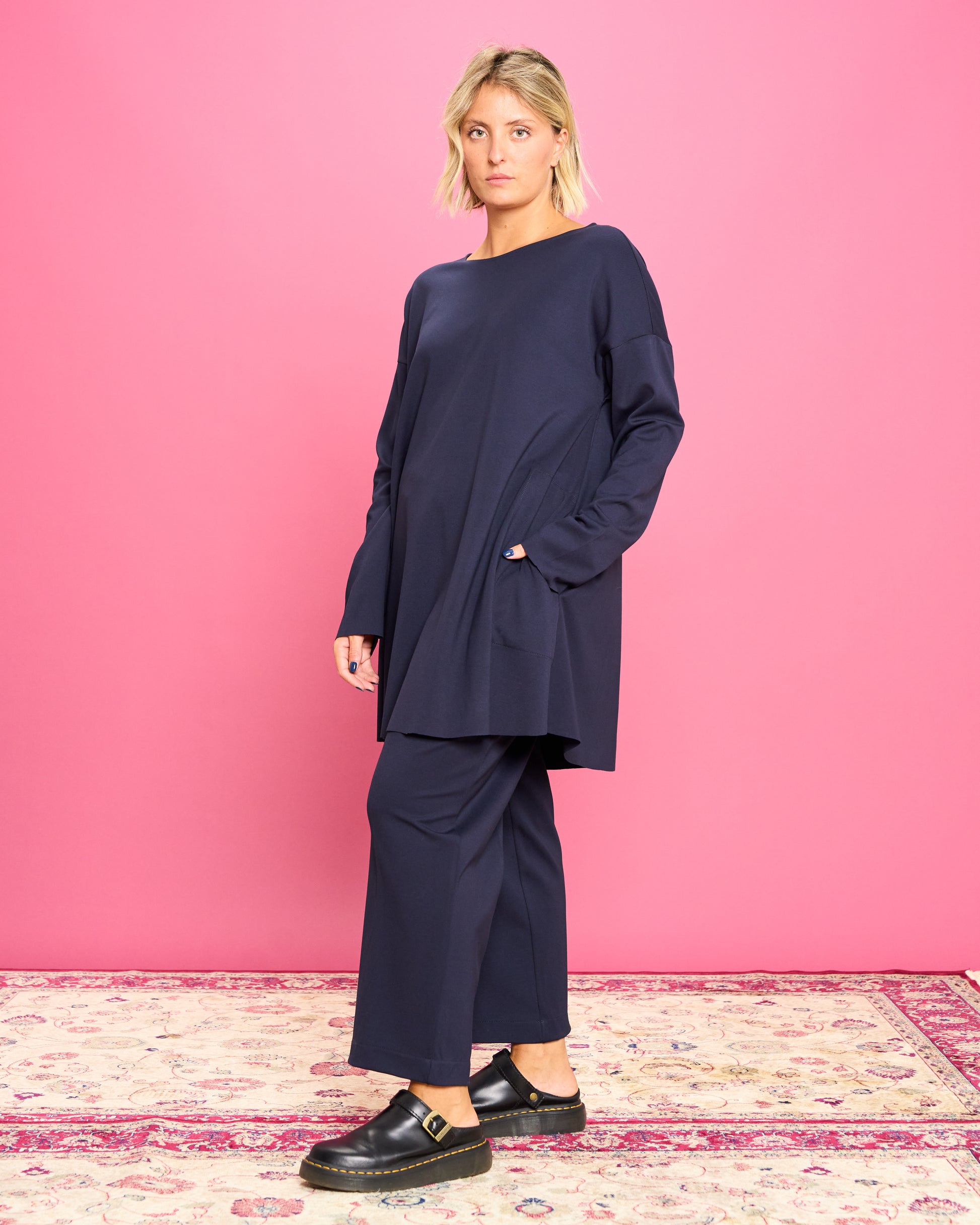 Maximaglia in maglia stoffa bi-elastica con scollo a barca, tasche sui fianchi e finitura in taglio vivo su bordo e su manica a scatola