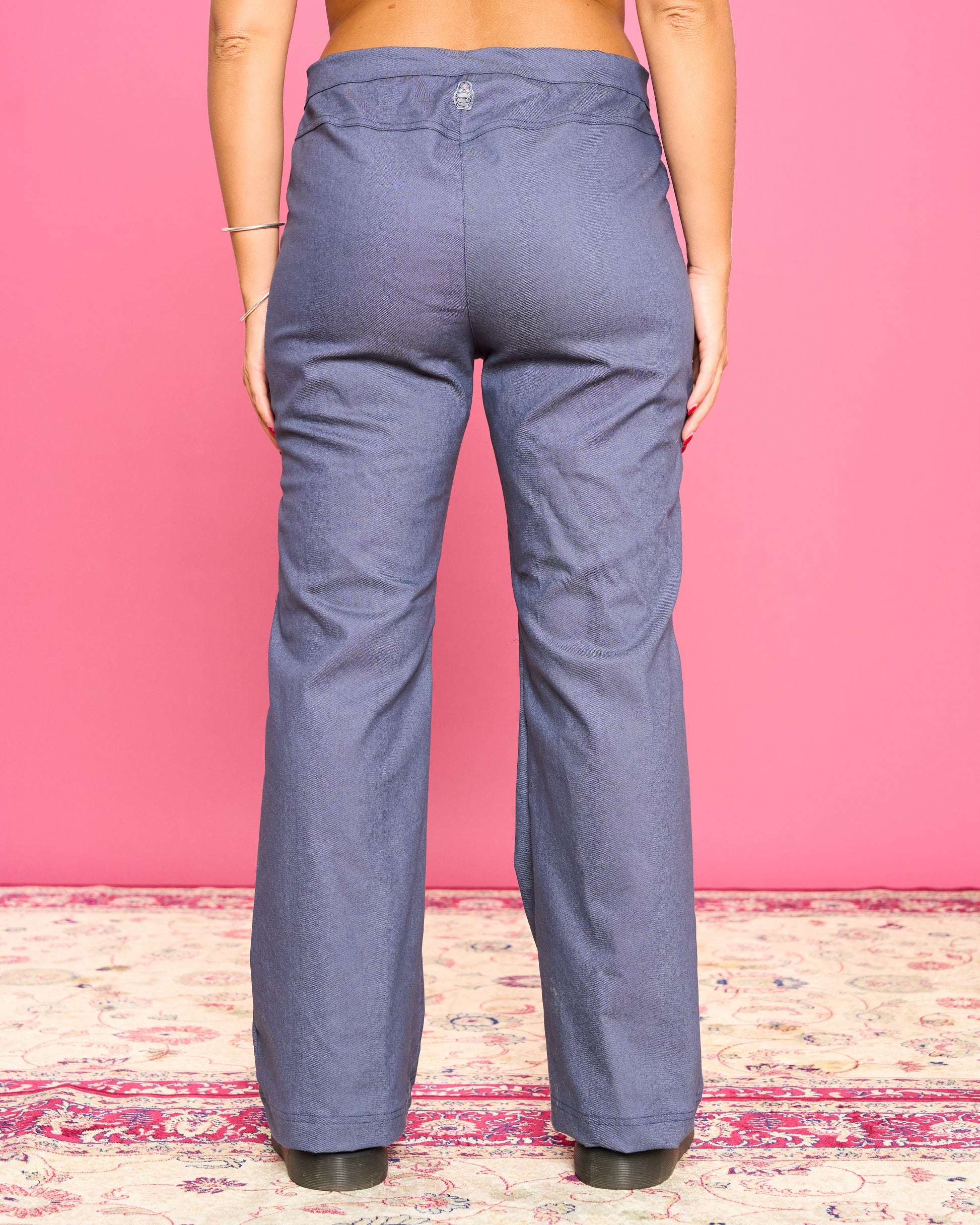 Pantaloni  in jeans elasticizzato scampanato con tasche sui fianchi e abbottonatura sul davanti.