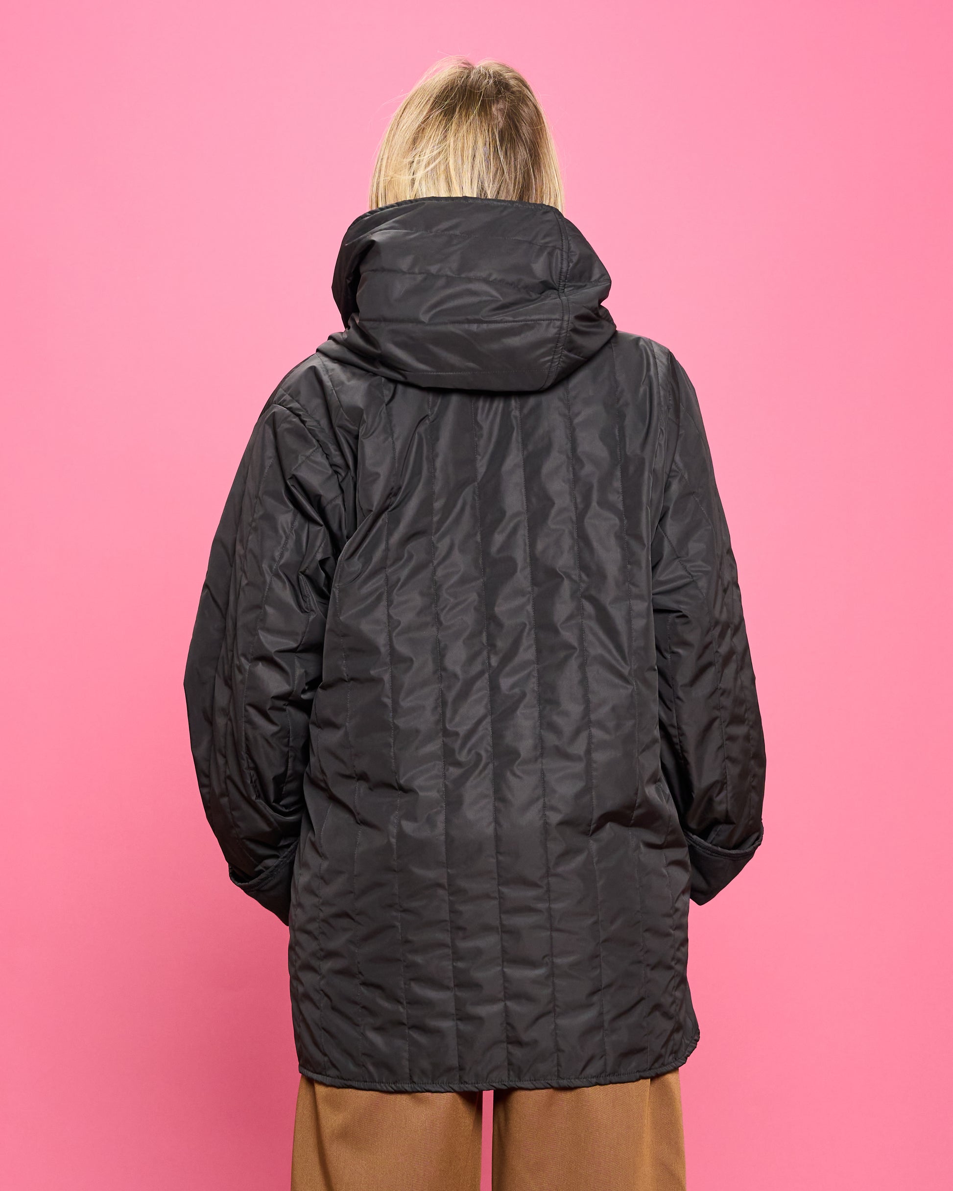 Piumino modello Kimono con cappuccio, tasche nei fianchi e fusacca da annodare.