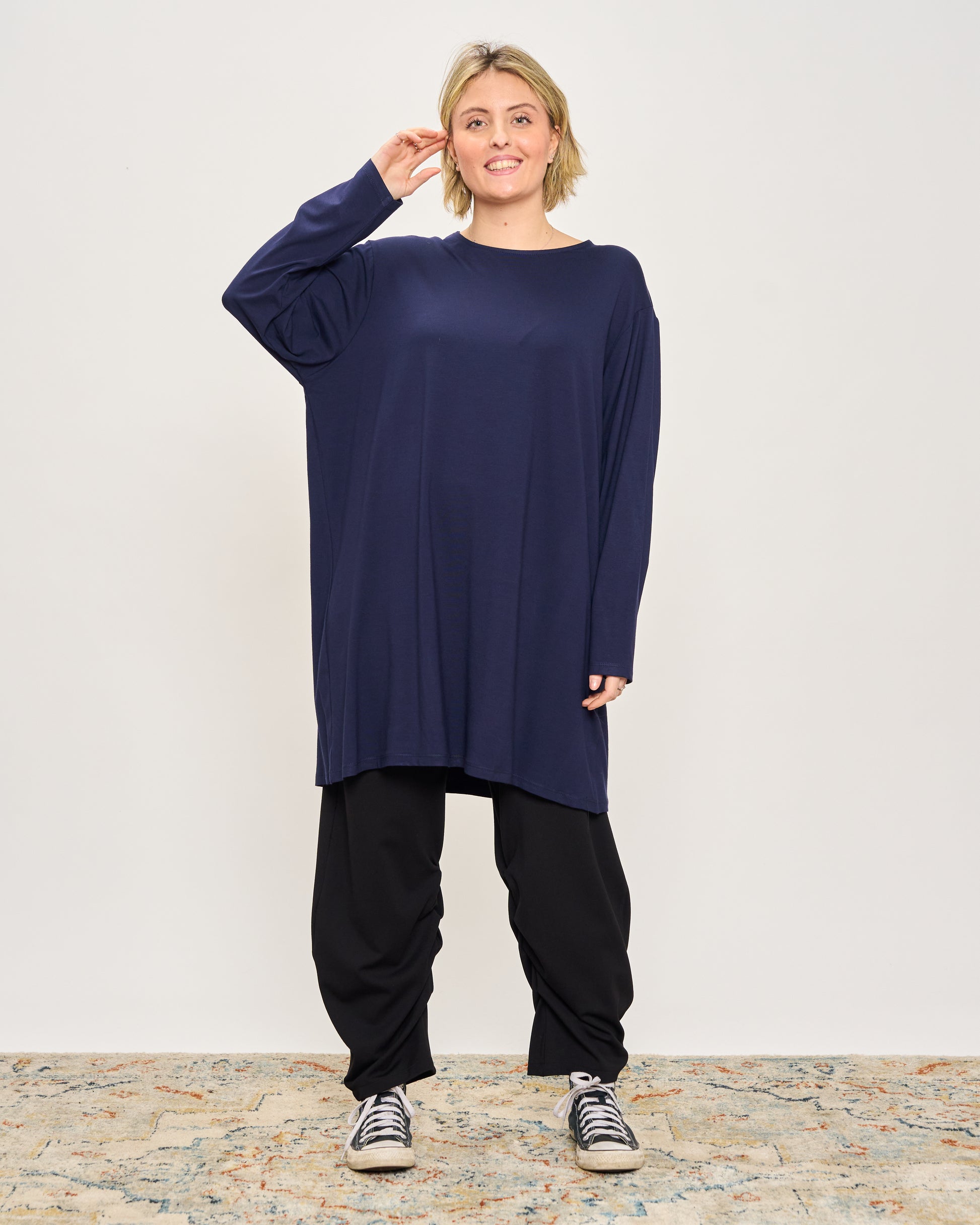La modella è alta 165 cm e indossa la S/M Misure: S/M: 130 cm circonferenza seno - 130 cm circonferenza fianchi - 86 cm di lunghezza - 55 cm di giro manica L/XL: 138 cm circonferenza seno - 146 cm circonferenza fianchi - 87 cm di lunghezza - 55 cm di giro manica