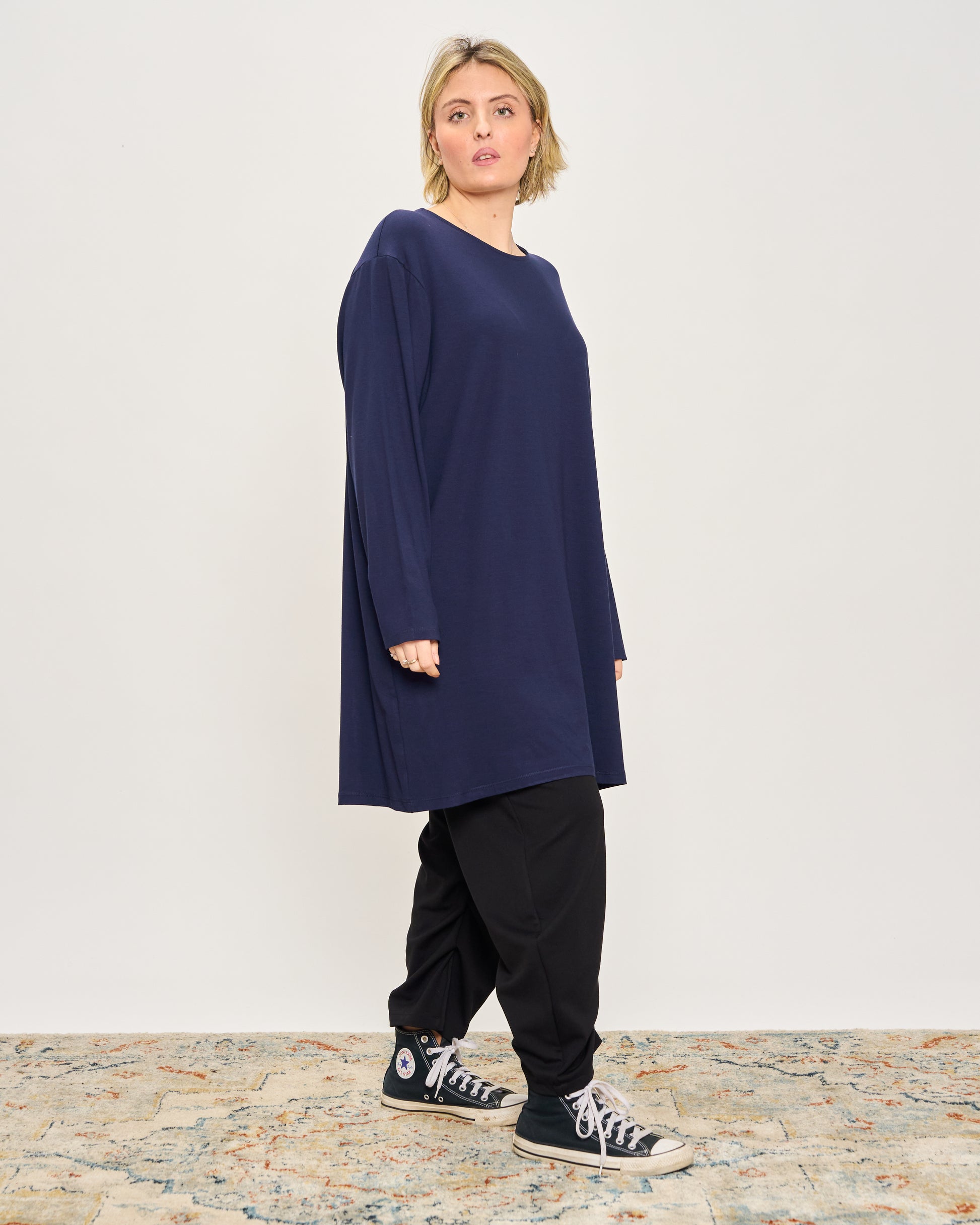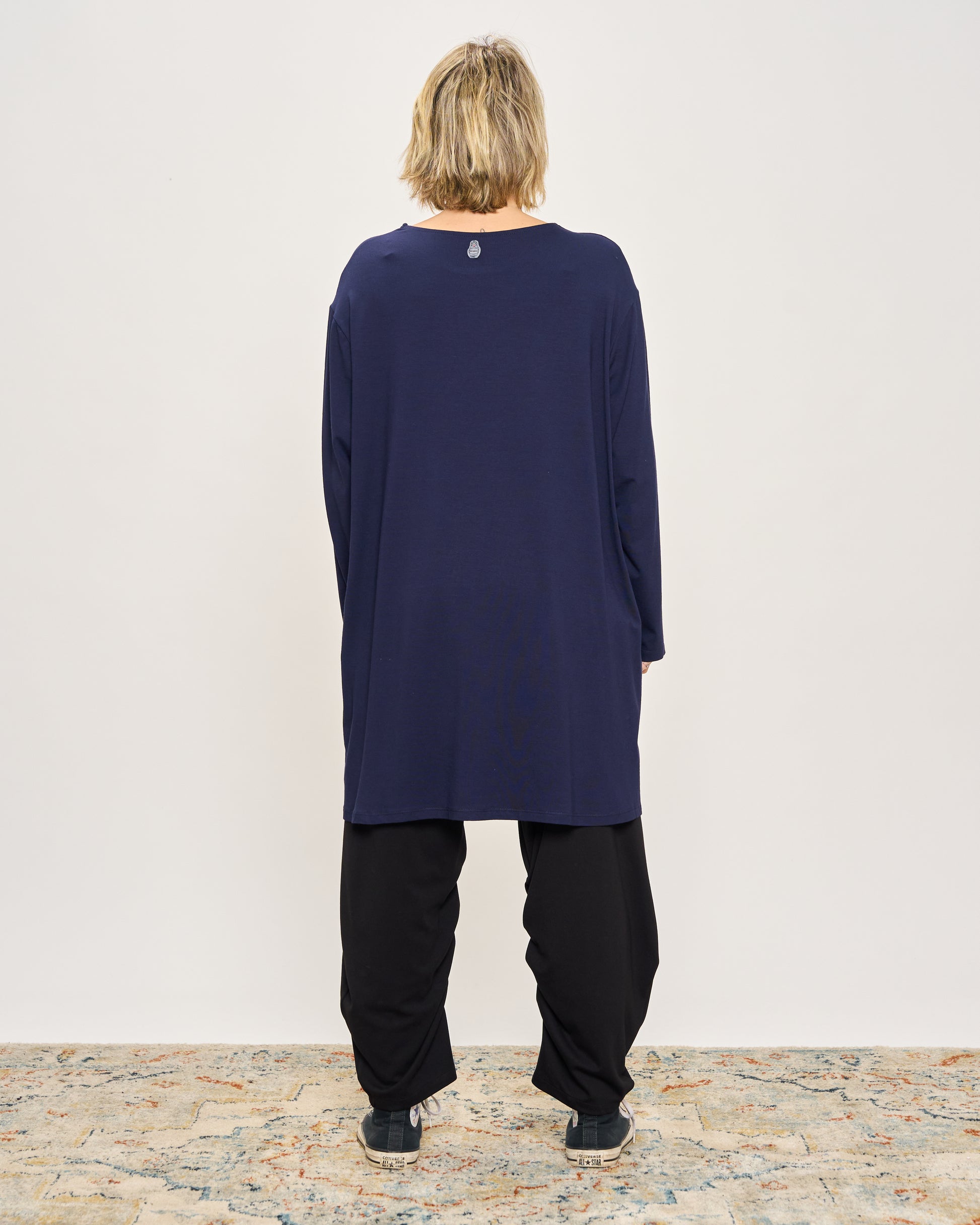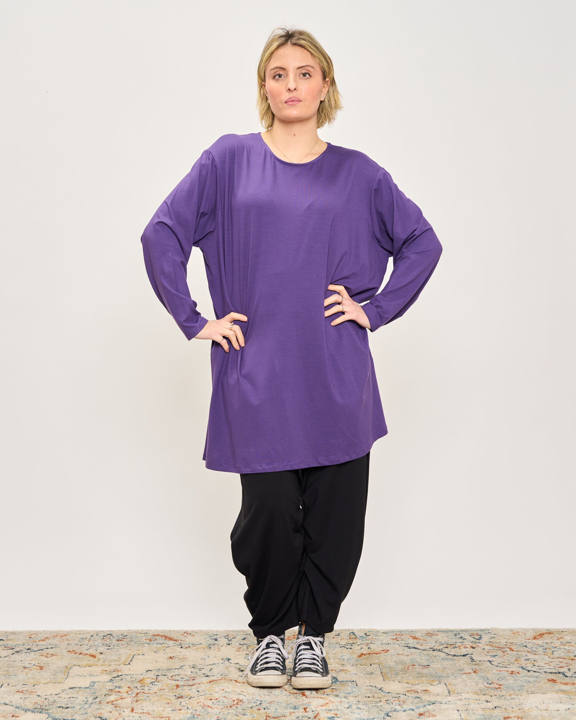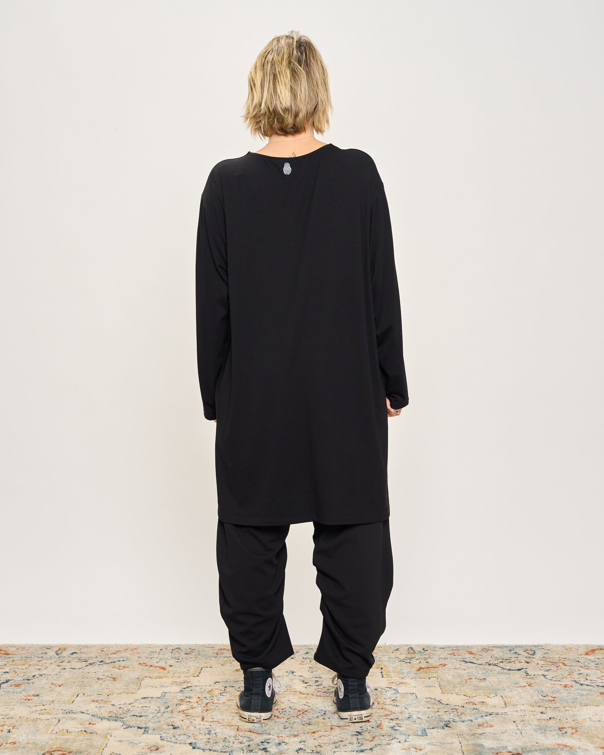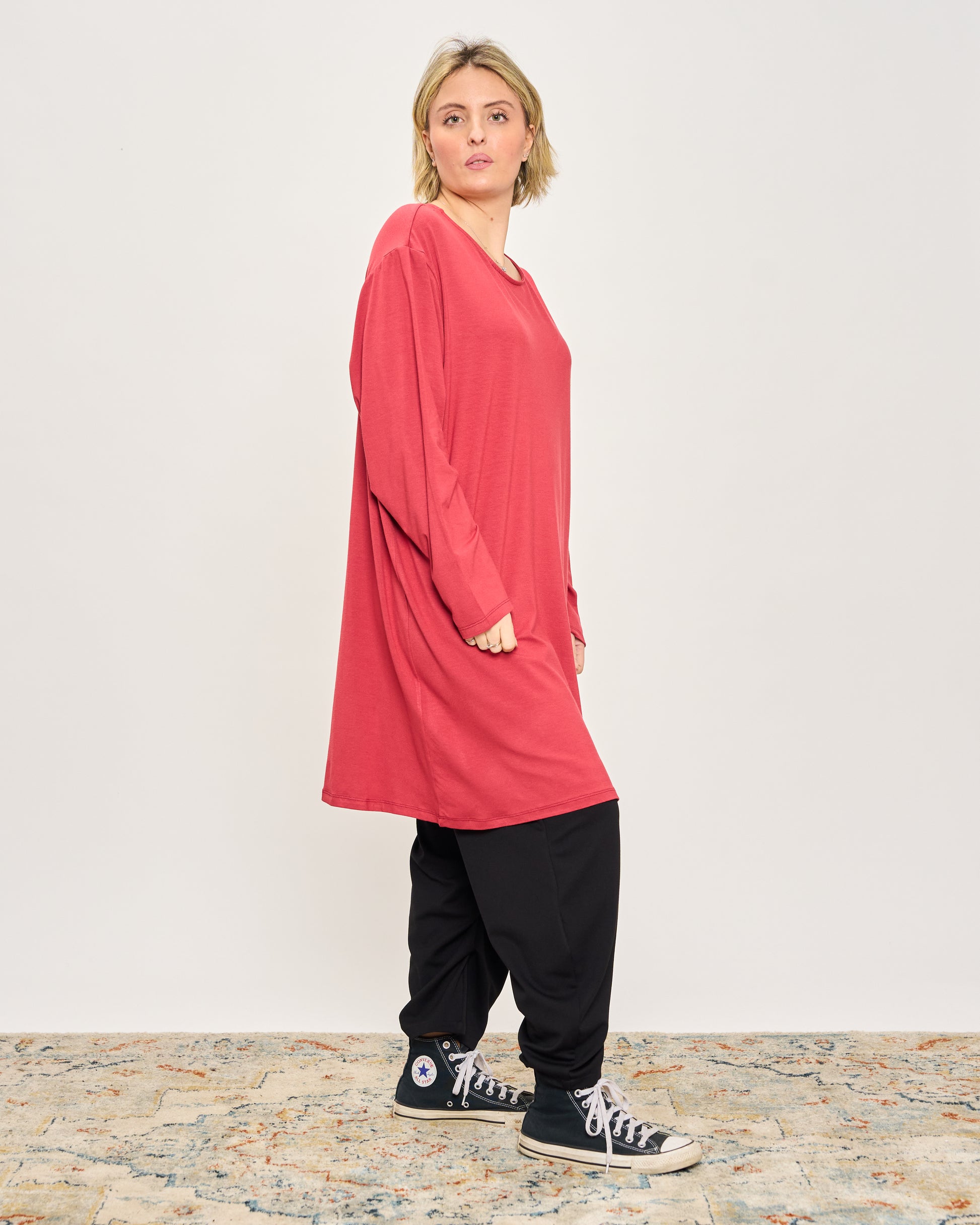 T-shirt oversize lunga in viscosa con scollo tondo e maniche lunghe.